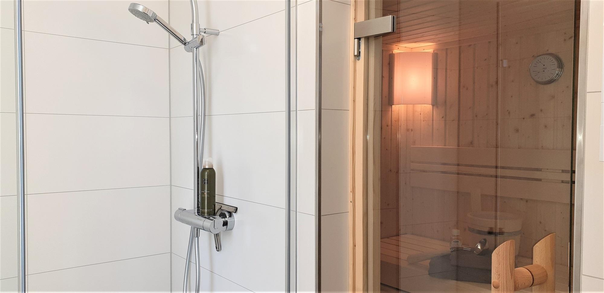 Das Erdgeschoss ist das Herz des Hauses. Von einer großen Küchenzeile, einer romantischen Couchecke vor dem Kamin bis hin zu einem großen Esstisch für 6 Personen, steht euch alles was das Herz begehrt zur Verfügung. Egal ob Kochabende, Gesellschaftsspiele (eine Auswahl an eigenen Favoriten vorhanden) oder einfach ein Wein vor dem Kamin, alles was uns glücklich macht, soll auch euch glücklich machen. Damit ihr auch im Winter warme Füße habt und nicht friert, ist im ganzen Haus eine Fußbodenheizung installiert. Im Hauswirtschaftsraum steht euch eine Waschmaschine, Wäschetrockner, Staubsauger, Bügelbrett, Bügeleisen etc. zur Verfügung. Zudem findet ihr im Erdgeschoss ein Gäste-WC mit Tageslicht, sowie einen kleinen "Wellness-Bereich" mit Sauna und Regendusche.
