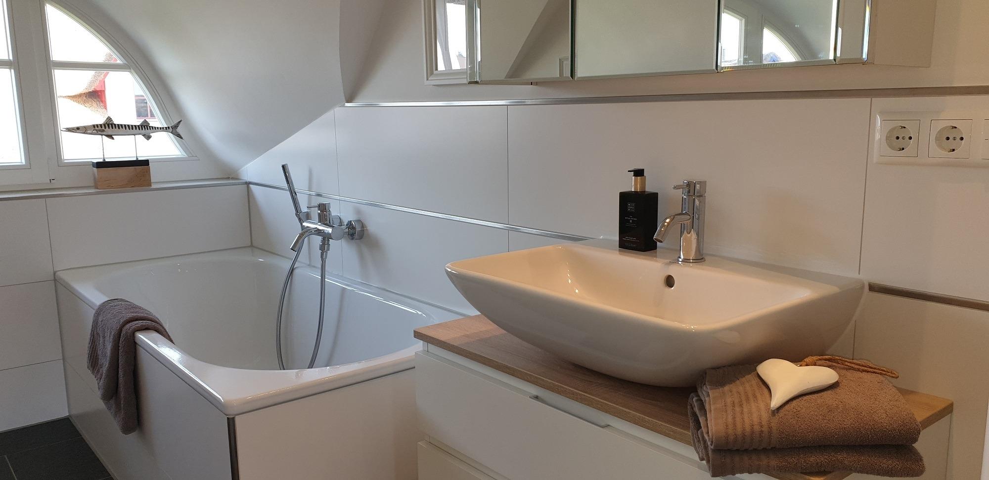 Unser Haus verfügt über zwei Schlafzimmer und einem großen Bad mir Fledermausgaube und Tageslicht im Obergeschoss. Eines der Zimmer hat ein großes gemütliches Doppelbett, genügend Stauraum für Kleidung und persönliche Dinge, sowie einen Balkon mit Blick auf die Ostsee. Hier kann man wunderschöne Sonnenuntergänge genießen und den Tag entspannt ausklingen lassen. Wer von den Sonnenstrahlen am Morgen geweckt werden möchte ist im zweiten Schlafzimmer bestens aufgehoben. Hier befinden sich zwei Einzelbetten und zusätzlich eine ausziehbare Schlafcouch für zwei Personen. Familien mit bis zu vier Kindern können es sich hier gemütlich machen.