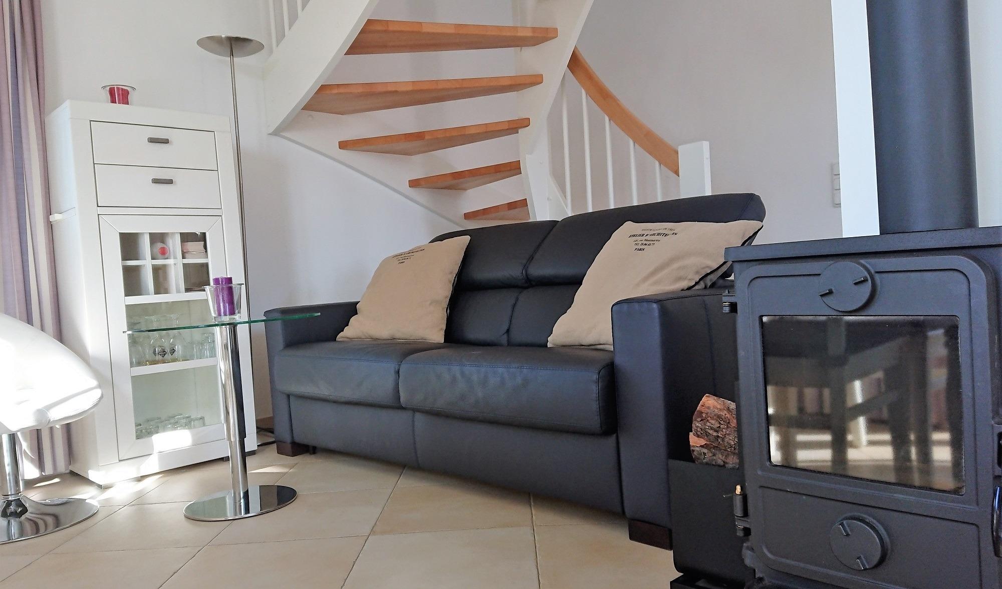 Im Erdgeschoss befindet sich der Wohn- Essbereich mit Kaminofen, gemütlicher Ledercouch (Schlafcouch 140x200 m für 5. [&] 6. Person) und Esstisch mit viel Platz.
