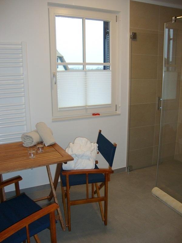 Sowie das große moderne Duschbad mit WC, Handtuchheizung, Fön und bodengleicher Dusche.