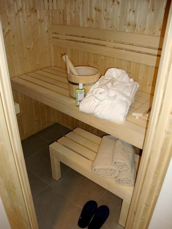 In der Sauna ist eine kleine Sitzgruppe - hier können Sie sich zwischendurch ausruhen. Ein Saunapaket (2 Saunatücher, 1 Duschtuch und Badelatschen) ist bei der Pauschale von 10 € p. Tag inklusive.