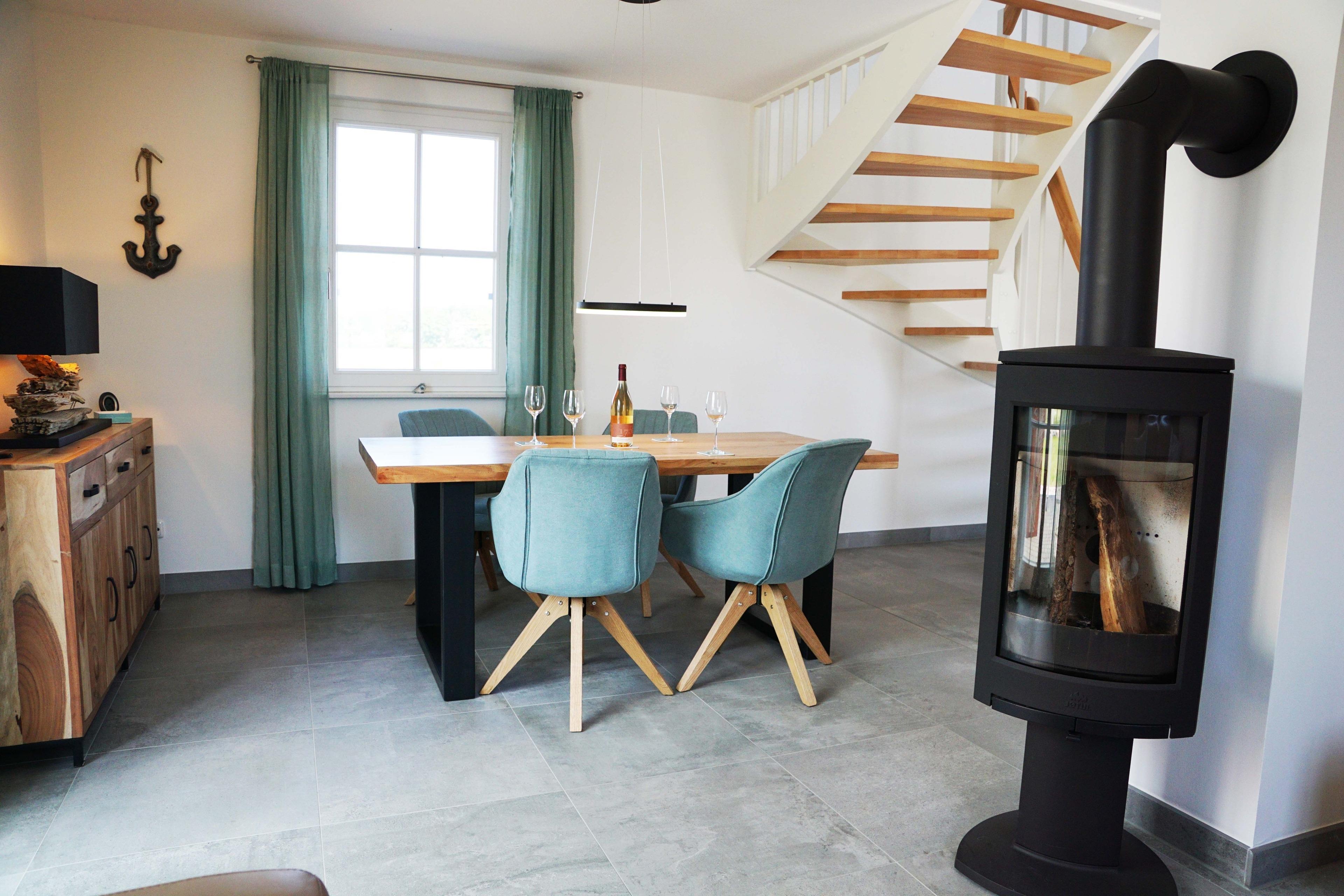 Im Erdgeschoss erwartet Sie das helle und geräumige Wohnzimmer. Es bildet eines von mehreren kommunikativen Oasen des Captains Hus. Es geht über in das gemütliche Esszimmer mit einem großen Esstisch (180x90). Dieser lädt Sie zum kulinarischen Genießen oder zum Spielen ein. Der drehbare norwegische Kaminofen bietet Ihnen bei kalter Witterung wohltuende Wärme und Wellness für die Seele. Die Küche im Erdgeschoss ist separat und sehr modern und komfortabel eingerichtet. Eine Waschmaschine, Mikrowelle, Geschirrspüler und viele weitere Extras sind hier integriert. Ein kleiner Tisch mit zwei Barhockern verführt Sie zum gemeinsamen Kochen bei einem guten Glas Wein und guten Gesprächen. Das helle Gäste-WC mit Tageslicht rundet das Erdgeschoss ab. Im Obergeschoss sind zwei Schlafzimmer und ein Duschbad farblich abgestimmt. Im ersten Schlafraum finden Sie ein Boxspringbett (200x180) und im zweiten zwei Einzelbetten (je 200x90). Beide Schlafräume bieten Ihnen viel Stauraum und Rückszugmöglichkeiten wie zum Beispiel eine alte Schulbank im zweiten Schlafraum.