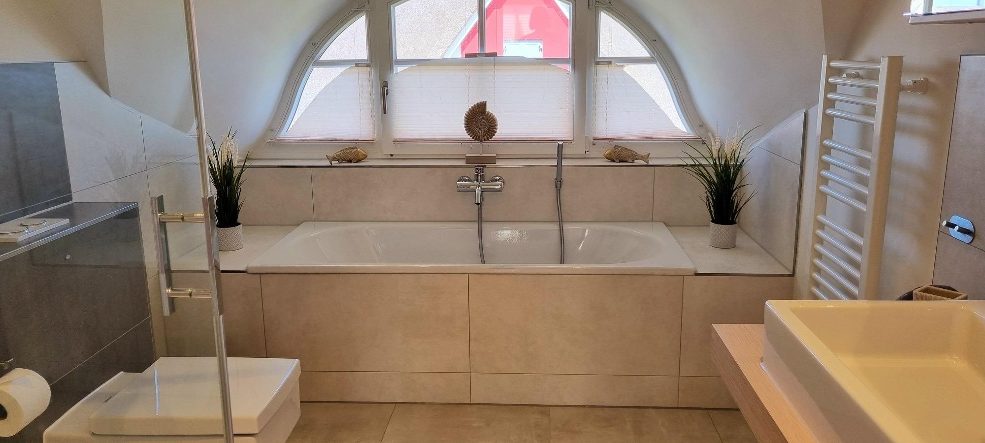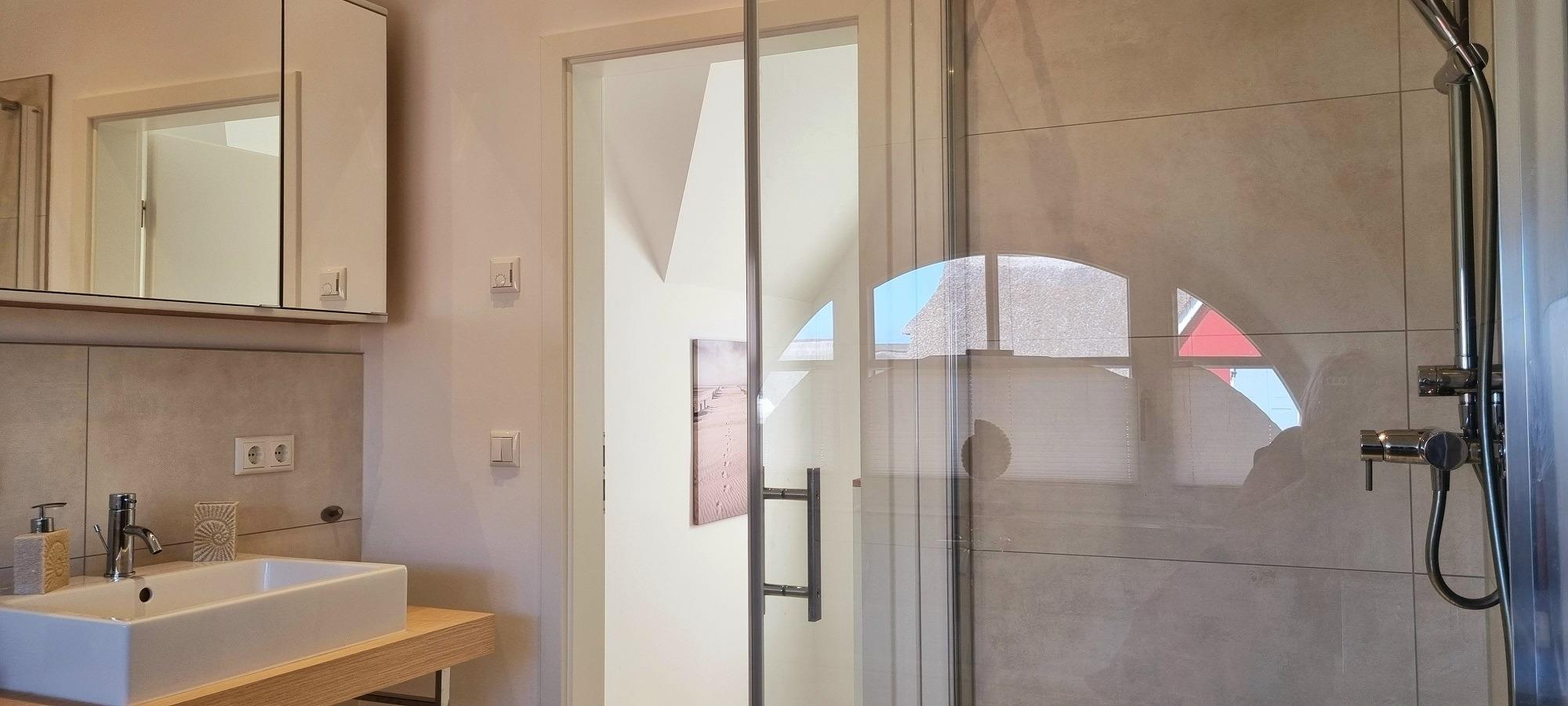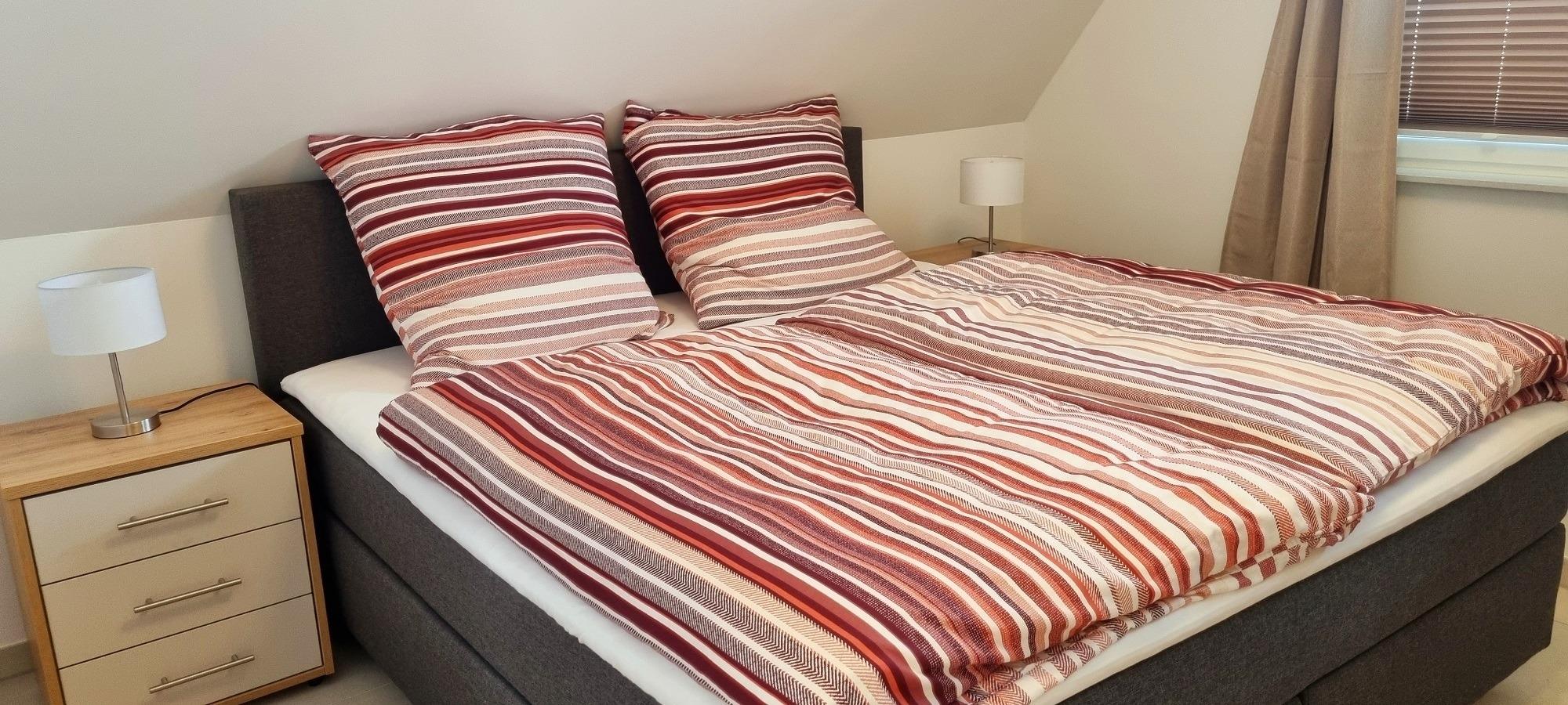Im Obergeschoß befinden sich 2 Schlafzimmer. Beide sind mit Boxspringbetten für jeweils 2 Personen und mit jeweils einen Wandschrank und Fernseher ausgestattet. Ein Badezimmer mit Wanne, Dusche, WC, Waschbecken, Spiegelschrank und Haartrockner steht zur Verfügung.