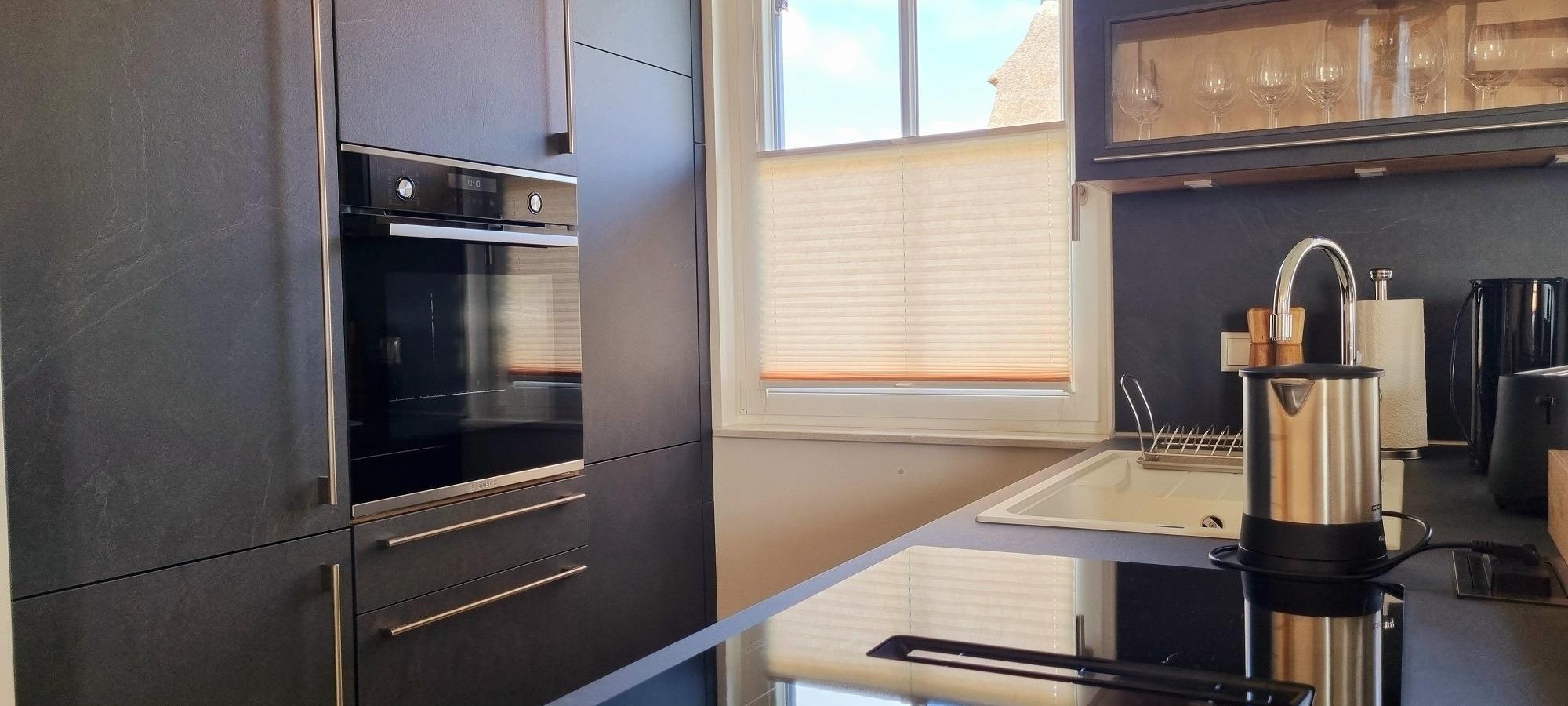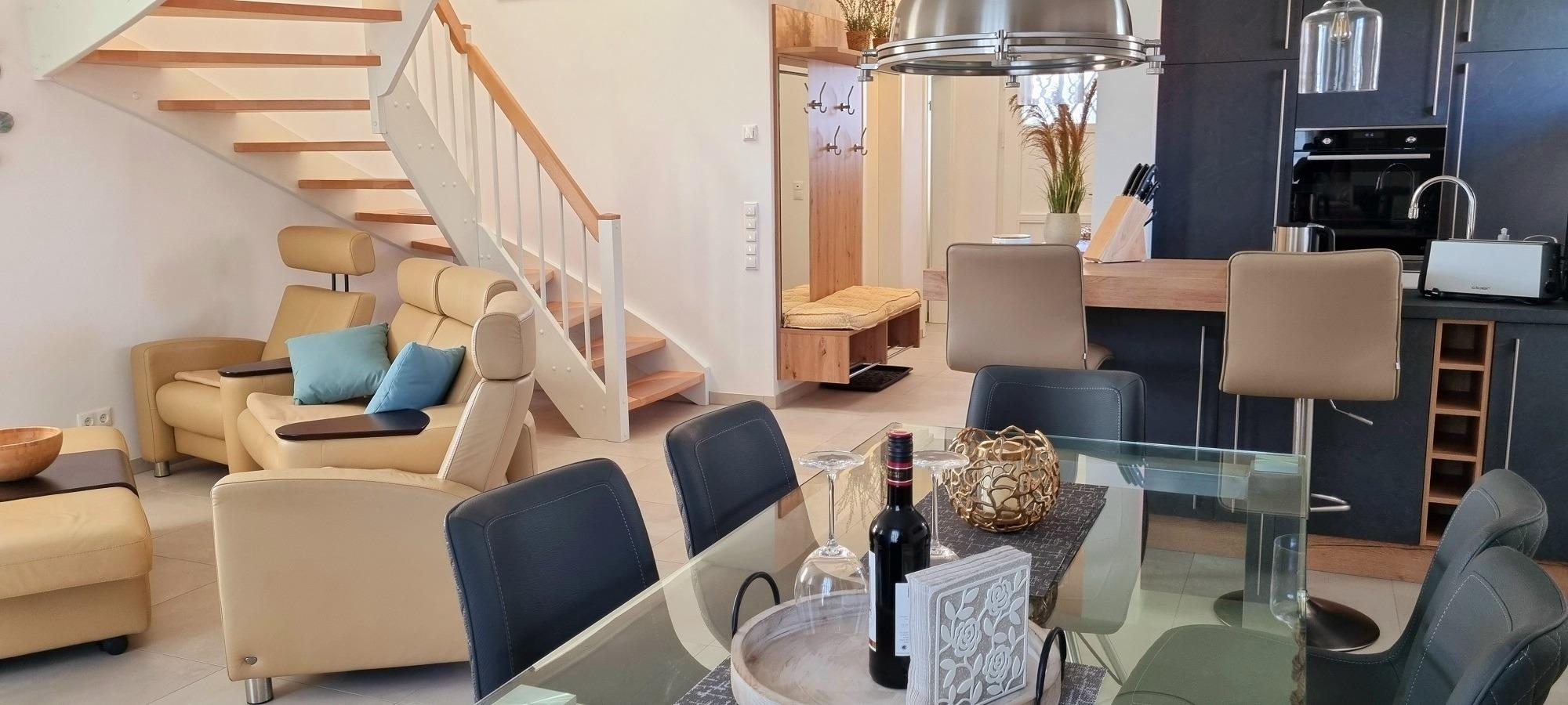 Eine offene Küche mit Theke, 2 Barhockern und einem Glastisch mit 6 komfortablen Stühlen bietet ausreichend Sitzgelegenheiten während der Mahlzeiten. Ein Induktionsherd mit integriertem Dunstabzug, ein Backofen, eine Kaffeemaschine, ein Wasserkocher, ein Eierkocher und sämtlicher Küchenzubehör bieten alle Annehmlichkeiten für gelungene Mahlzeiten. Ein Kühlschrank mit Tiefkühlfach und eine Geschirrspülmaschine sind ebenfalls vorhanden.