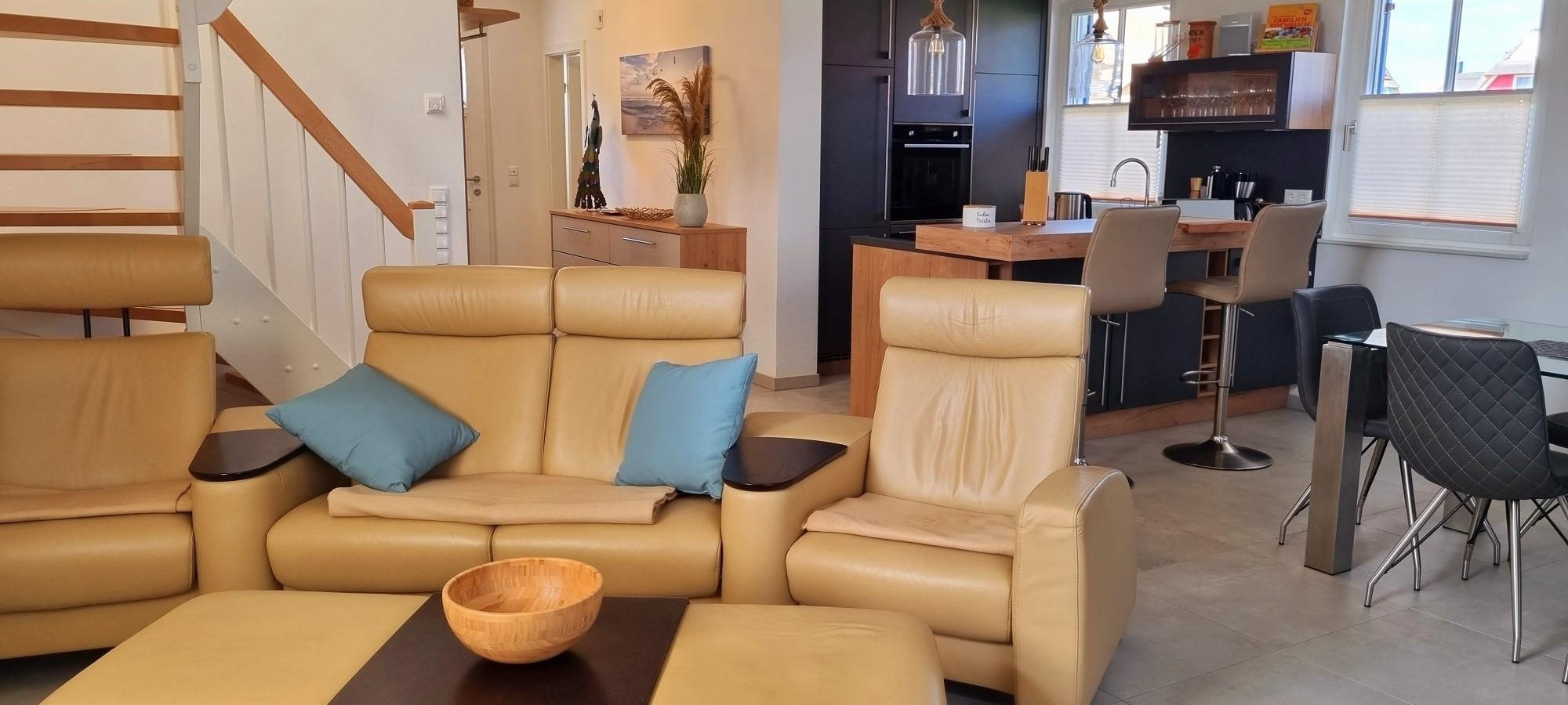 Die Fernsehecke mit Blu-Ray Player, Gesellschaftsspiele und eine Stressless Sitzecke lässt die Abende mit guter Laune ausklingen lassen.