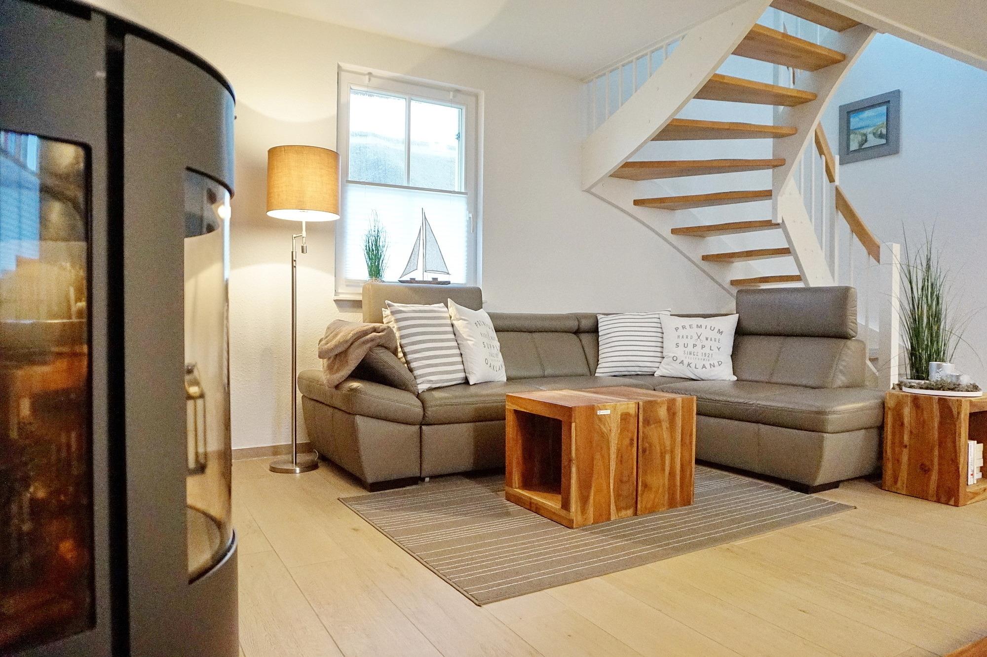 Es erwartet Sie eine hochwertige Innenausstattung mit Echtholzmöbeln. Das gesamte Haus ist gefliest und mit einer modernen Fußbodenheizung ausgestattet. Aufgrund des Kaminofens, der Sauna und der großen Wohnfläche ist das Haus ideal für einen Ganzjahresurlaub an der mecklenburgischen Ostsee geeignet. Im Erdgeschoss bietet das großzügige Wohnzimmer mit offener Küche und Essbereich ausreichend Platz und Komfort für die ganze Familie. Die integrierte Küche ist voll ausgestattet und beinhaltet einen Backofen mit Cerankochfeld, einen Kühlschrank mit Gefrierfach, einen Geschirrspüler, Kaffeemaschine, Toaster und einen Wasserkocher. Ein Flach-TV und Stereoanlage/DVD-Player bieten Unterhaltung. Im Wohnbereich steht ein Kaminofen, der wohlige Wärme in den kalten Jahreszeiten schenkt. Kaminholz ist vorhanden. Der Essbereich bietet Platz für 5 Personen. Für die kleinen Gäste steht ein Kinderhochstuhl, Babybadewanne und auf Anfrage ein Kinderreisebett zur Verfügung. Weiterhin befinden sich im EG ein Gäste WC, eine Sauna mit Komfortdusche und ein Hauswirtschaftsraum mit Waschmaschine, Bügelbrett und Bügeleisen, Staubsauger etc..