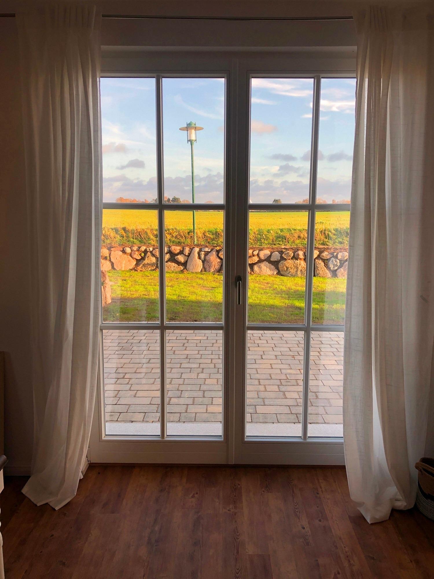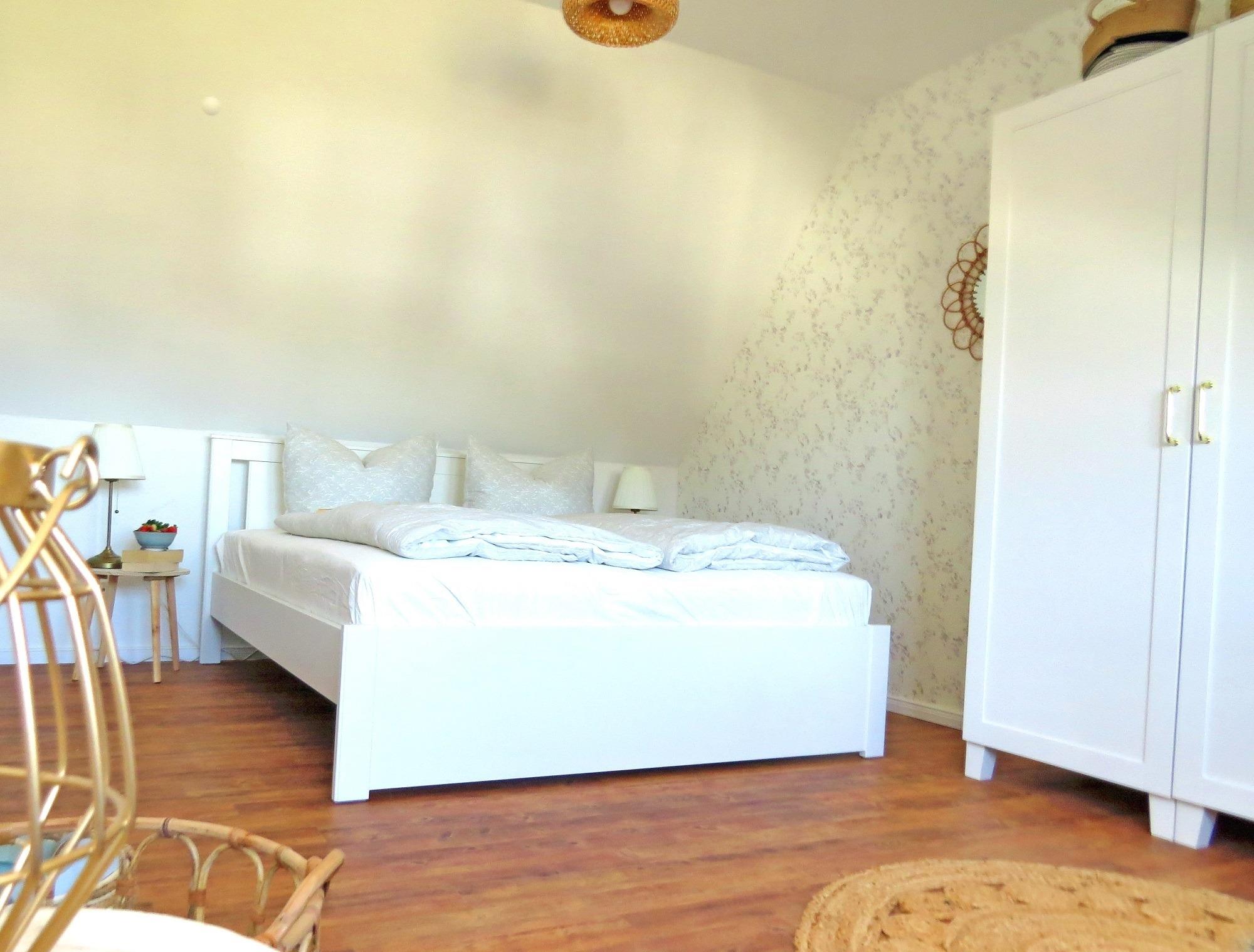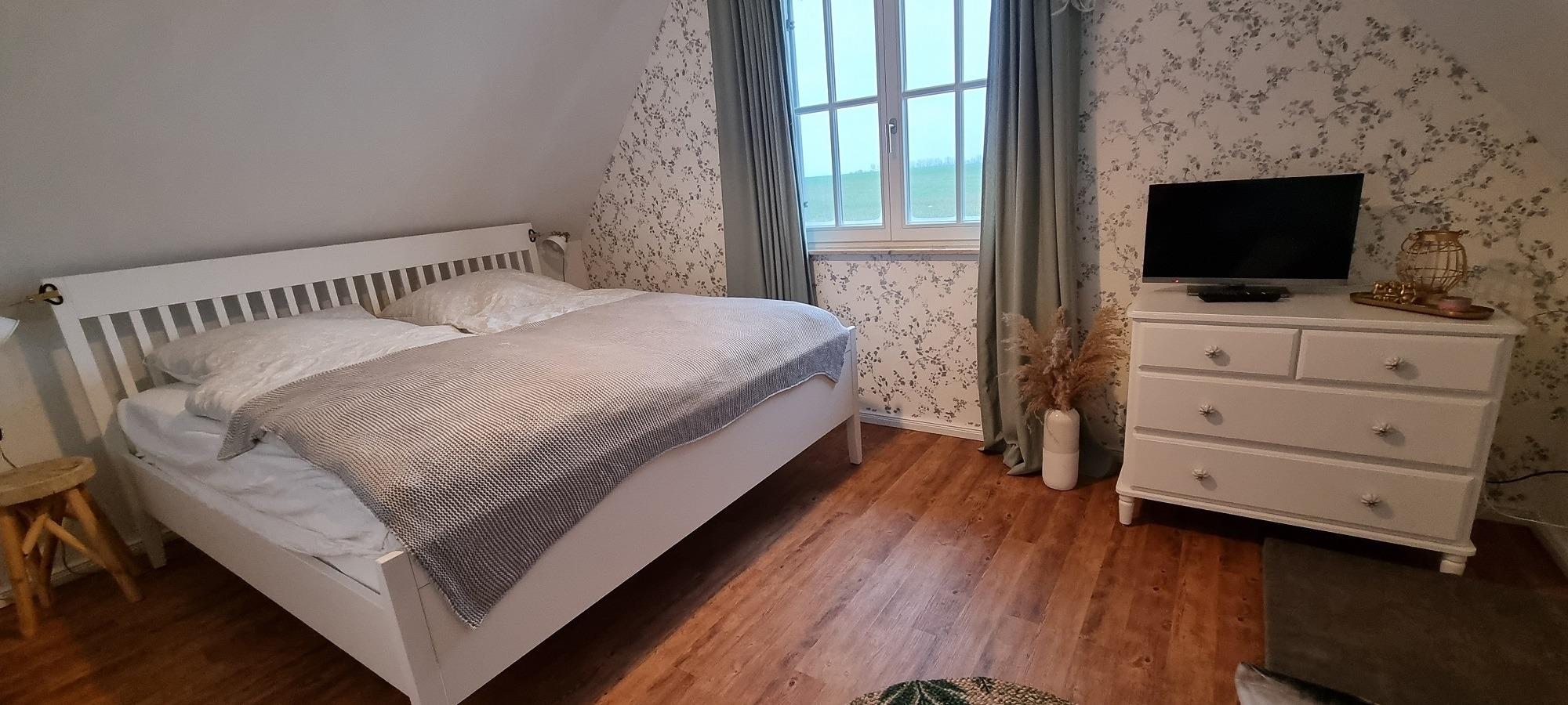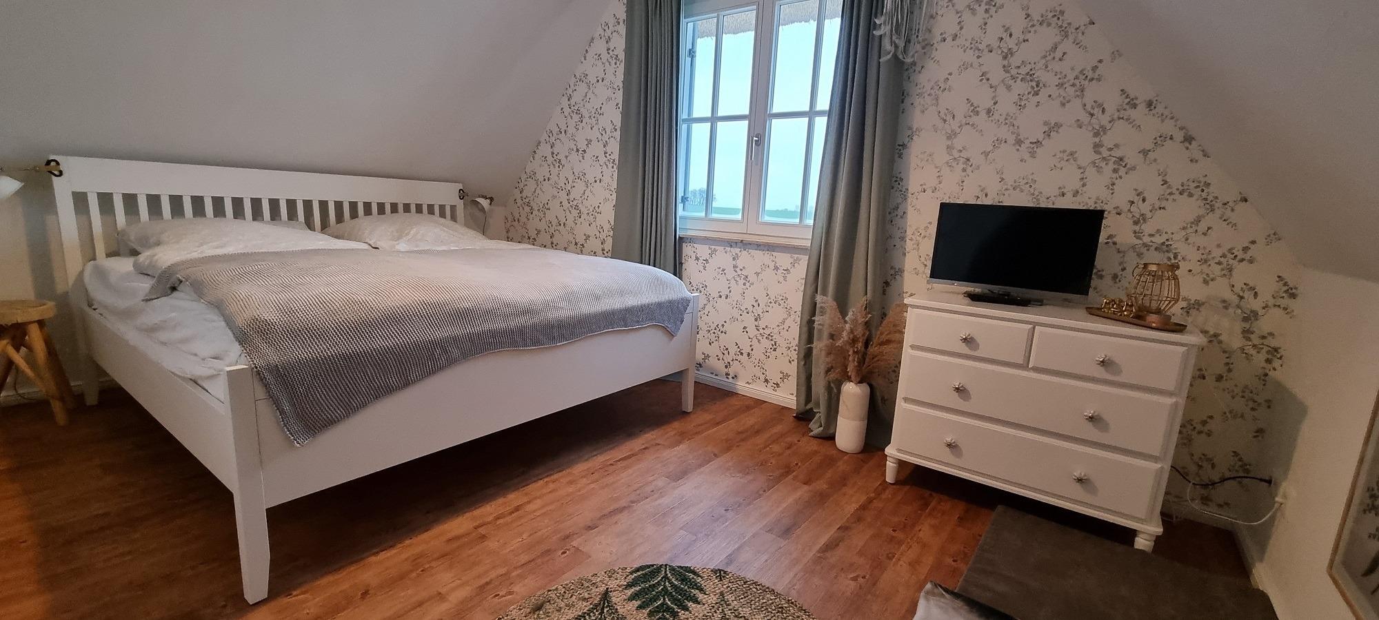 Vom rechten Schlafzimmer aus haben Sie einen wundervollen Blick über die Wiesen und Felder bis hin zur Ostsee. Es ist mit einem Doppelbett, 2. TV und zwei Kommoden ausgestattet.