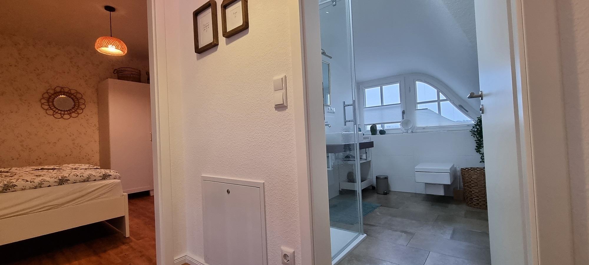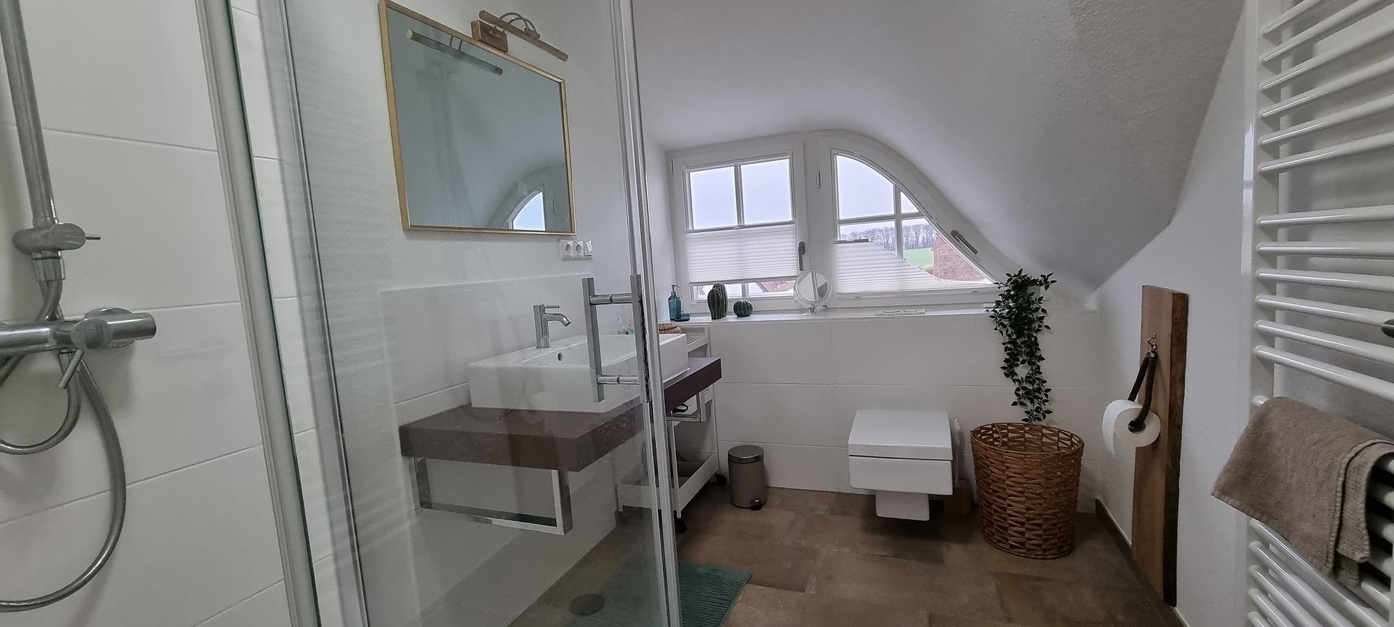 Im Obergeschoss befinden sich die beiden Schlafzimmer und das moderne Duschbad mit bodentiefer Dusche.
