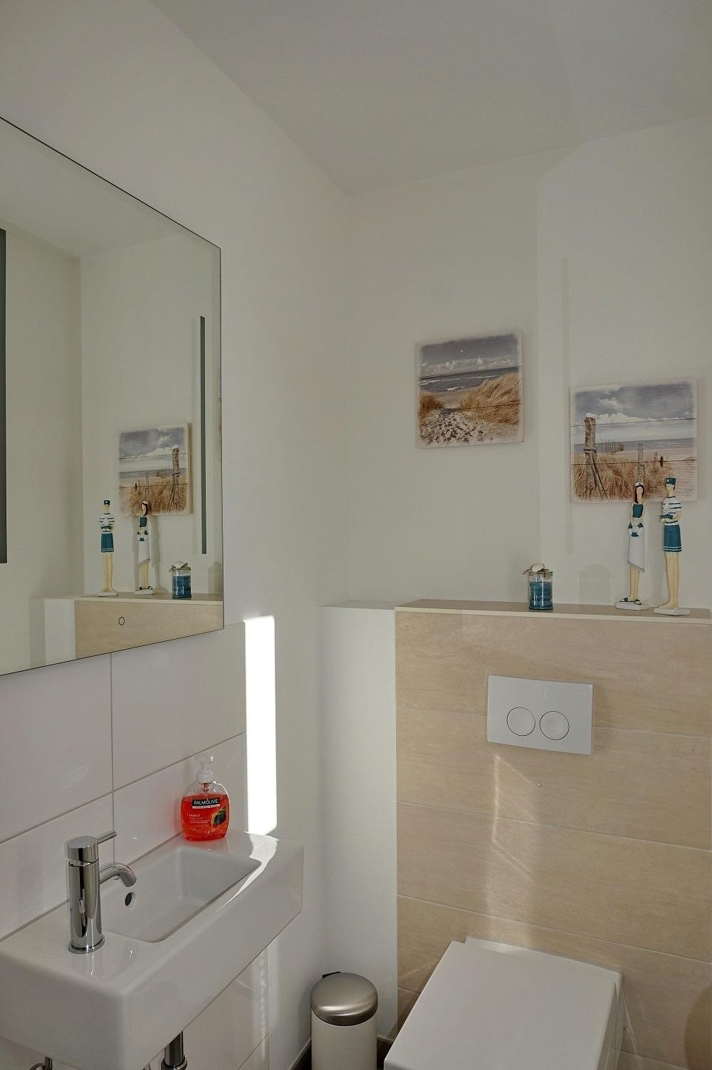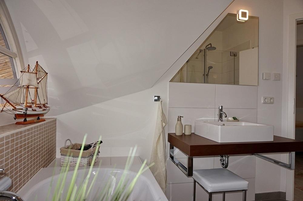Im Obergeschoss befinden sich die beiden liebevoll eingerichteten Kinderzimmer mit je einem Einzelbett und Kommode sowie das Elternschlafzimmer mit einem Doppelbett, 2. TV, Schrank und Kommode. In den Schlafzimmerfenster sind Fliegenschutzgitter eingebaut, somit können Sie auch in den Sommermonaten die Fenster beim Schlafen offen lassen. Ihr Urlaub beginnt sofort - Bettwäsche ist bei Anreise bereits bezogen und im Preis inbegriffen. Das Vollbad unter der charakteristischen Fledermausgaube ist sehr modern eingerichtet und bietet mit Badewanne, Dusche, Waschbecken, Handtuchhalter und Föhn die gewissen Extras. Die überdachte Nord-Westterrasse ist mit Gartenmöbeln und Sonnenliegen möbliert und lädt zum Frühstücken in der Sonnen und Entspannen am Nachmittag ein. Auch bei einer kleinen Brise können Sie im hauseigenen Strandkorb die Sonne genießen. Ein feststehender Grill lädt zu netten Grillabende ein. Der Naturstrand ist in ca. 500 m zu erreichen.