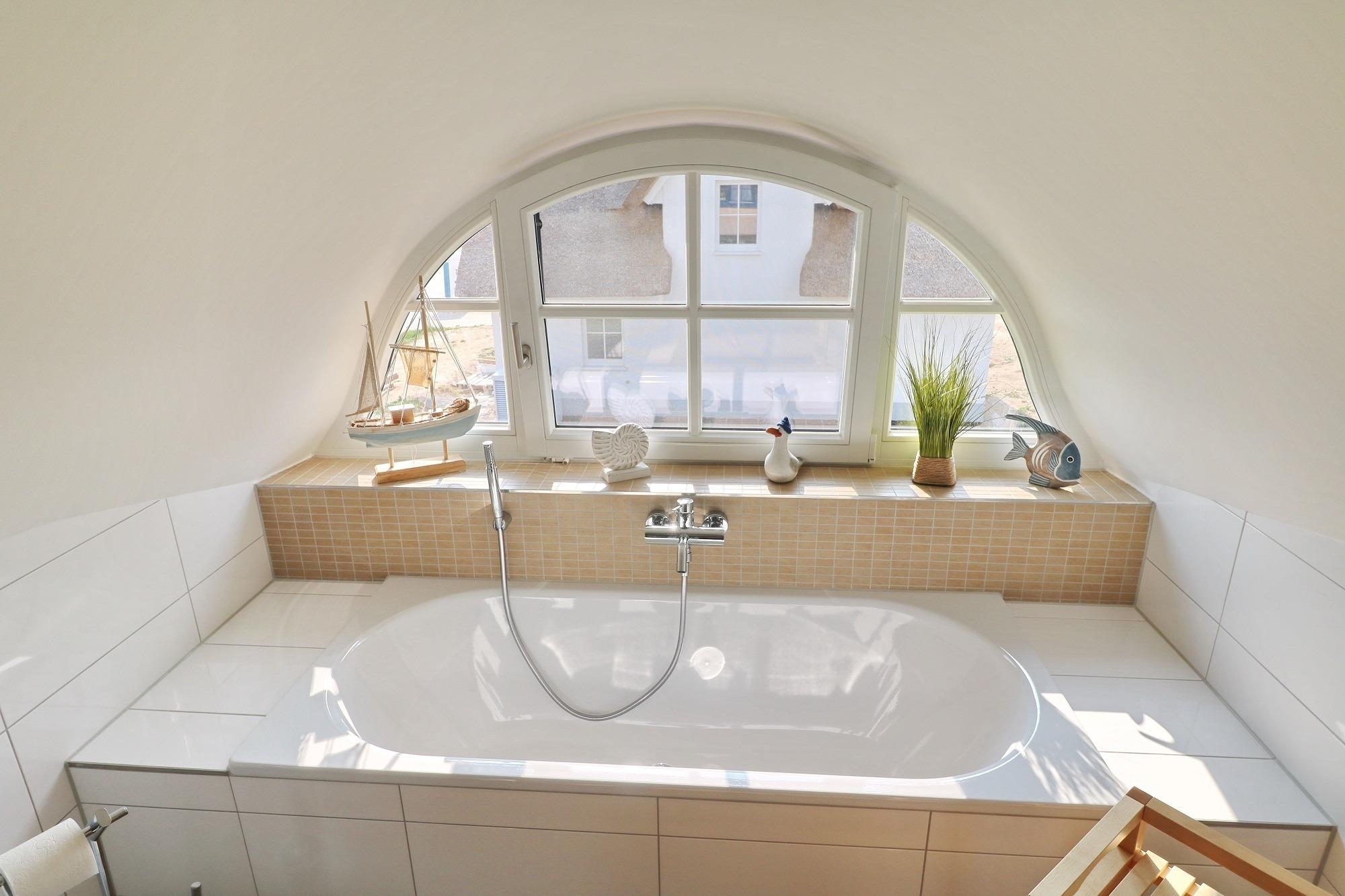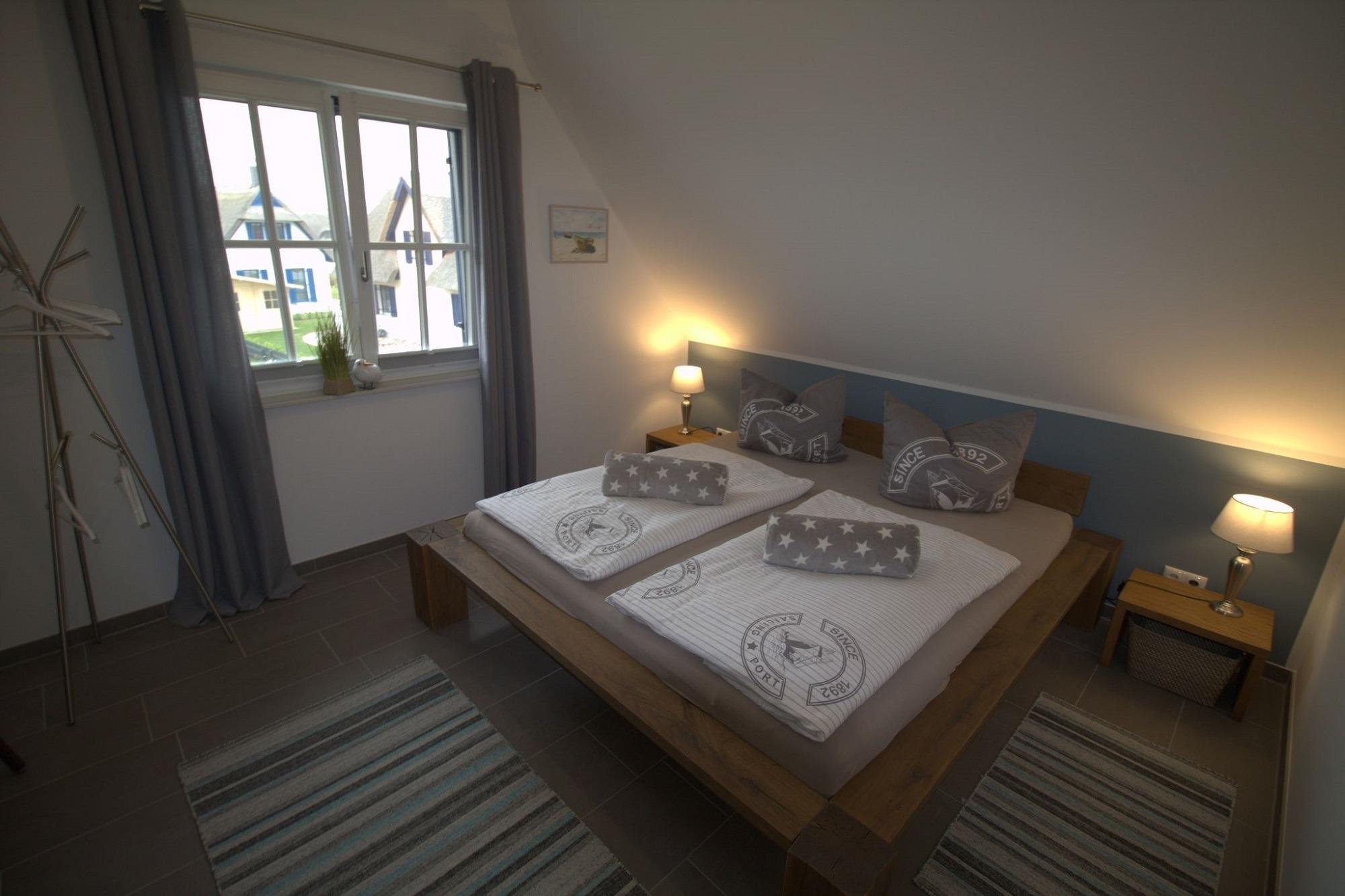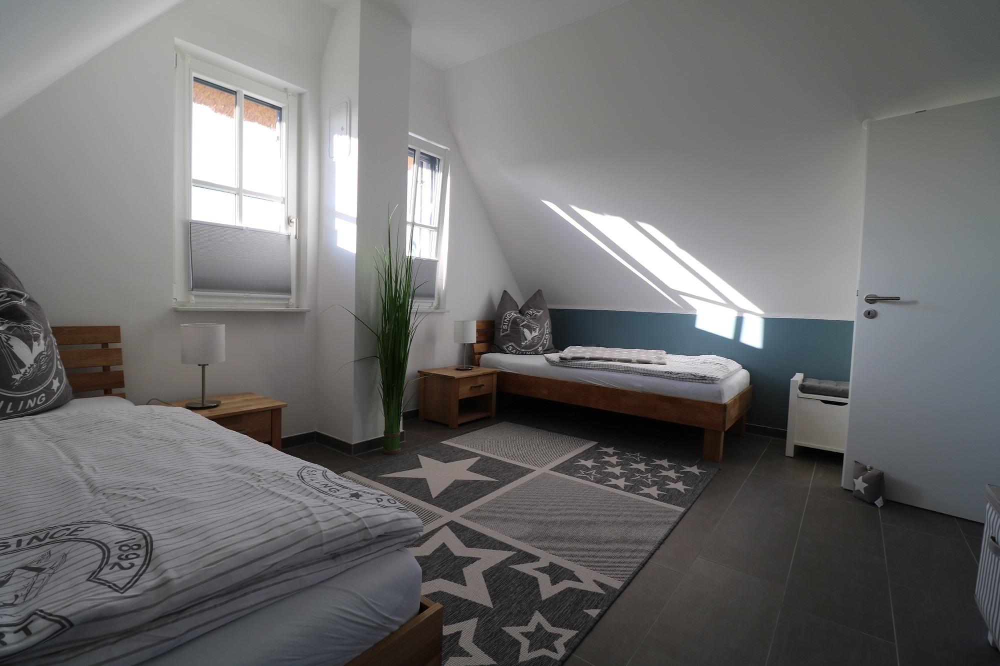 Im Obergeschoss befindet sich das Vollbad mit typischer Fledermausgaube und zwei Schlafzimmern. Im Elternschlafzimmer steht ein Doppelbett, sowie eine große Kommode und ein Garderobenständer zur Verfügung. Von hier aus haben Sie einen schönen Blick über das Reethausgebiet bis hin zur Insel Poel und der Ostseeküste. Im Kinderschlafzimmer stehen zwei Einzelbetten, eine Kommode, ein 2. TV, eine Sitztruhe und ein Regal. So haben Ihre Kinder viel Platz um Ihre Ferien an der Ostsee zu genießen. Alle Schlafräume, die Badezimmer und eine Terrassentür im Wohnzimmer sind mit Fliegengitter ausgestattet. Auf der möblierten Südterrasse stehen Gartenmöbel, 2 Sonnenliegen und ein sehr gemütlicher XL-Strandkorb bereit und laden zum Verweilen und Entspannen ein.