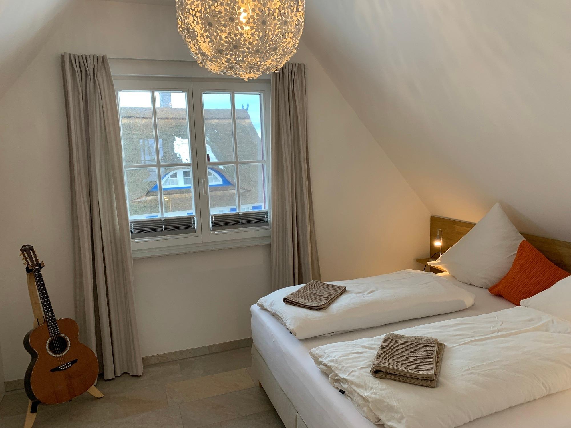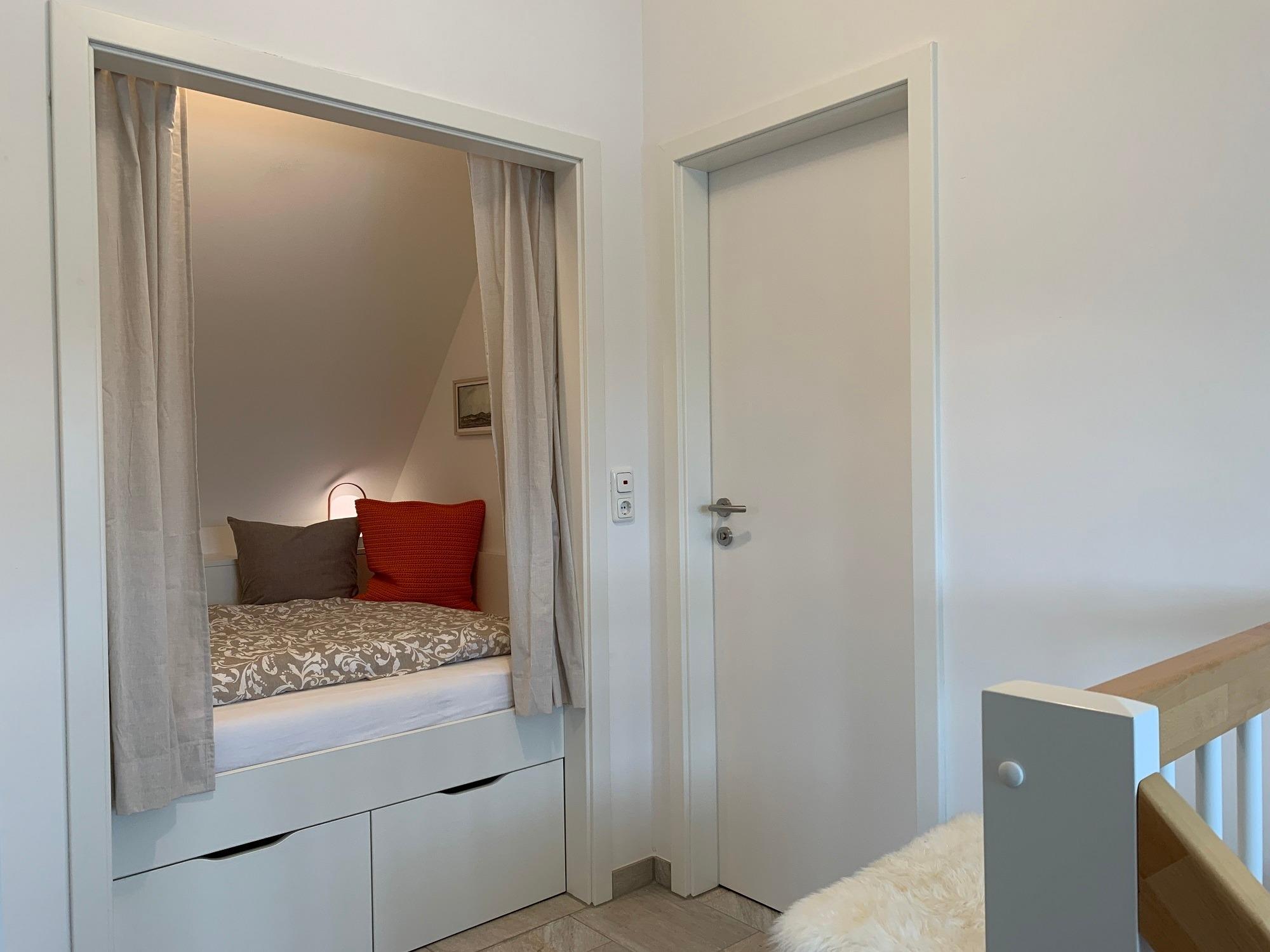 Im Obergeschoss verbringen Sie im Schlafzimmer mit Doppel-Boxspringbett unter dem „atmenden Reetdach“ erholsame Nächte und finden in der kuscheligen Lounge-Koje weitere Ruhe- bzw. Schlaf-Möglichkeiten. Ein großzügiges Vollbad mit Dusche und einer Badewanne mit Blick auf das Reetdachdorf De Poeler Drift komplettiert das Wellness Vergnügen. Die Zimmer bieten durch maßgefertigte Einbaumöbel ausreichend Stauraum für persönliche Dinge und können durch Plissees, Vorhänge und Fensterläden abgedunkelt werden.