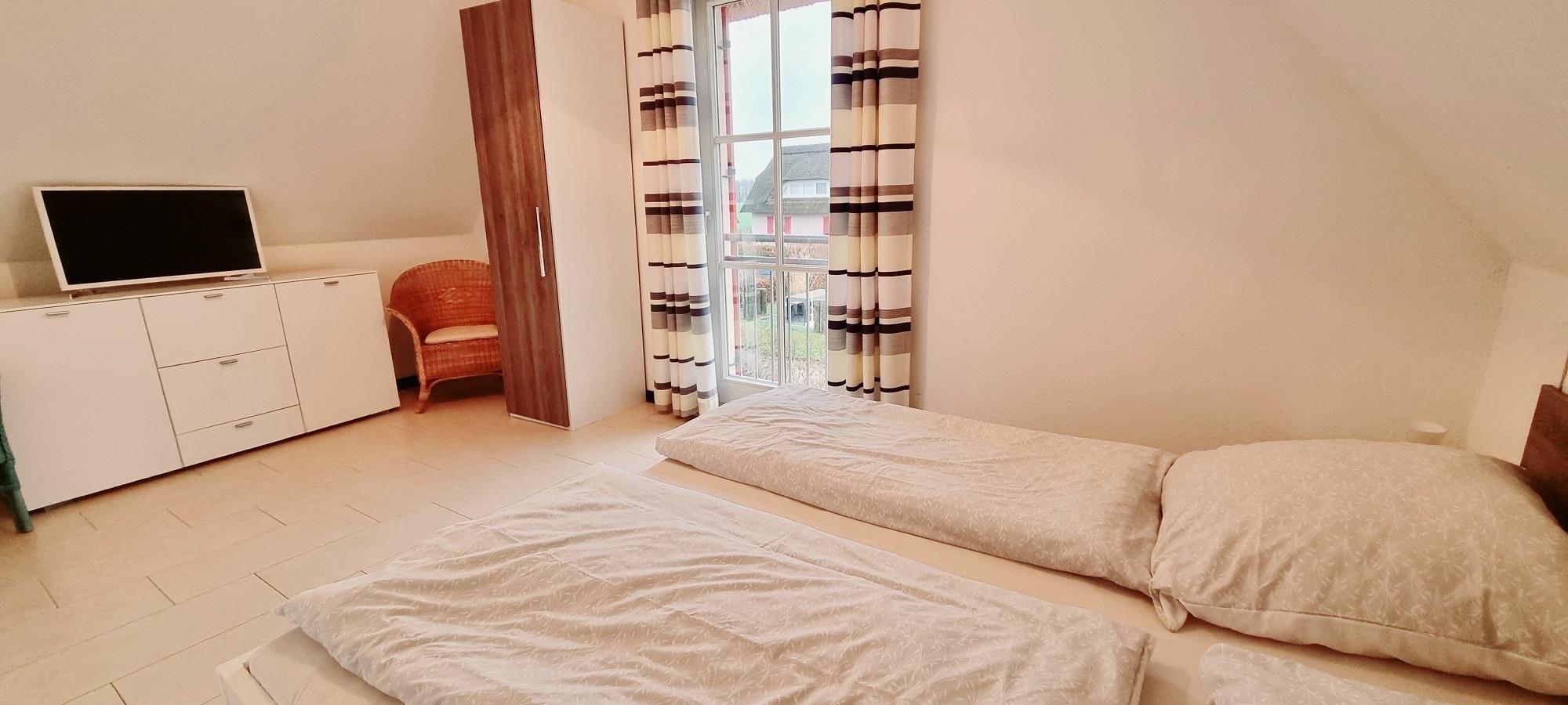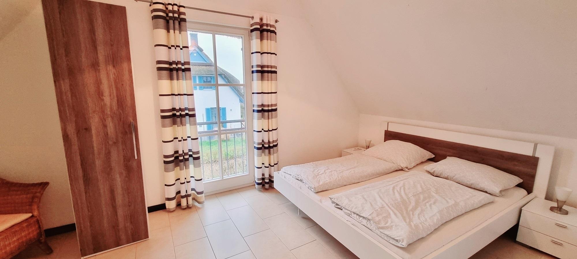 Im Obergeschoss befindet sich das Elternschlafzimmer mit Doppelbett und das Vollbad mit Badewanne, Dusche und der Sauna.