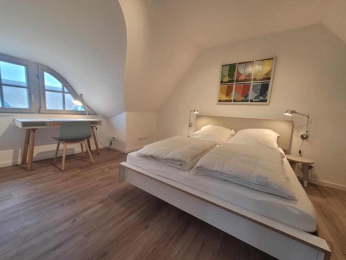 Im Obergeschoss befinden sich zwei große Schlafzimmer mit je einem Doppelbett. In einem Schlafzimmer befindet sich ein Schreibtisch für mobiles Arbeiten. Alle Schlafzimmer sowie das Gästezimmer lassen sich verdunkeln.