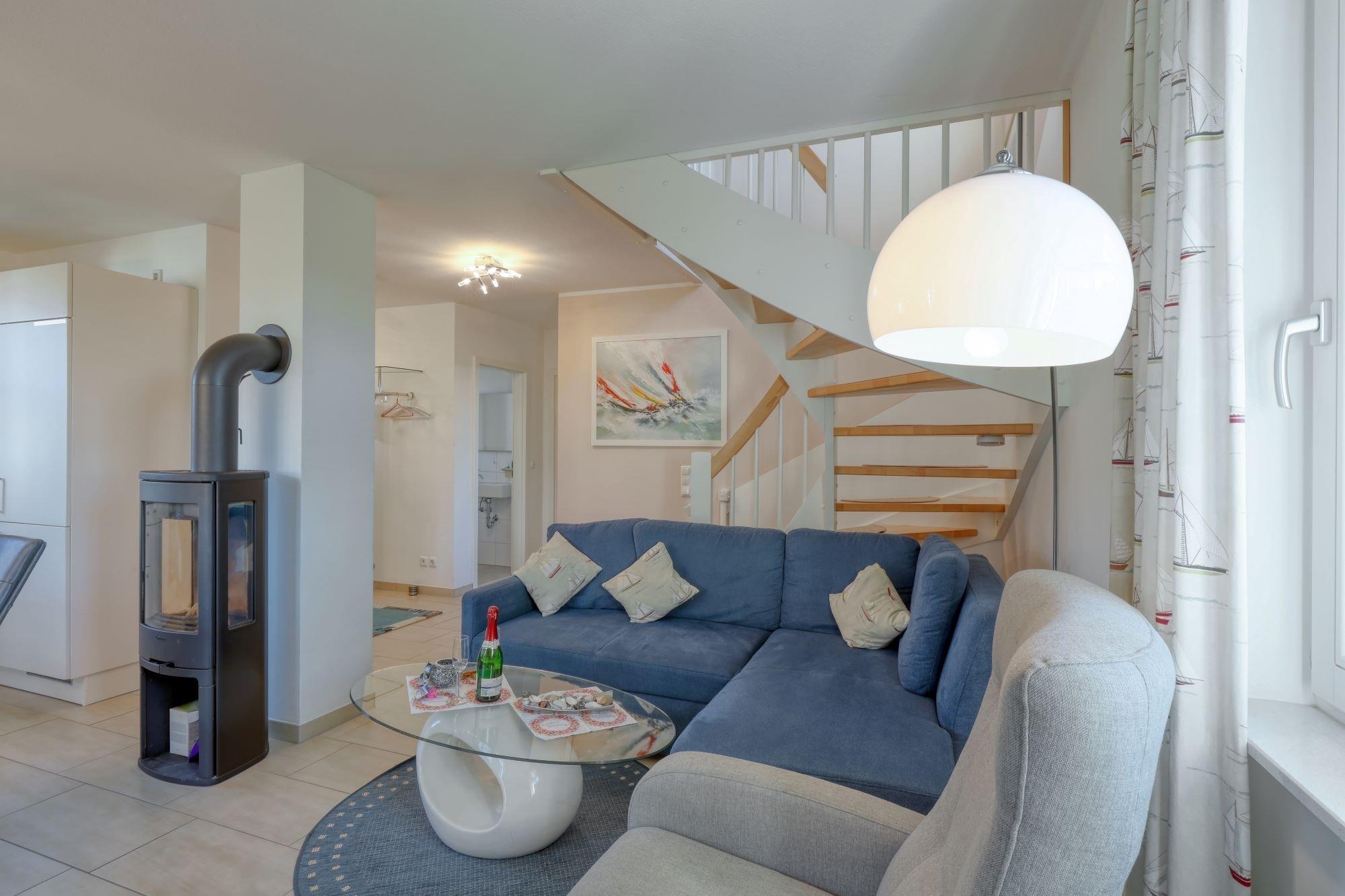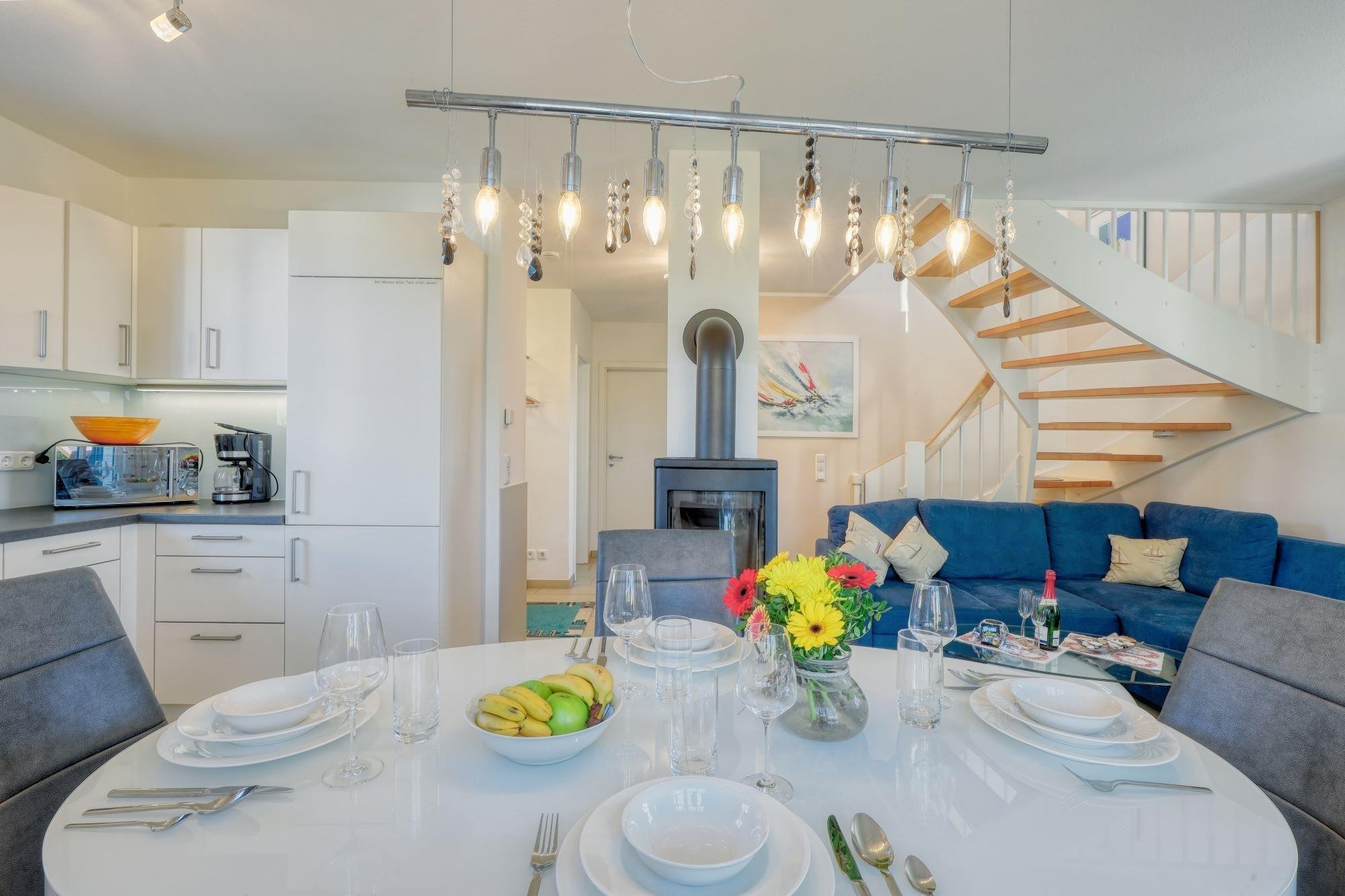 Im Erdgeschoss befindet sich der Wohnbereich mit Esstisch für 4 Personen, eine integrierte moderne vollausgestattete Küchenzeile,