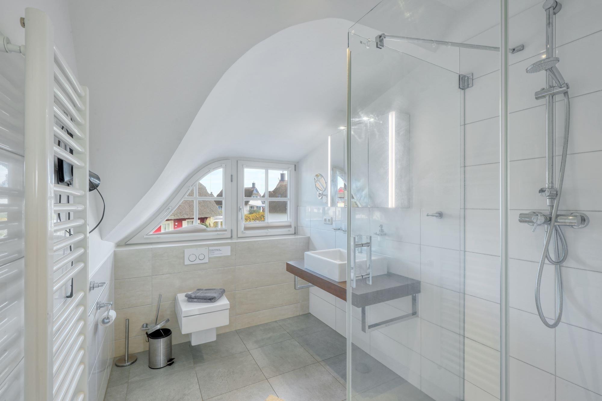 Dazwischen das Badezimmer mit Schwall- Dusche und WC.