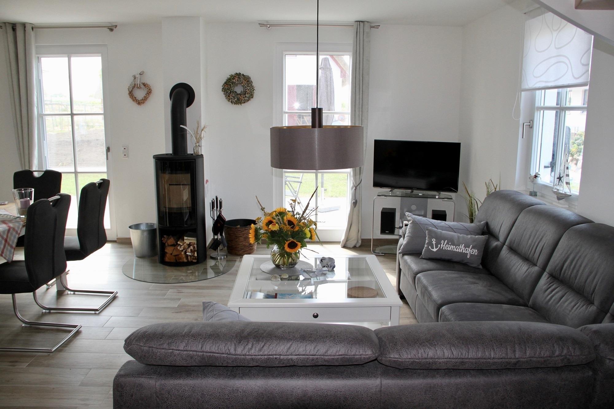 Unsere „Möwe Emma“ bietet weiterhin eine stilvolle gemütliche Innenausstattung. Ob am Esstisch oder im Bereich der gemütlichen Sitzecke kann man entweder vor dem Kamin entspannen, in den vorhandenen Büchern und Zeitschriften schmökern, oder sich diversen Brett- und Kartenspielen hingeben. Für Fernsehfreaks oder Musikliebhaber stehen ein hochwertiger Fernseher mit WLAN-Funktion, DVD-/Blu-Ray-Player sowie eine Stereoanlage mit Bluetooth-Funktion zur Verfügung. Eine kleine DVD-Sammlung ist vorhanden.