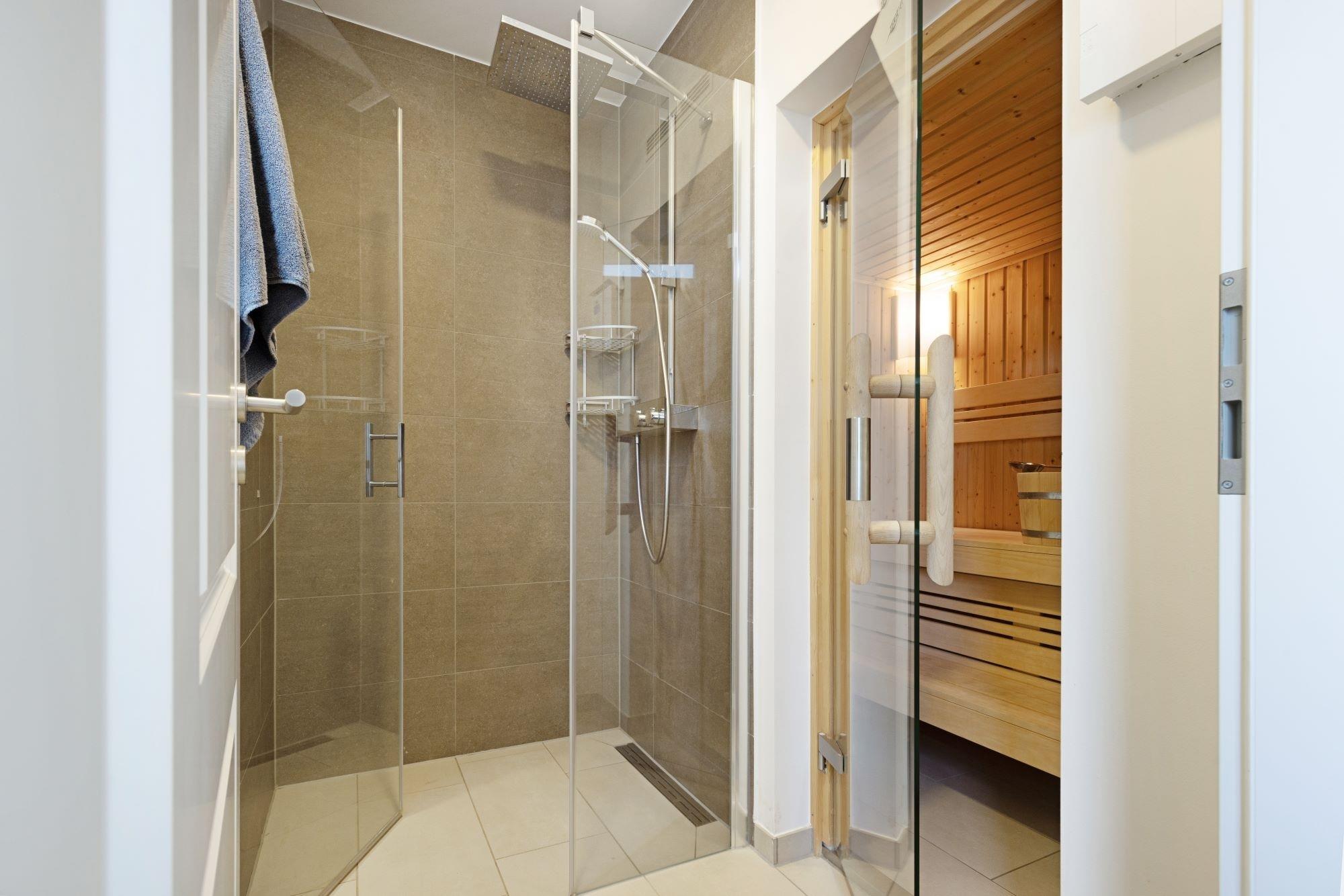 Die bodengleiche Wellnessdusche ist im Saunabereich integriert. Ein Gäste-WC und der HWR mit Waschmaschine, Trockner und Haushaltsartikeln runden das Angebot im Erdgeschoss ab.