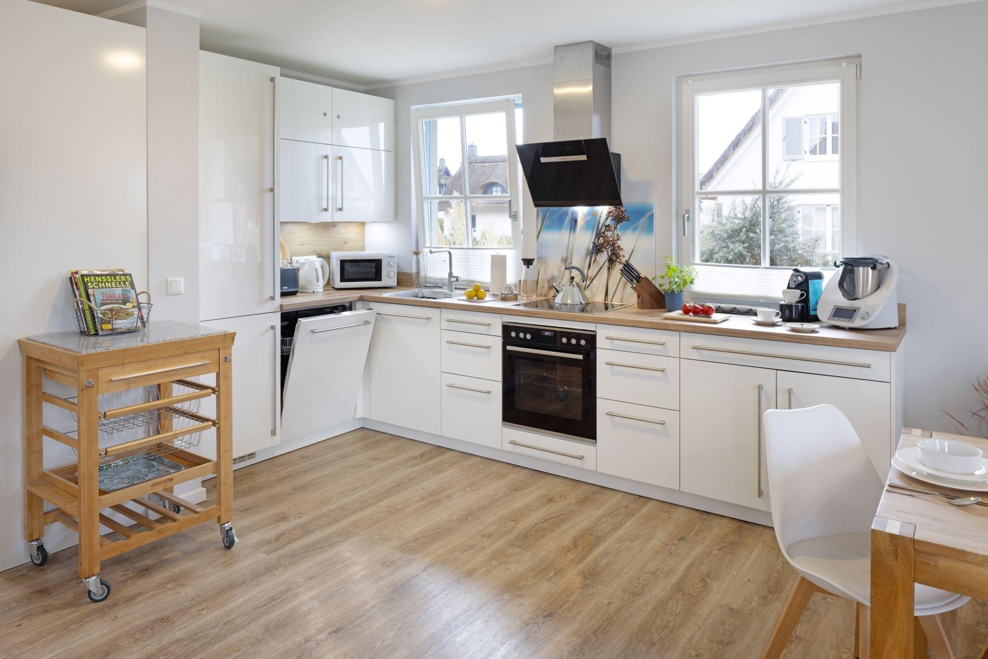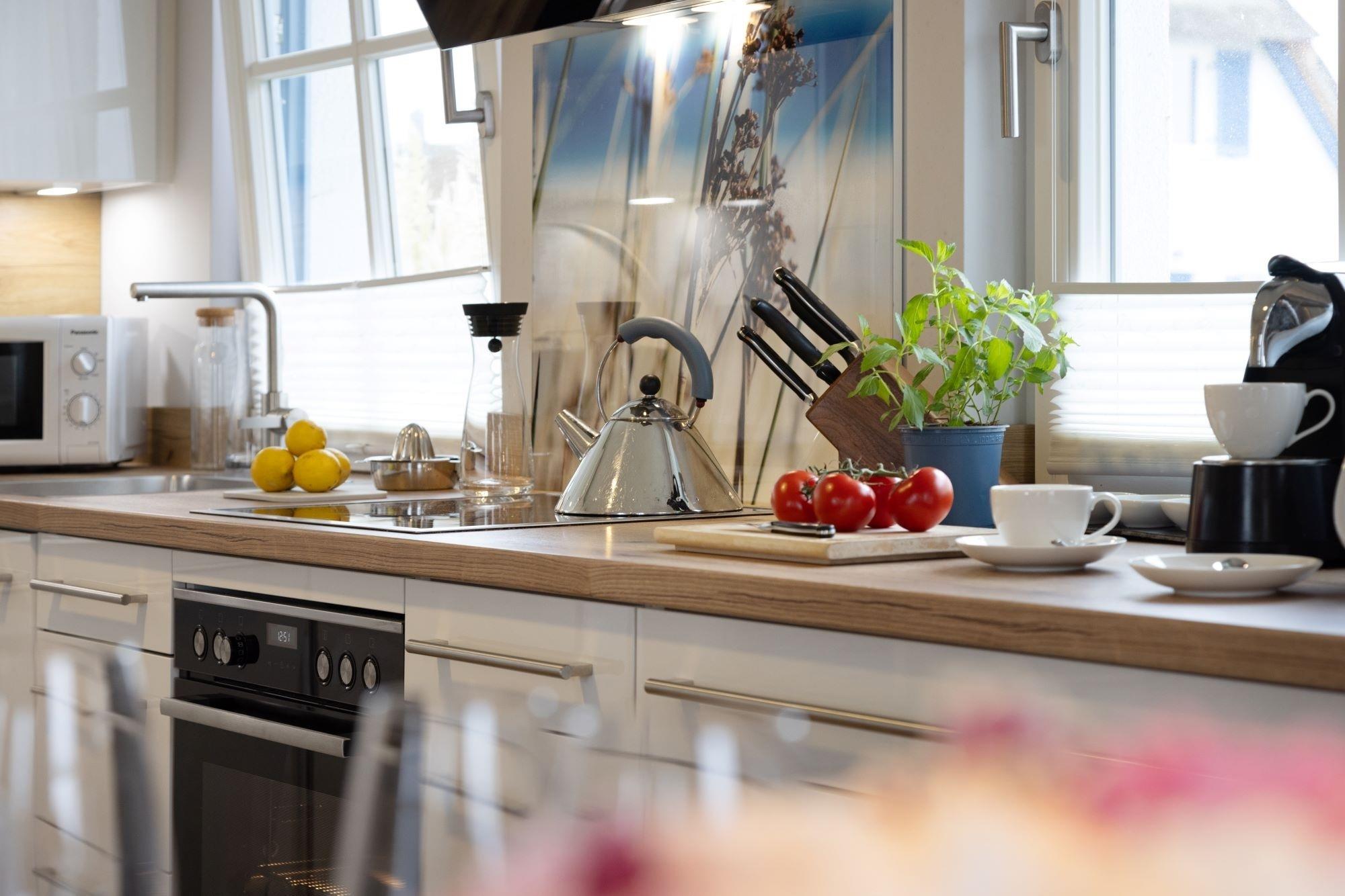 Insbesondere die Wohnküche ist mit hochwertigen Design-Markengeräten ausgestattet. Kleine Highlights sind z.B. der separate 60l-Gefrierschrank, die zusätzliche Mikrowelle, eine Nespresso-Kapselmachine als Ergänzung zur Filter-Kaffeemaschine sowie ein elektrischer Milchschaumbereiter.