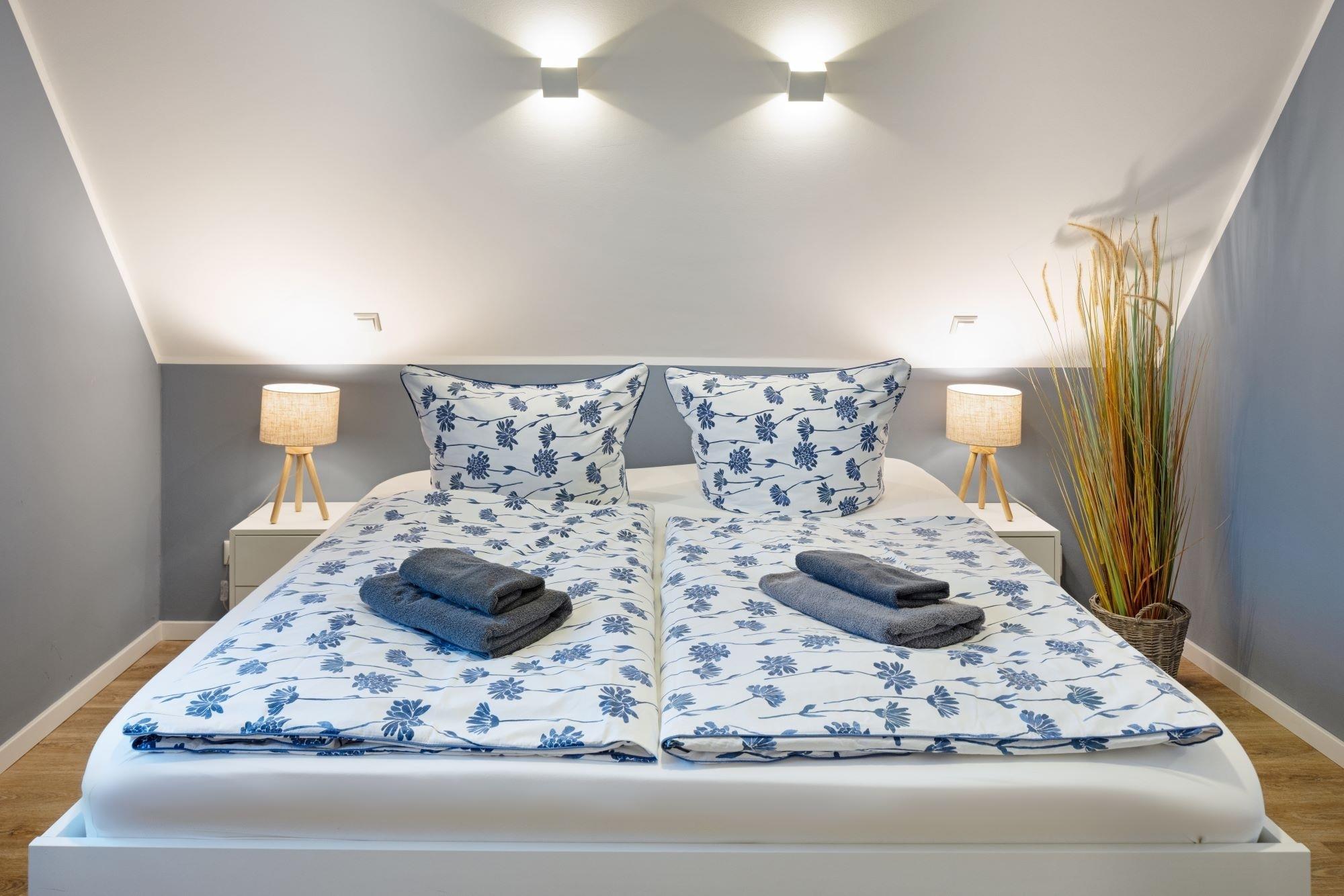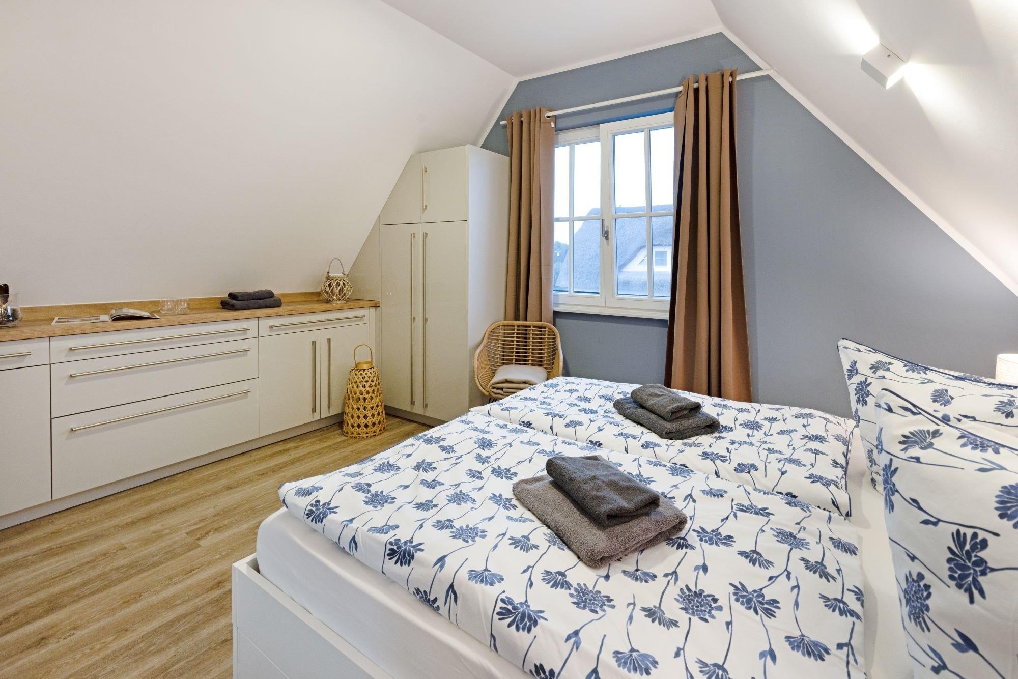 Die Schlafzimmer sind mit je einem Doppelbett (davon ein ausziehbares Einzelbett max. 170x200) sowie ausreichend Stauraum in Form von maßgefertigten Kommoden und Einbauschränken ausgestattet.