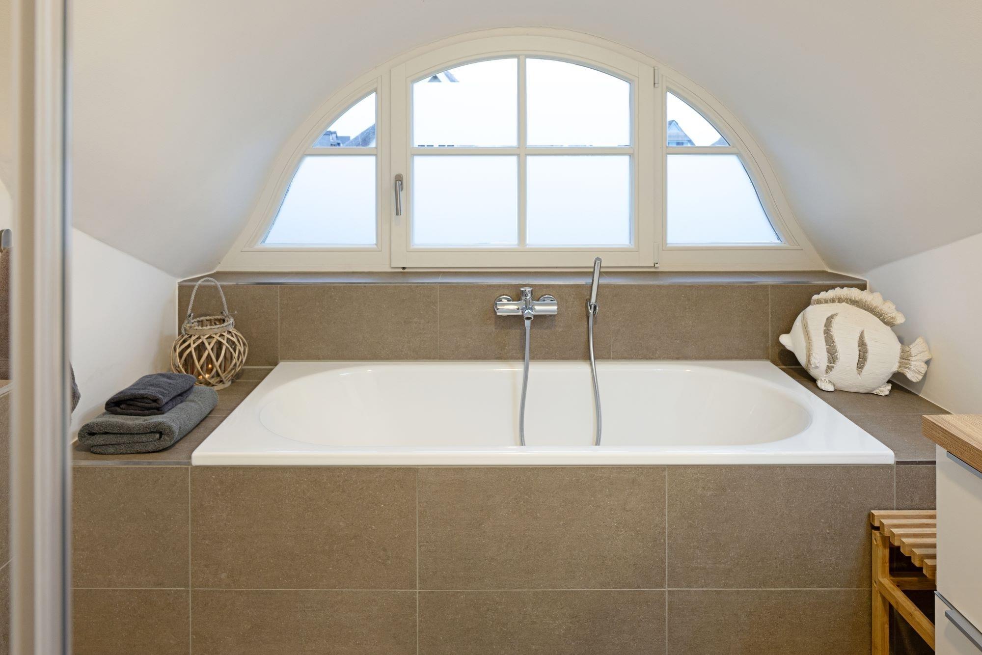Im Obergeschoss befinden sich die 3 Schlafzimmer und das moderne Vollbad mit Fledermausgaube, Komfort-Badewanne und bodengleicher Dusche.