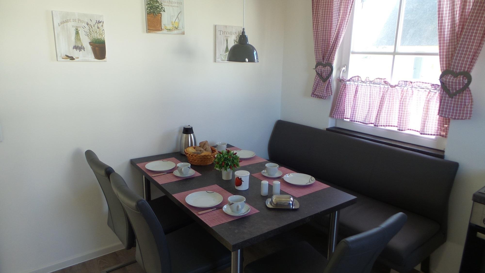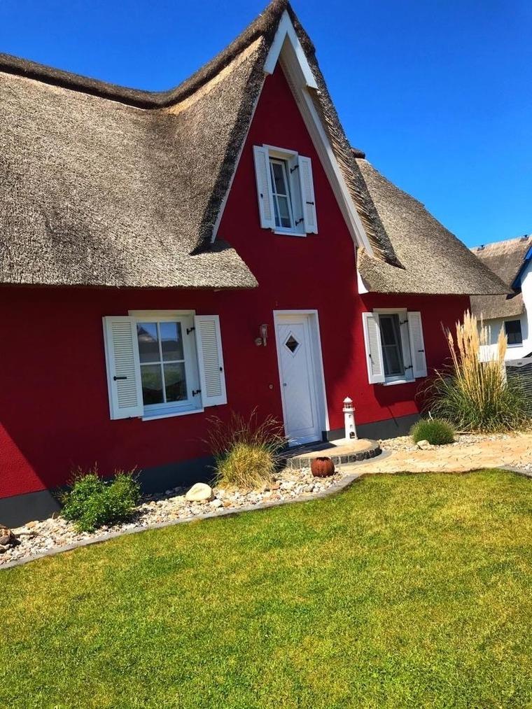 Auf der möblierten Terrasse haben Sie den ganzen Tag Sonne und Sie können den Blick über die Felder bis hin zum Erholungsort Zierow schweifen lassen. Eine gemütliche Sitzlounge lädt zum Entspannen und Bücher lesen ein. Die Terrasse ist mit einer elektrischen Markise versehen. Im Garten ist ein Grill und ein Gartenhaus zum Unterstellen Ihrer mitgebrachten Fahrräder. Im Reethaus erwartet Sie eine komfortable, hochwertige Ausstattung. Im gesamten Haus ist eine Fußbodenheizung und Fliesen verlegt. Im Erdgeschoss befindet sich das Wohnzimmer mit Kamin. Machen Sie es sich auf der großen Wohnlandschaft gemütlich - Spiele, Bücher, DVD`s, Sat-TV mit DVD sorgen für Unterhaltung. W-LAN ist kostenfrei nutzbar. Eine Waschmaschine steht im Hauswirtschaftsraum bereit. Die Küche ist separat und lädt zum Kochen ein. Der Essbereich ist hier integriert. Die Küche ist mit Geschirrspüler, Ceran-Kochfeld, Backofen, Toaster, Kaffeemaschine, Radio, Kühlschrank mit Gefrierfach und vielen Kochutensilien ausgestattet.