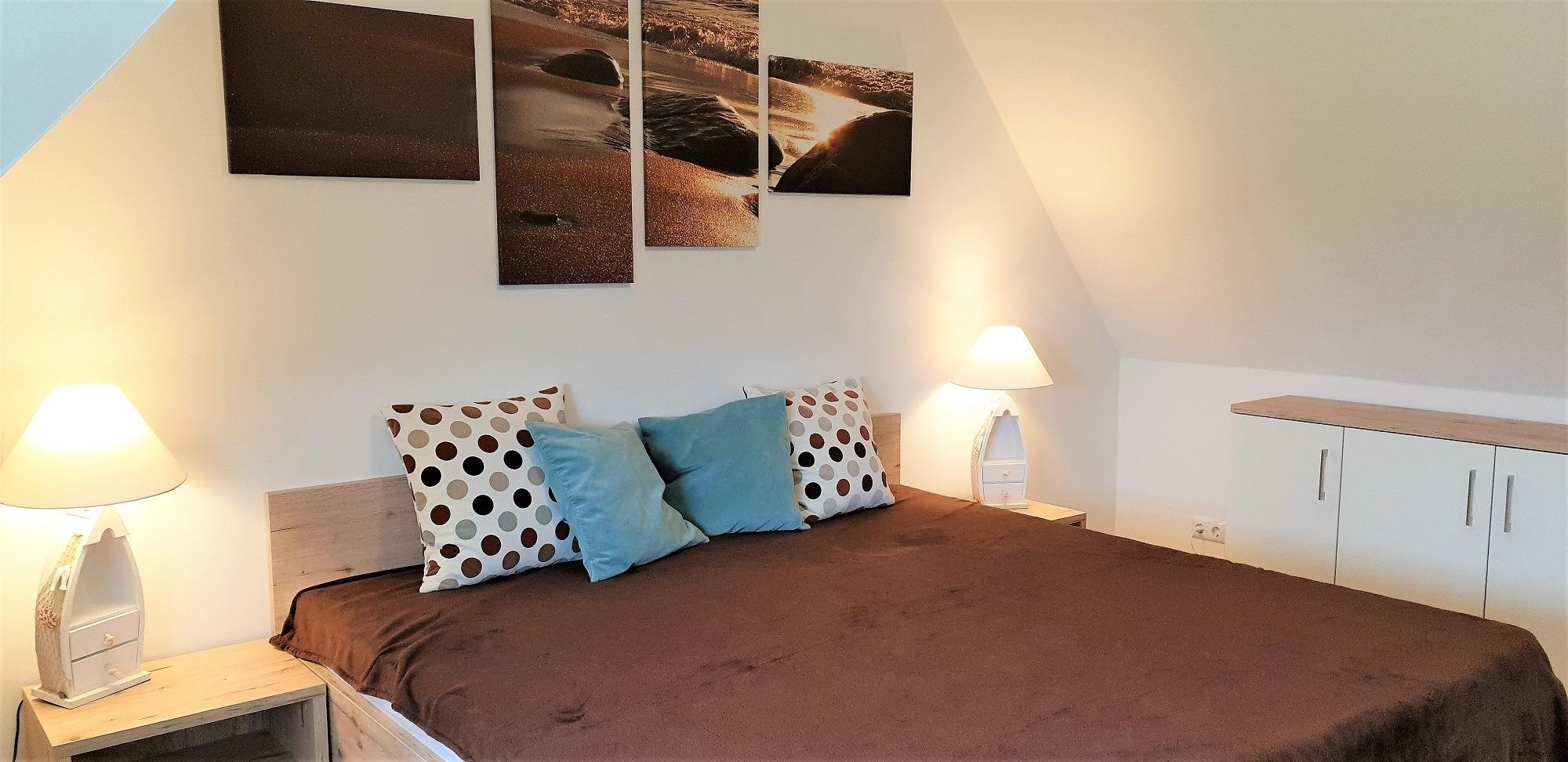 Das große 2m x 2m Doppelbett in Komforthöhe sorgt für erholsamen Schlaf.