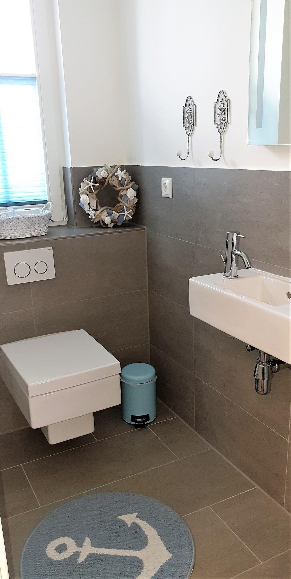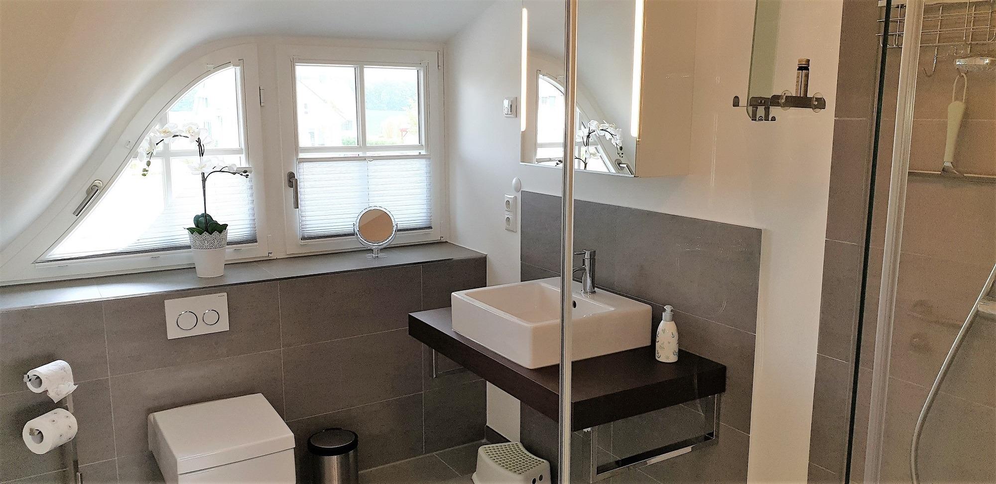 Im Obergeschoss befindet sich das zweite Badezimmer mit Regendusche und wundervollem Blick auf die Ostsee.