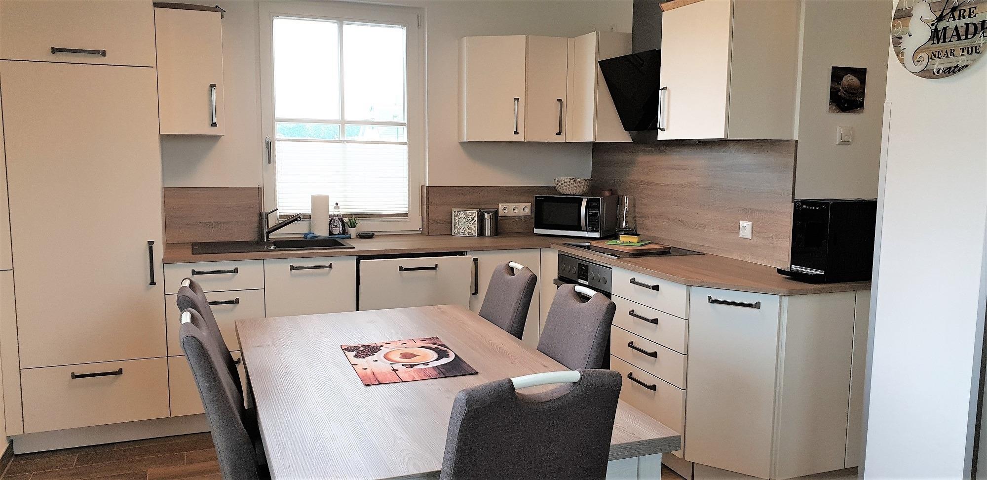 Die moderne, vollausgestattete Küche lässt keine Wünsche offen und verfügt unter anderem über ein Induktionskochfeld, Küchenmaschine sowie einen Kaffeevollautomaten.