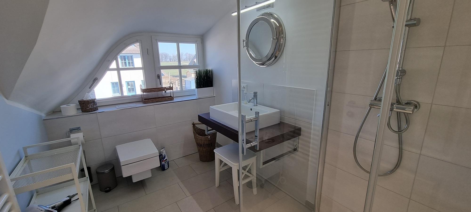 Das Duschbad liegt zwischen den beiden Schlafzimmern und modern mit Echtglasdusche, Waschbecken, WC eingerichtet.