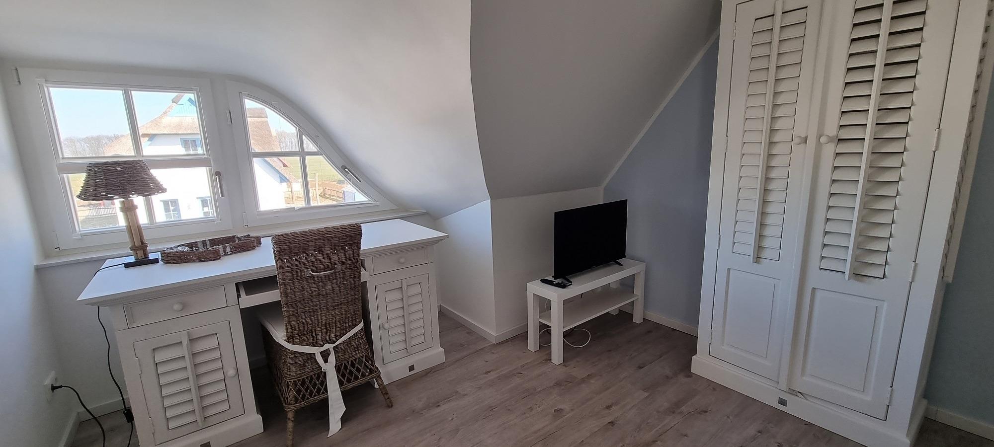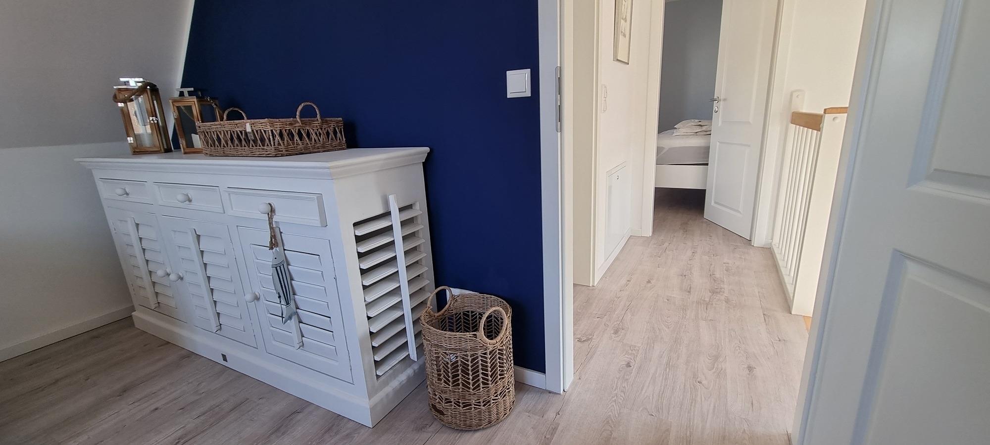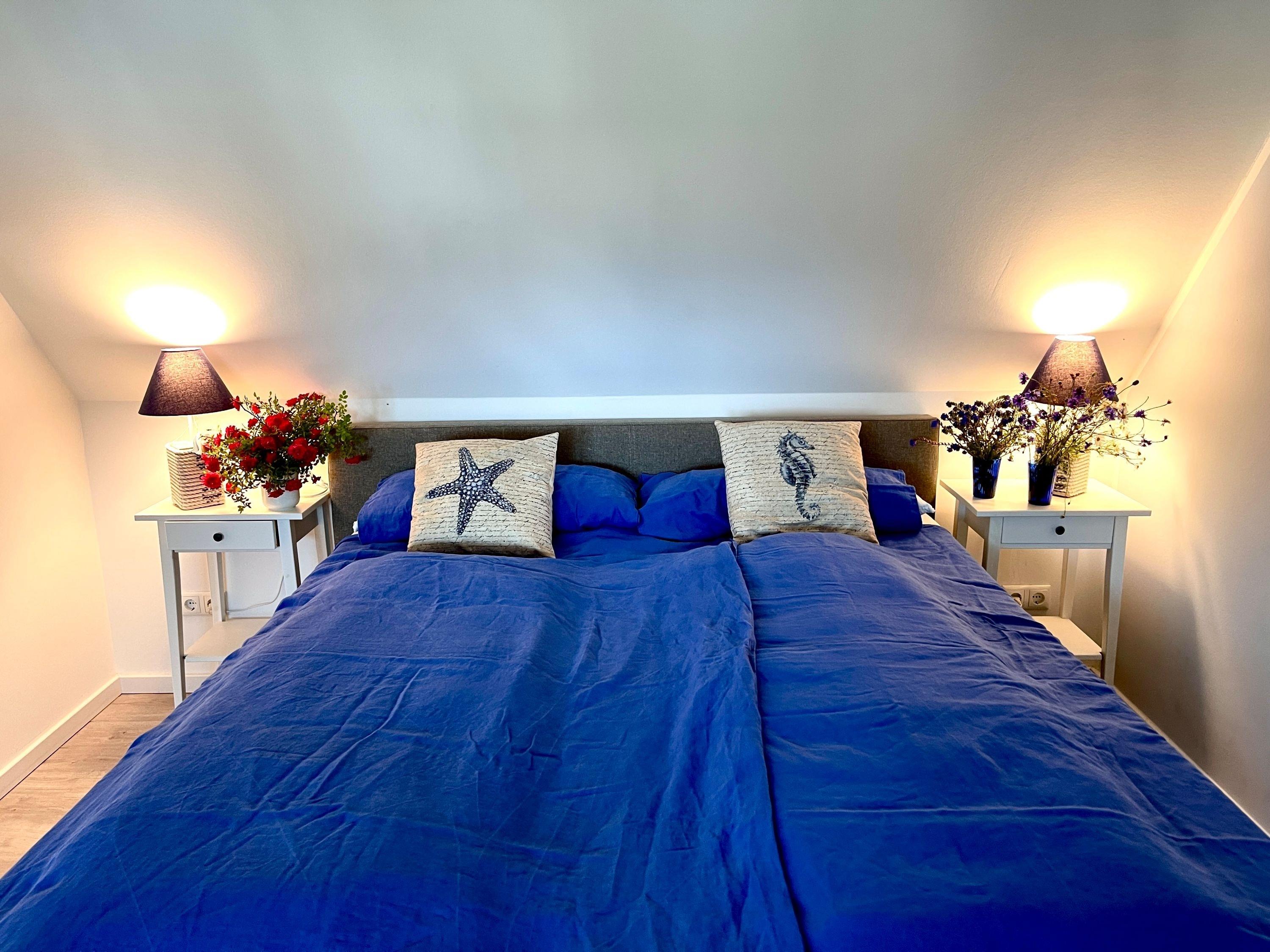 Im Obergeschoss befinden sich die zwei Schlafzimmer und das Duschbad. Das erste Schlafzimmer ist mit einem Doppelbett, Kommode und Schreibtisch ausgestattet. Im zweiten Schlafzimmer stehen zwei Einzelbetten und eine weitere Kommode. Die Bettwäsche ist gegen Gebühr buchbar.