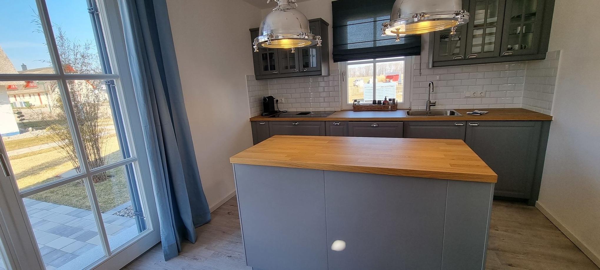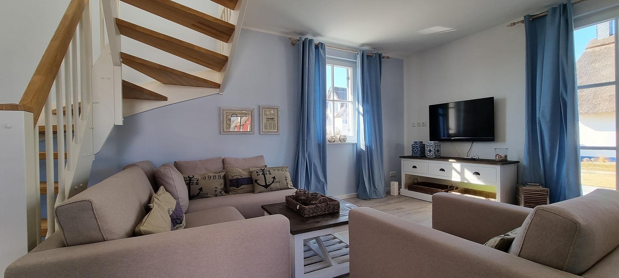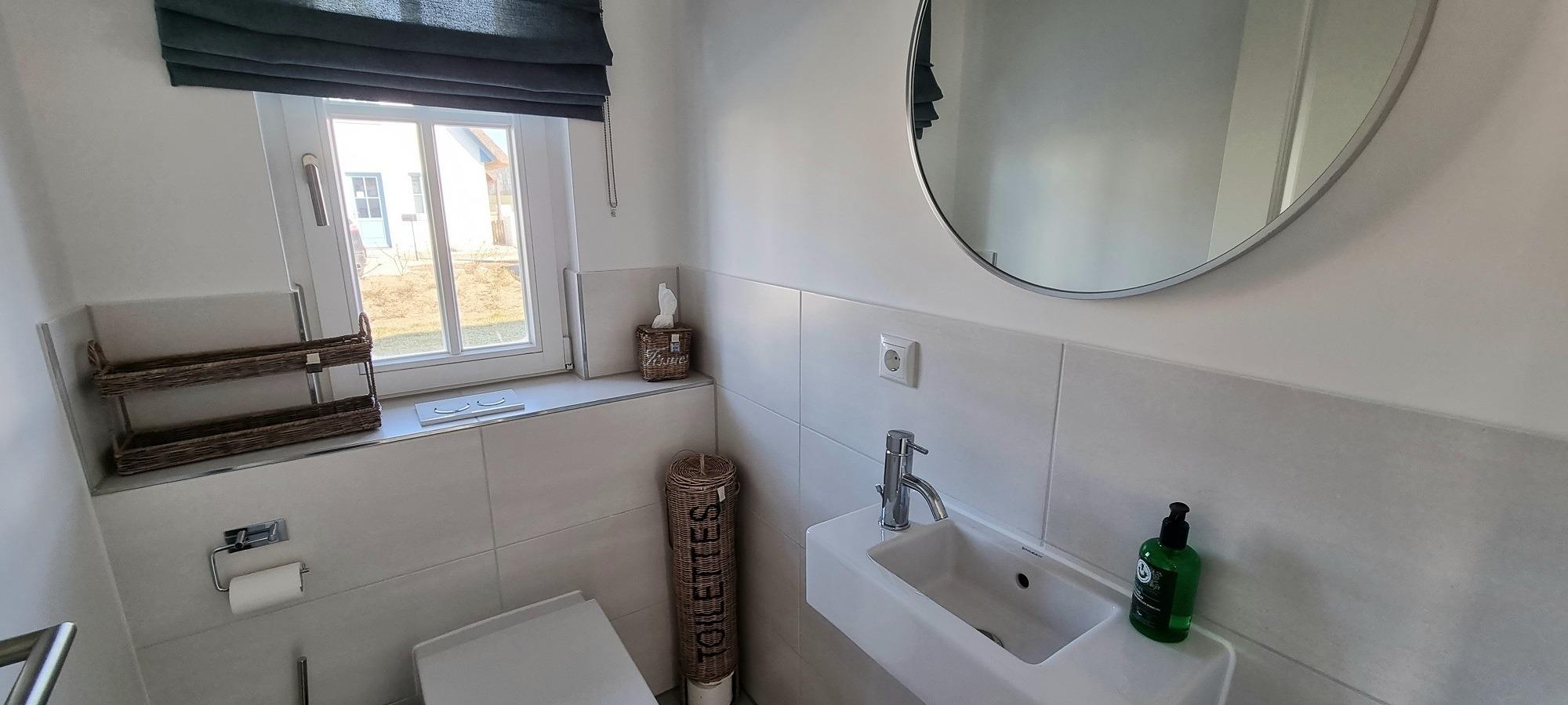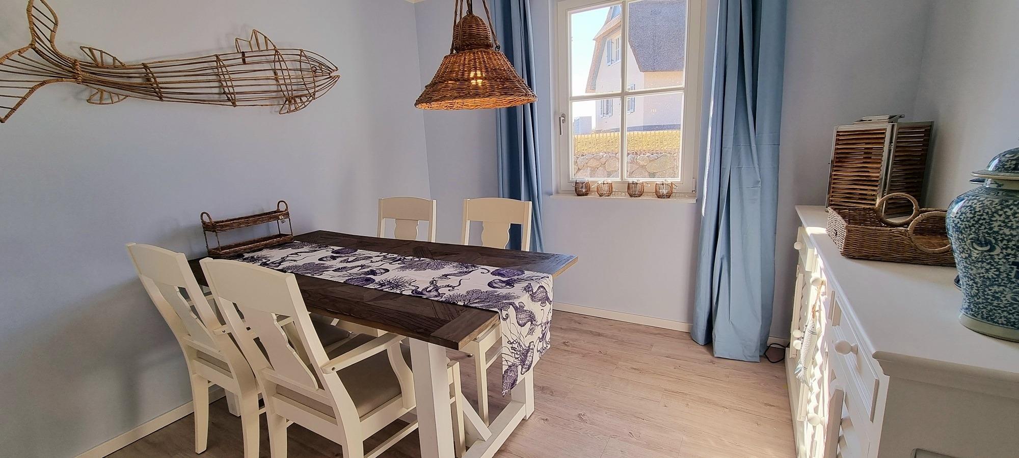 Es ist im nordischen Stil liebevoll eingerichtet. Das Erdgeschoss ist großzügig gestaltet. Im Wohnbereich ist die moderne Küchenzeile integriert. Sie ist hochwertig mit Geschirrspüler, Induktionsherd und vielen weiteren Extras ausgestattet. Ein schnelles Frühstück kann am Küchentresen eingenommen werden. Das separate Esszimmer ist ein kleines Highlight zu den anderen Reethäusern im Ferienhausgebiet. Hier können Sie ganz gemütlich Speisen oder Spielabende erleben. Des Weiteren ist im Erdgeschoss das Gäste-WC und der Hauswirtschaftsraum mit Waschmaschine und Wäschetrockner und Putzutensilien.