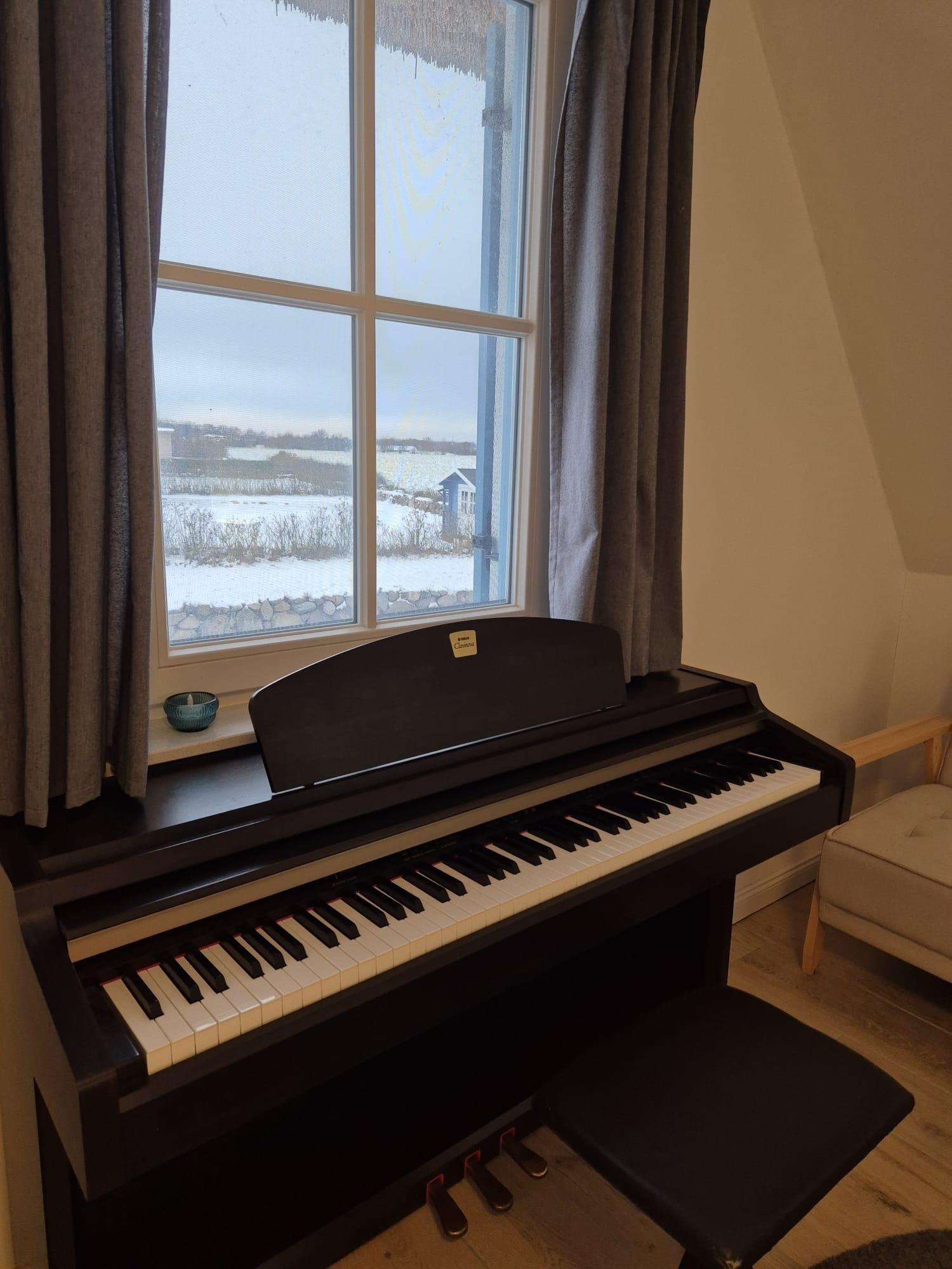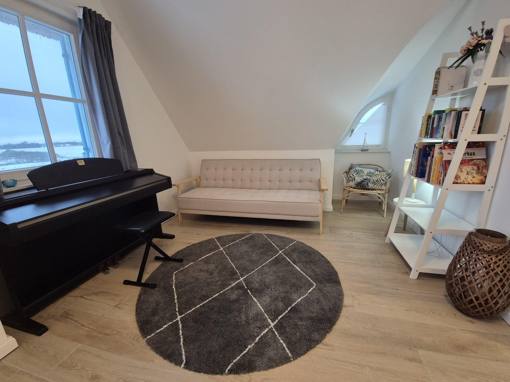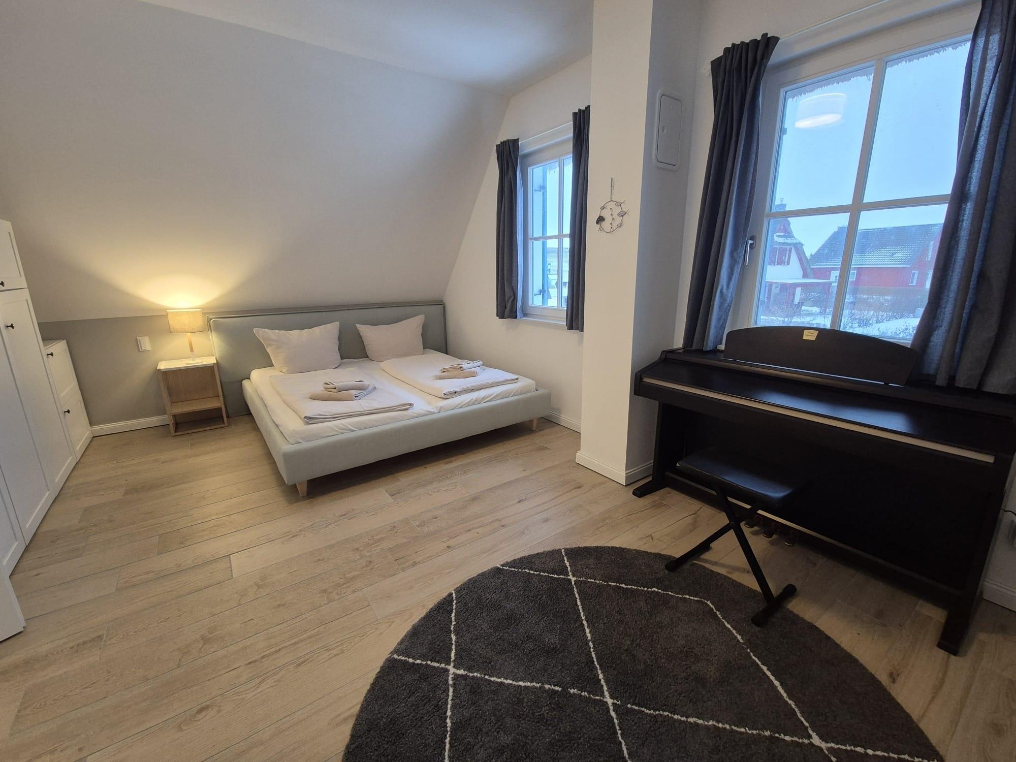 Das erste Schlafzimmer mit Doppelbett, Klavier, Spielen und Büchern begeistert mit einem wundervollen Blick auf die Ostsee.