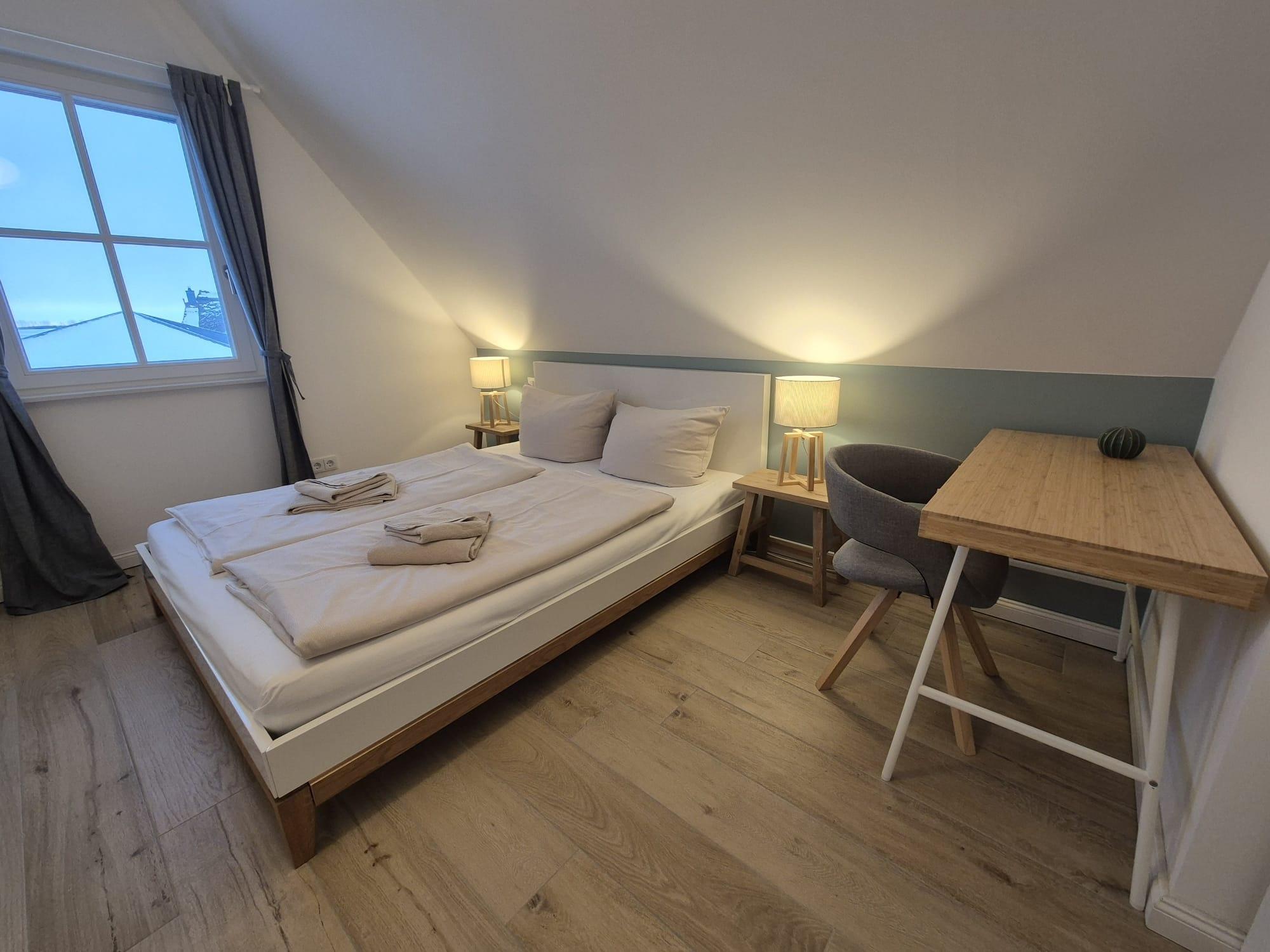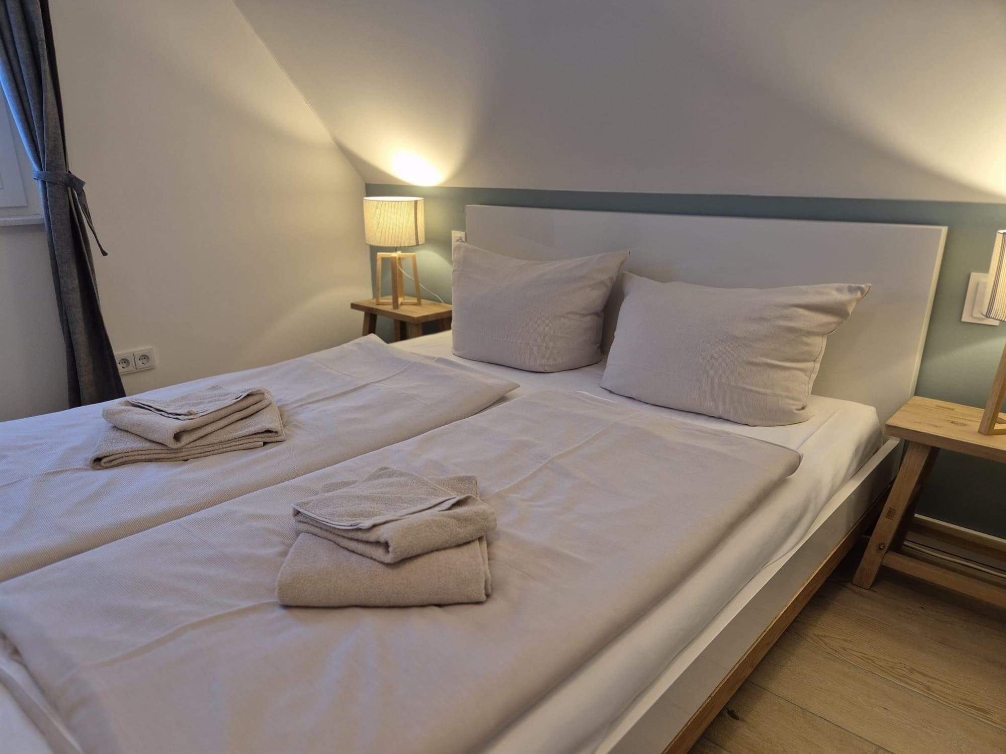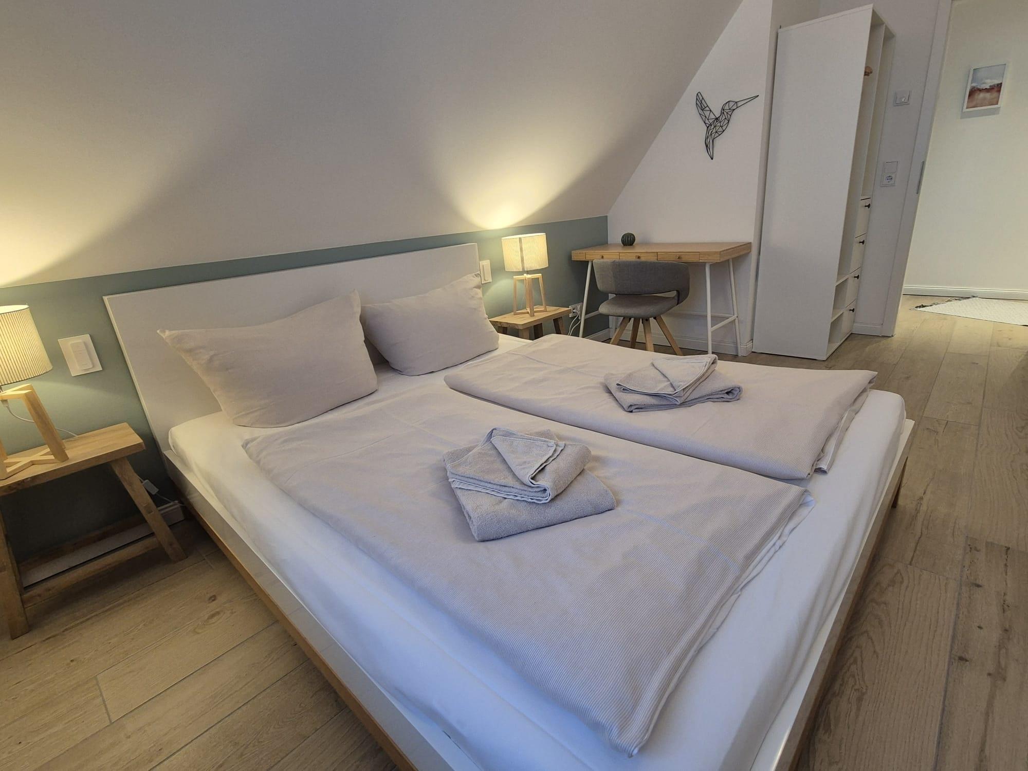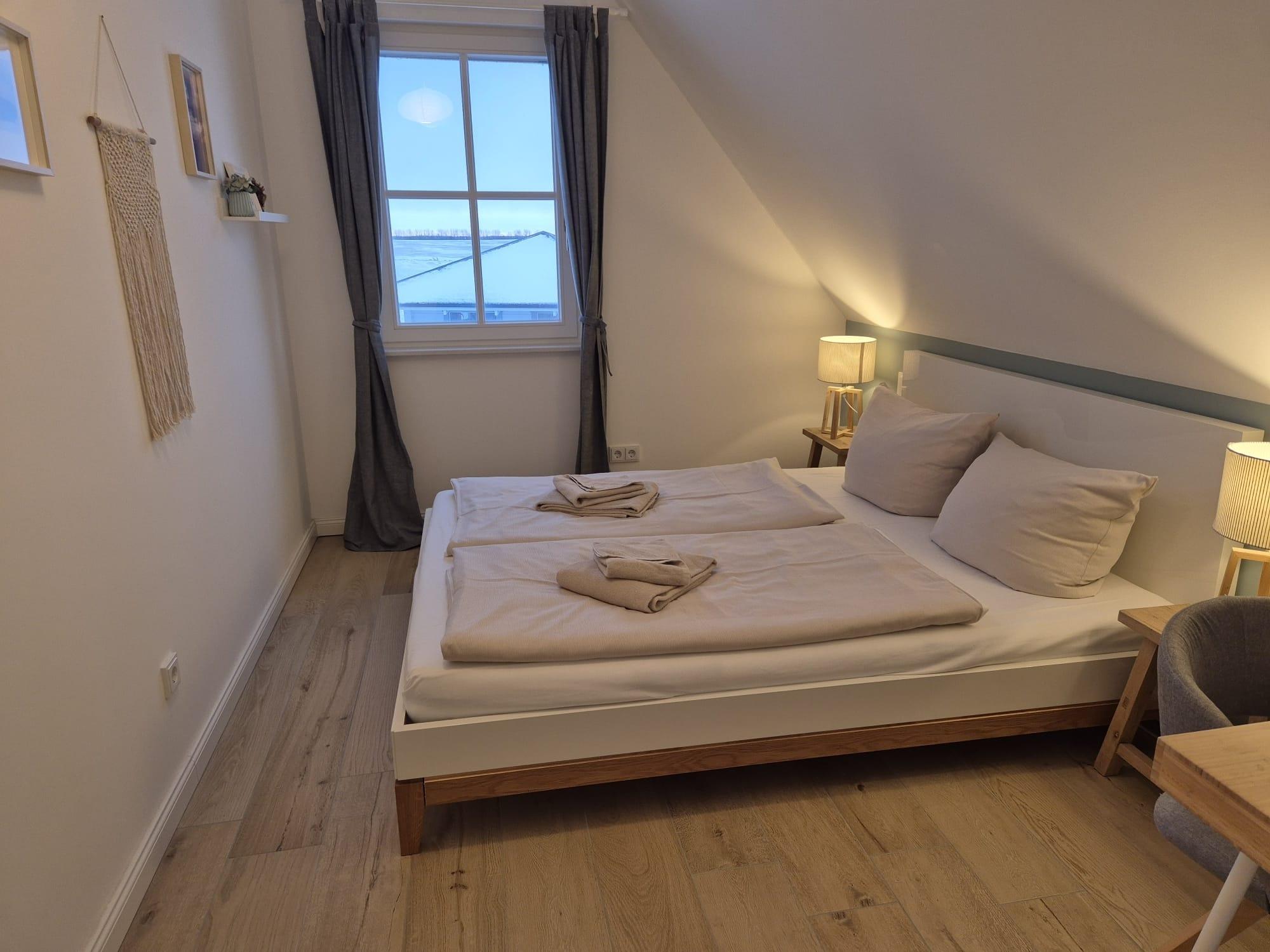 Das zweite Schlafzimmer bietet ebenfalls ein Doppelbett sowie einen Schreibtisch – ideal für ruhige Momente oder das Arbeiten im Urlaub.