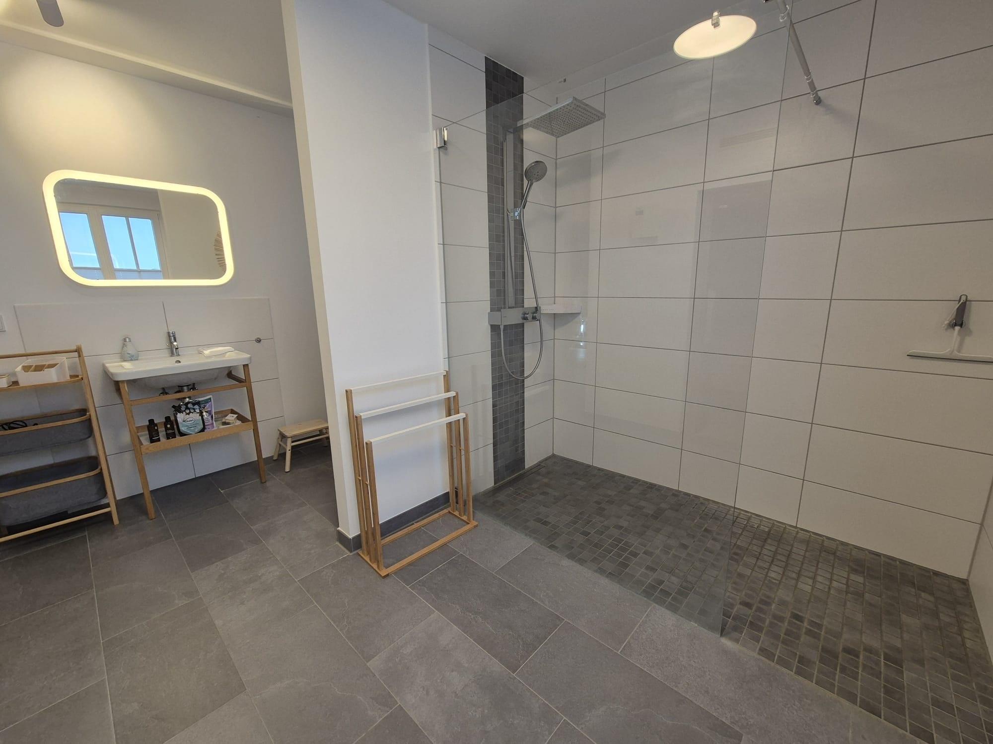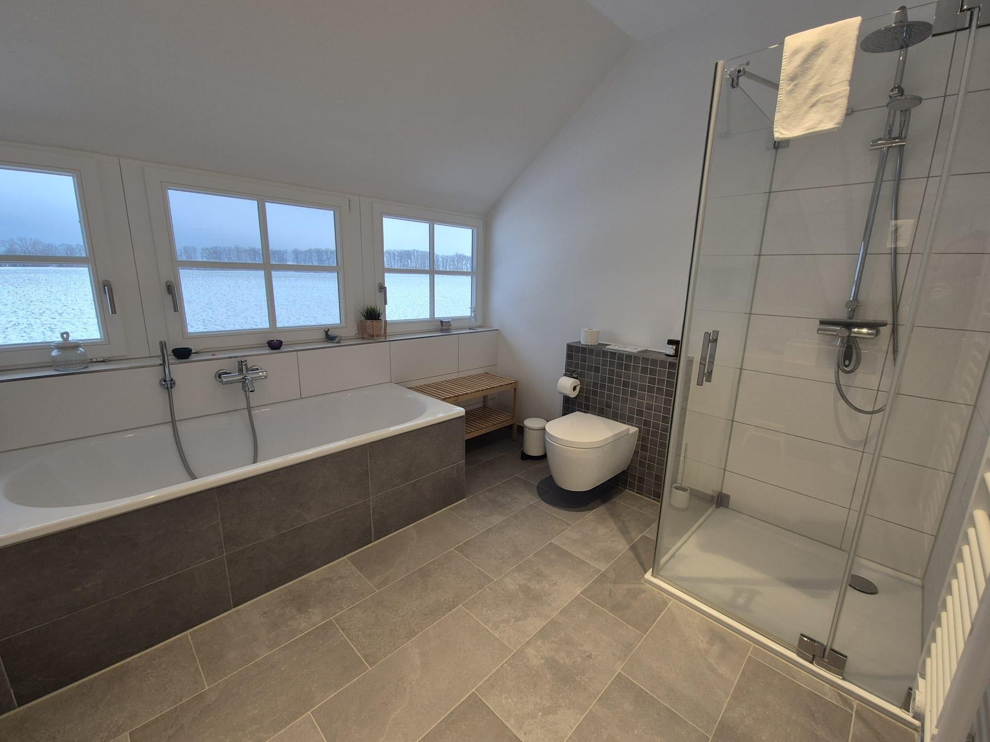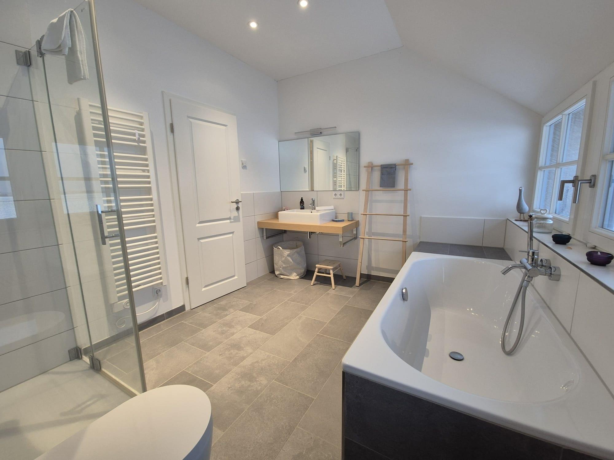 Im Erdgeschoss erwartet Sie ein offenes, lichtdurchflutetes Wohnzimmer mit gemütlichem Kamin – perfekt für entspannte Abende zu jeder Jahreszeit. Die komfortabel ausgestattete Küche fügt sich harmonisch in den Wohnbereich ein und lädt zum gemeinsamen Kochen ein. Ein modernes Duschbad mit Sauna sorgt für wohltuende Wellnessmomente, von hier aus haben Sie direkten Zugang in den Garten.