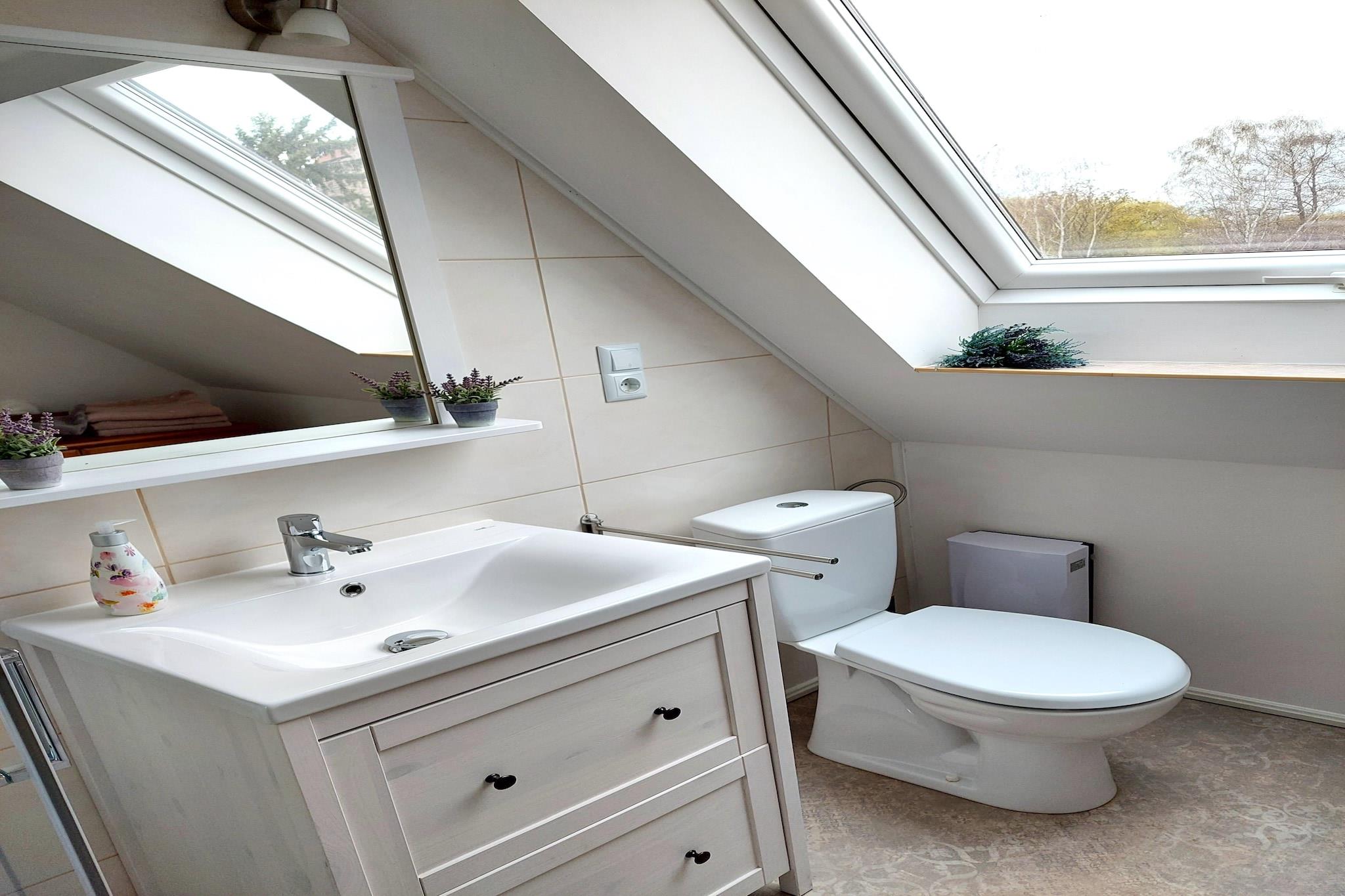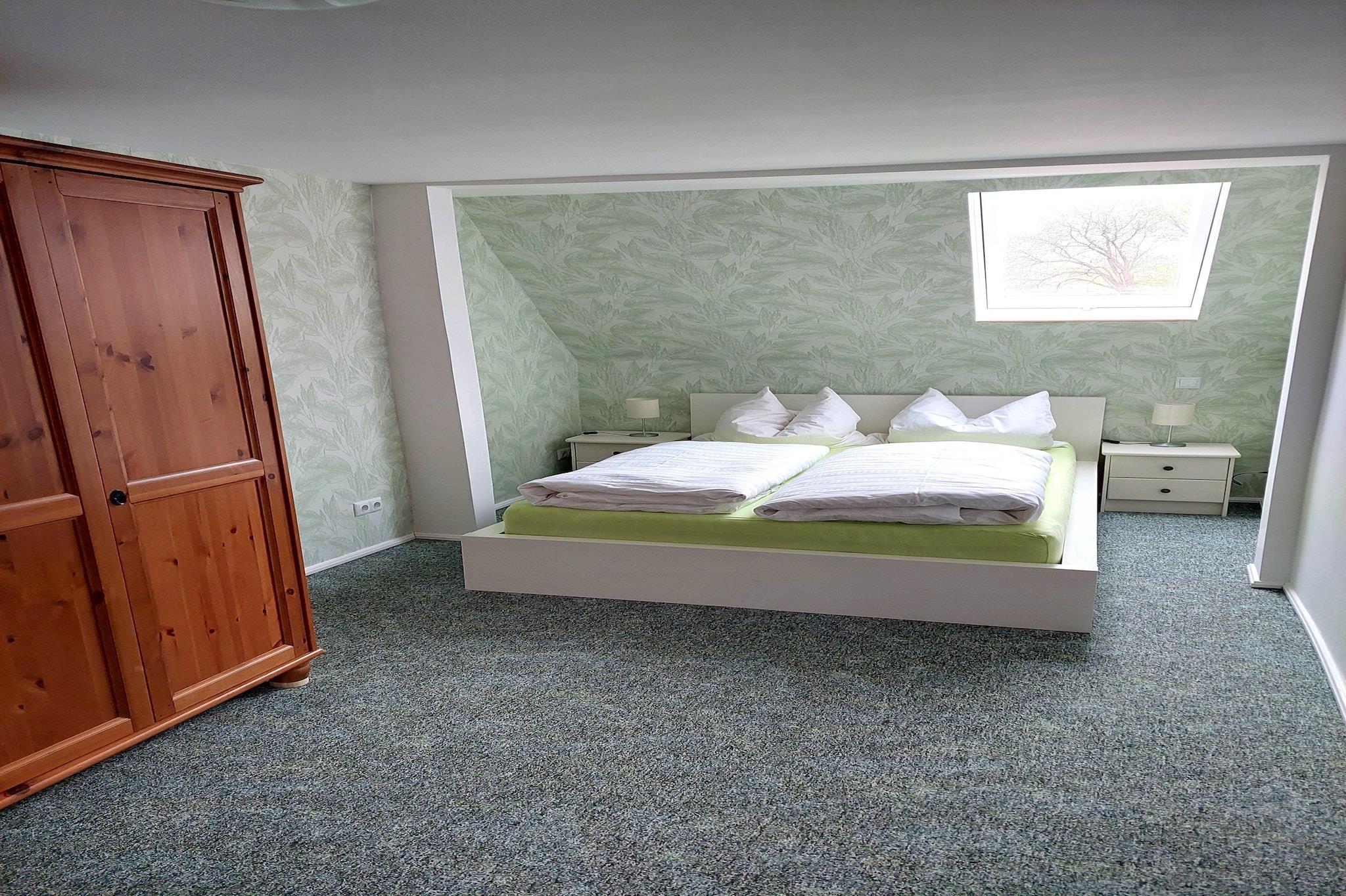 Denne charmerende loftslejlighed ligger i Ziesar, mellem Magdeburg og Potsdam, og er ideel til små familier eller vennegrupper. Dens idylliske, landlige omgivelser nær naturparken Fläming gør den til en perfekt base for afslappende udflugter. Besøg den tidligere bispebolig Ziesar med dens imponerende og maleriske slot, og slentre gennem de charmerende gyder i den gamle bydel, hvor tiden synes at stå stille. Det smukke slot Wiesenburg ligger kun 25 minutters kørsel væk, og sødistriktet omkring Brandenburg an der Havel, der tilbyder bådture, svømning og vandsport, ligger 30 minutters kørsel derfra. En sightseeingtur til Potsdam og Magdeburg er også let at klare på bare 40 minutter. Den kompakte lejlighed har et fuldt udstyret køkken, tv og en sovesofa i stuen til en ekstra gæst. Gæster er velkomne til at bruge haven med terrasse og grill. Parkering er tilgængelig på stedet. Inkluderede højdepunkter: Alle forsyningsomkostninger (baseret på forbrug) Håndklæder Wi-Fi