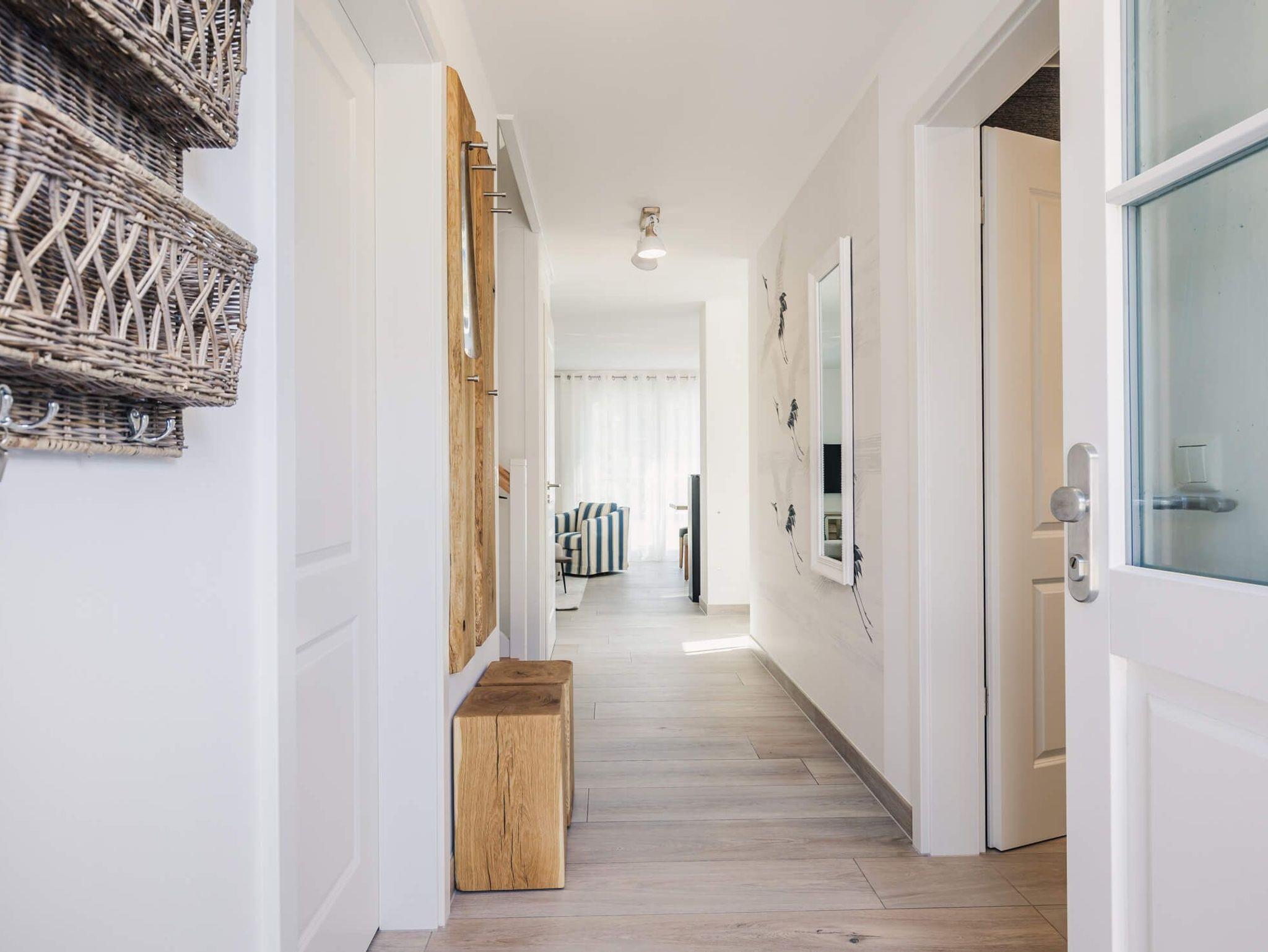 Auf 105 Quadratmetern Wohnfläche bietet Ihnen das Ferienhaus Kranichkieker Platz für 7 Personen. Es verfügt über 4 Schlafzimmer und 2 Bäder. Ein Bad im Erdgeschoss mit ebenerdiger Dusche und Sauna und ein Bad im Obergeschoss mit Badewanne und bodengleicher Dusche sorgen für Komfort und Entspannung. Die Schlafzimmer im Obergeschoss sind komfortabel mit Boxspringbetten und Flatscreen-TV ausgestattet. Das Schlafzimmer im Dachgeschoss beinhaltet zwei Einzelbetten und einen Flatscreen-TV. Der offene Wohn-Ess-Bereich mit voll ausgestatteter Küche bietet ausreichend Platz für gemeinsame Mahlzeiten und gesellige Abende. Die Terrasse mit angrenzendem Rasen lädt zum Sonnenbaden, Grillen und Entspannen im Freien ein. In dem abschließbaren Fahrradschuppen können Sie Ihre Fahrräder sicher abstellen. Zwei PKW-Stellplätze stehen Ihnen direkt am Haus zur Verfügung.