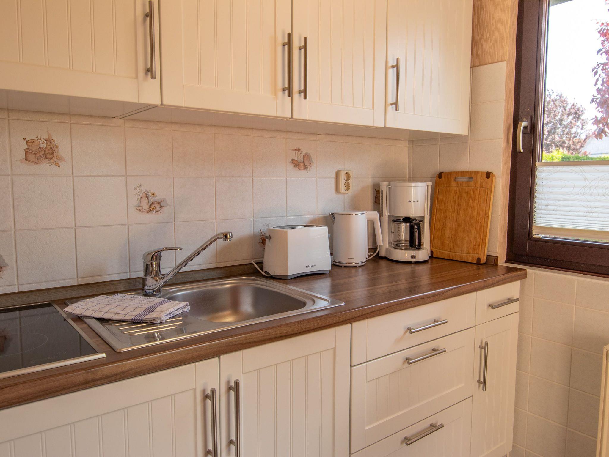 Sie erreichen die Ferienwohnung 1 über einen separaten Eingang am Haus der Vermieter. Im Eingangsbereich erwartet sie eine kleine Küche mit 2-Platten-Kochfeld, Kühlschrank, Kaffeemaschine, Toaster, Wasserkocher und Kochutensilien. Das gemütliche Wohnzimmer verfügt über zwei Sessel, TV, Esstisch und ein Doppelbett (180x200). Von hieraus erreichen sie die Terrasse mit Sitzmöglichkeit und das Bad mit Dusche und WC.