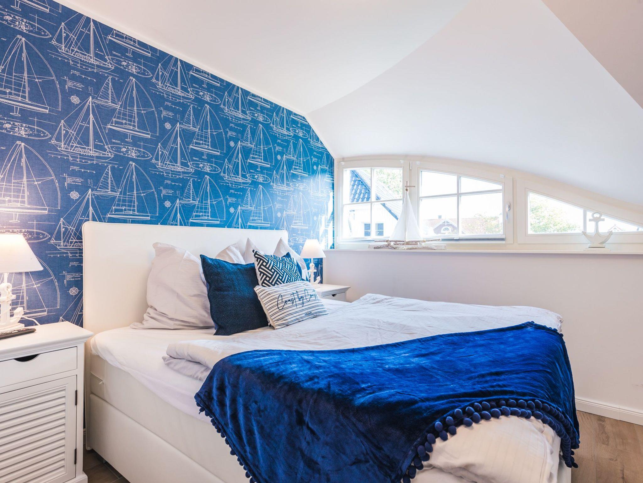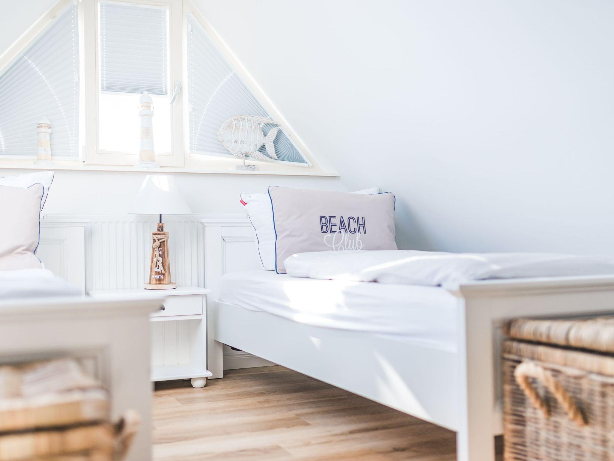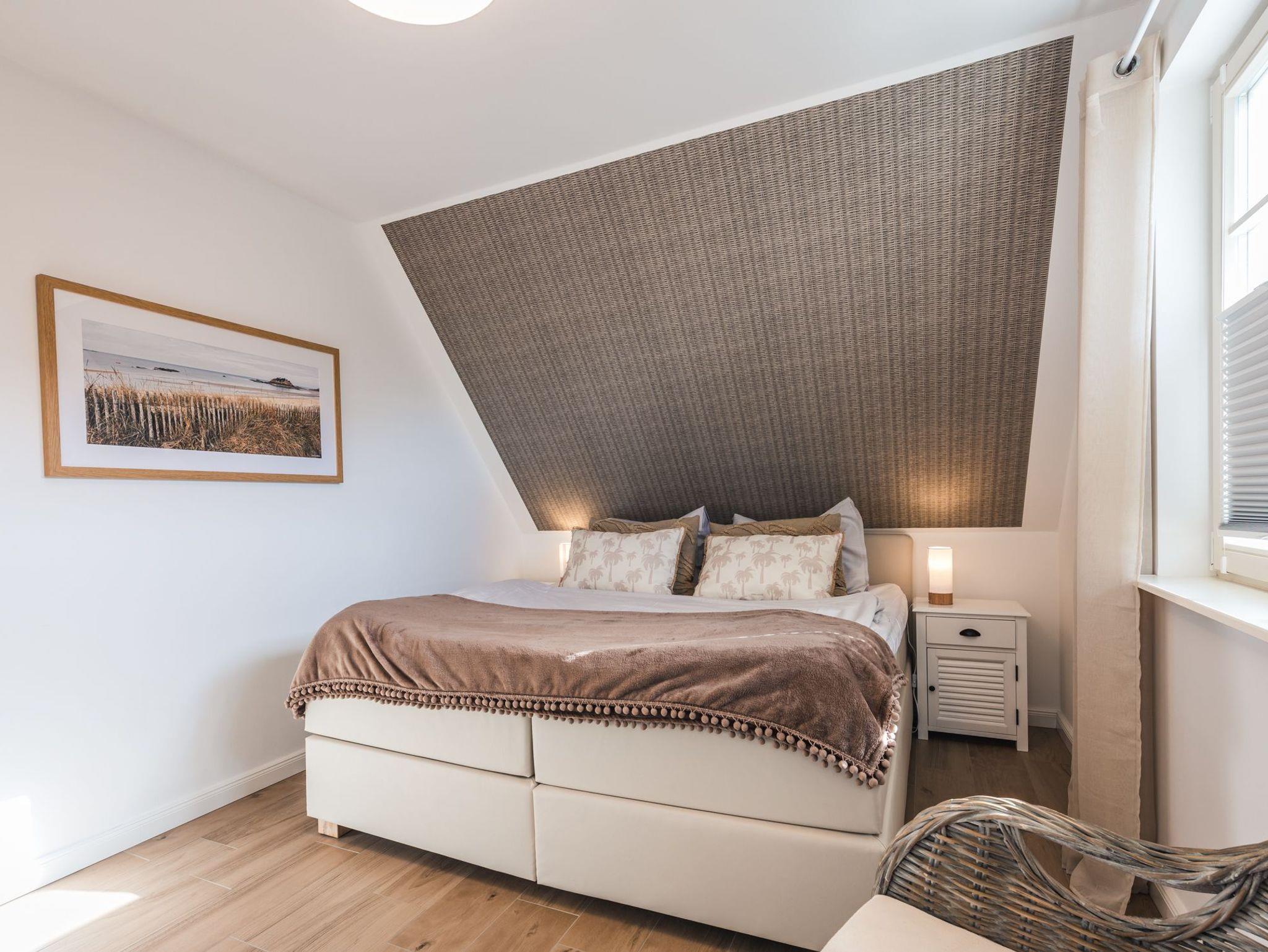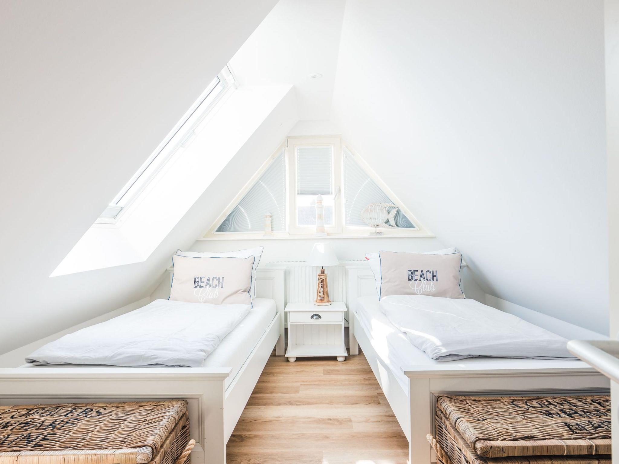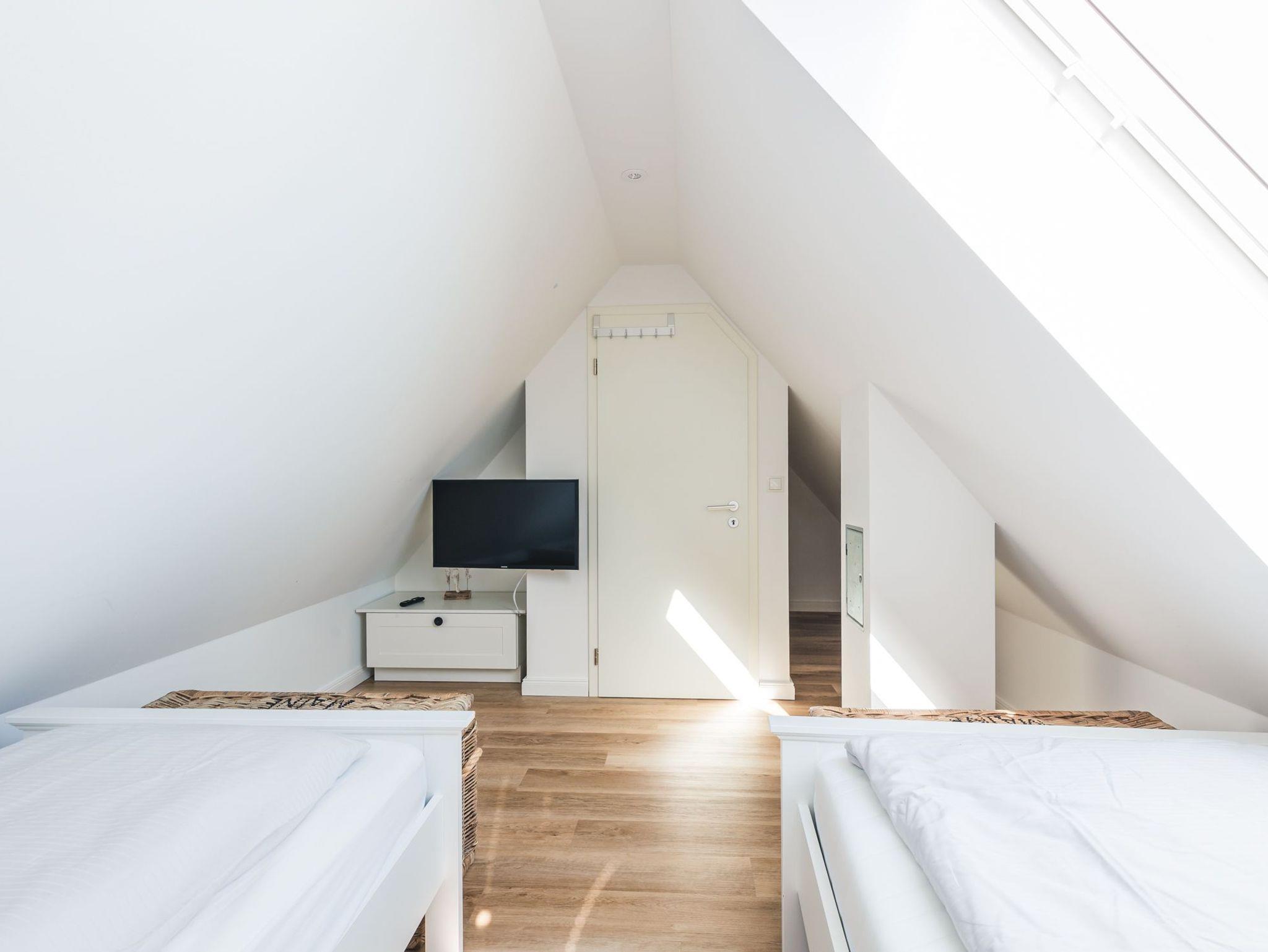 Im Obergeschoss des Ferienhauses befinden sich zwei Schlafzimmer für je zwei Personen, eines der Hauptschlafzimmer hat Zugang zu einem separaten weiteren kleinen Zimmer mit Einzelbett. Die Schlafzimmer sind mit Boxspringbetten ausgestattet. Der ausgebaute Spitzboden verfügt über zwei weitere Einzelbetten. 3 von 4 Schlafzimmern verfügen über einen Flatscreen TV.