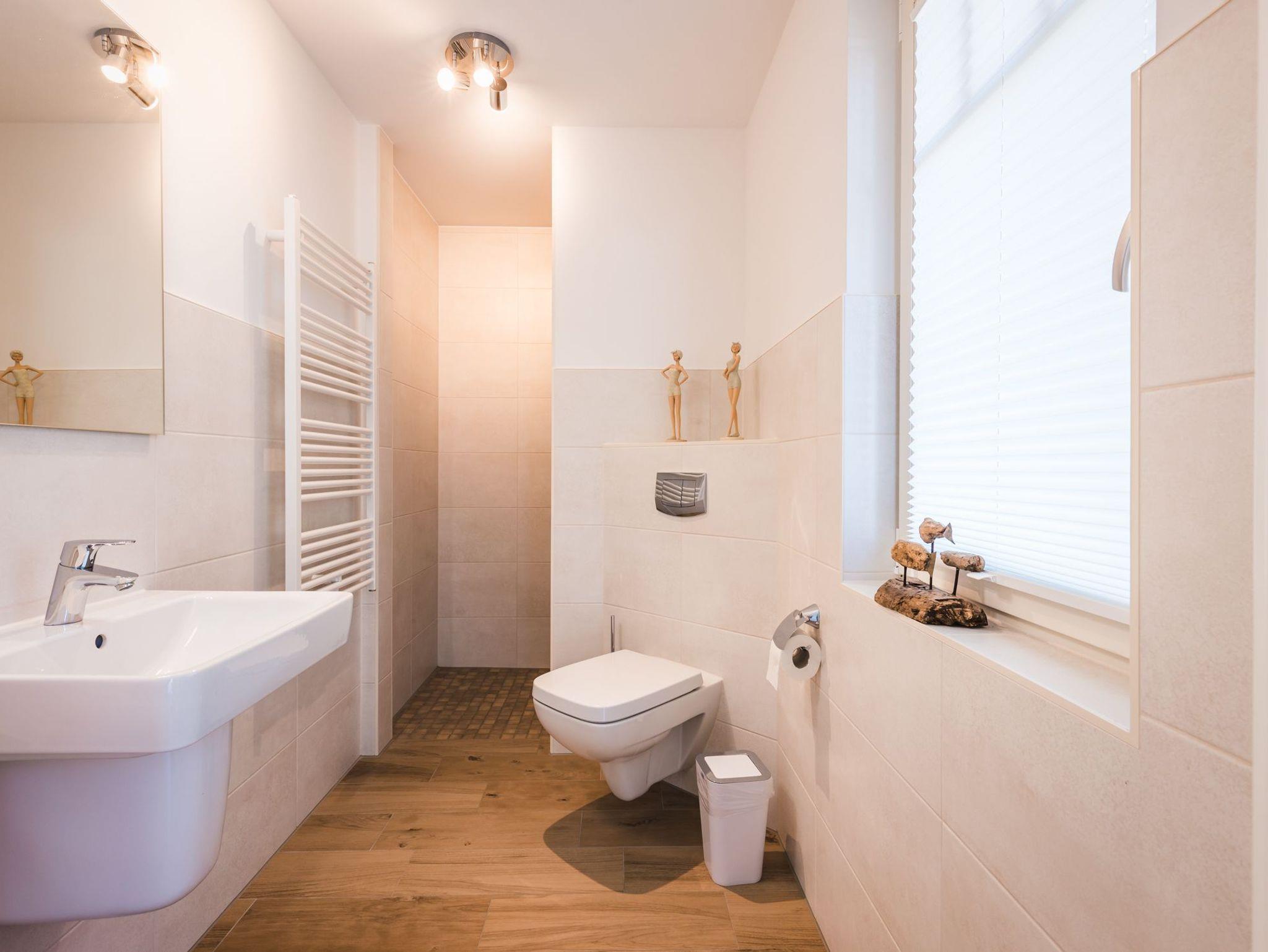 Ebenfalls auf dieser Ebene befindet sich das voll ausgestattete Badezimmer mit großer finnischer Sauna und bodengleicher Dusche sowie einer Badewanne.