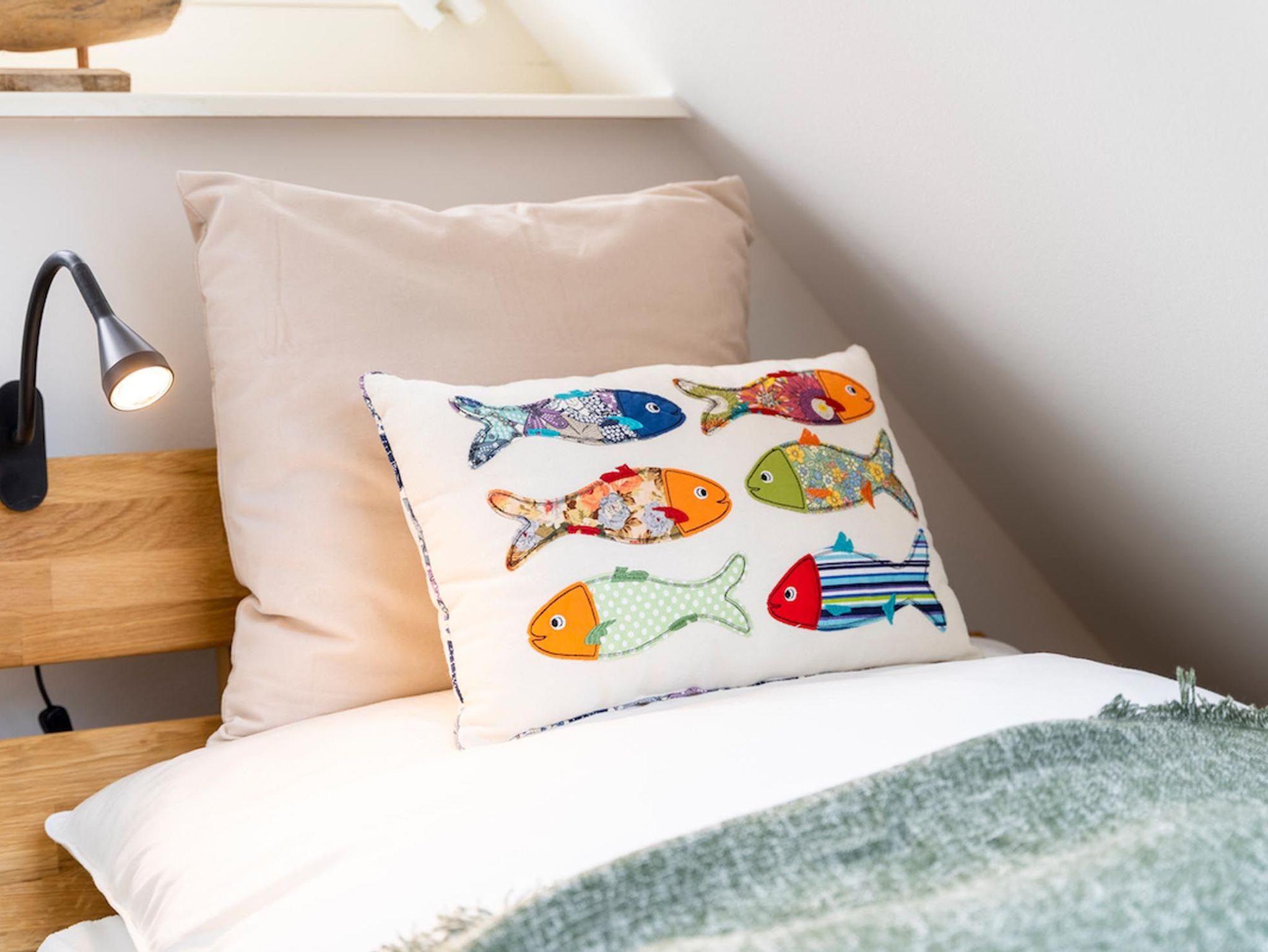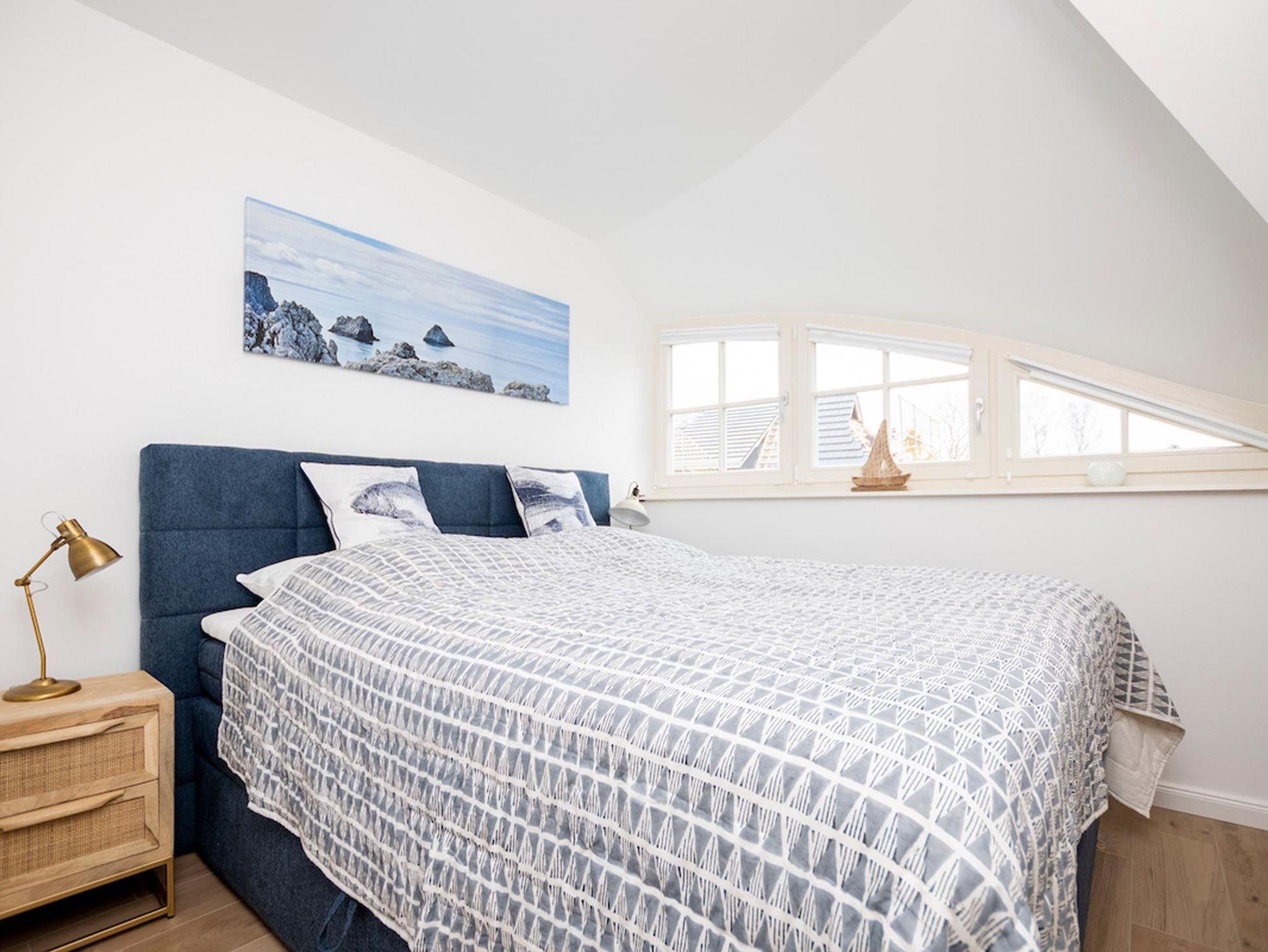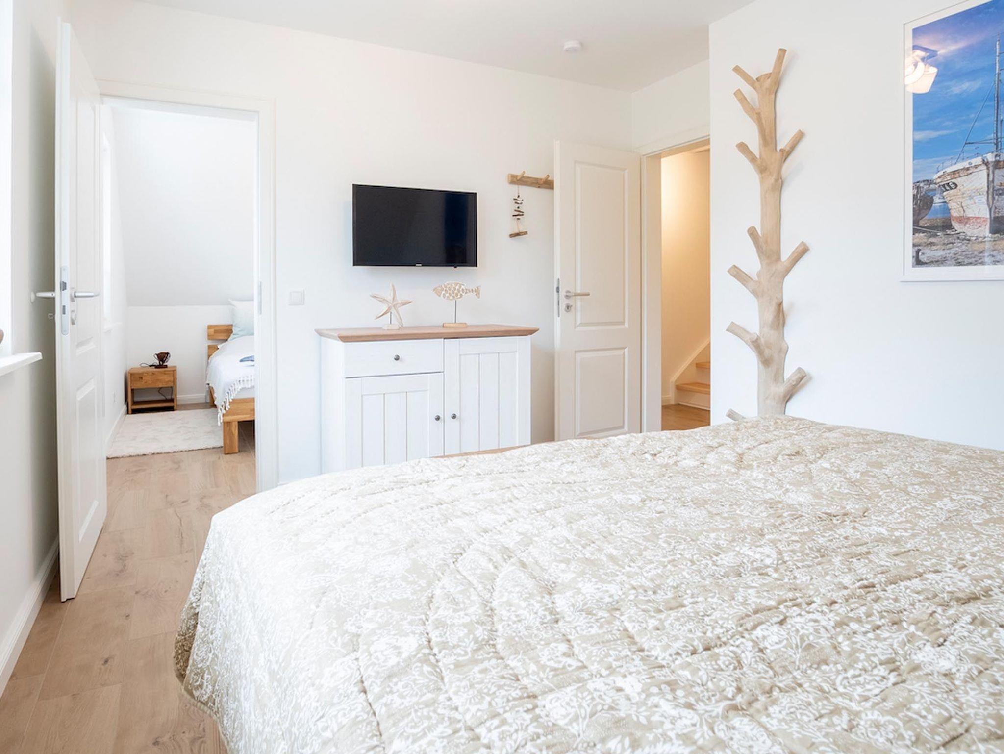 Im Obergeschoss des Ferienhauses befinden sich zwei Schlafzimmer für je zwei Personen. Eines der Hauptschlafzimmer hat Zugang zu einem separaten kleinen Zimmer mit Einzelbett. Die Schlafzimmer sind mit Boxspringbetten ausgestattet. Der ausgebaute Spitzboden verfügt über zwei weitere Einzelbetten. Drei von vier Schlafzimmern verfügen über einen Flatscreen-TV.