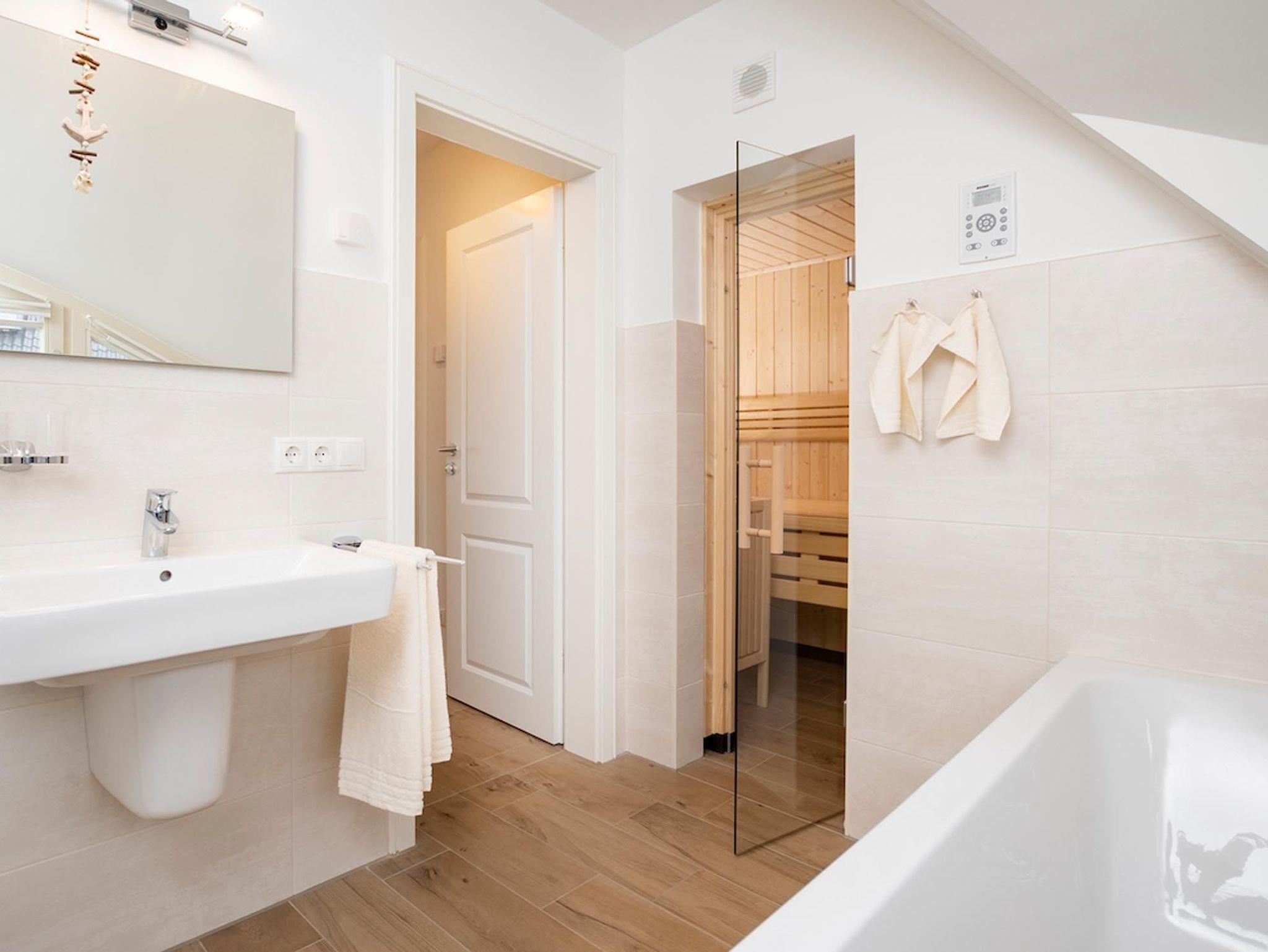Ebenfalls auf dieser Ebene befindet sich das voll ausgestattete Badezimmer mit großer finnischer Sauna, bodengleicher Dusche und Badewanne.