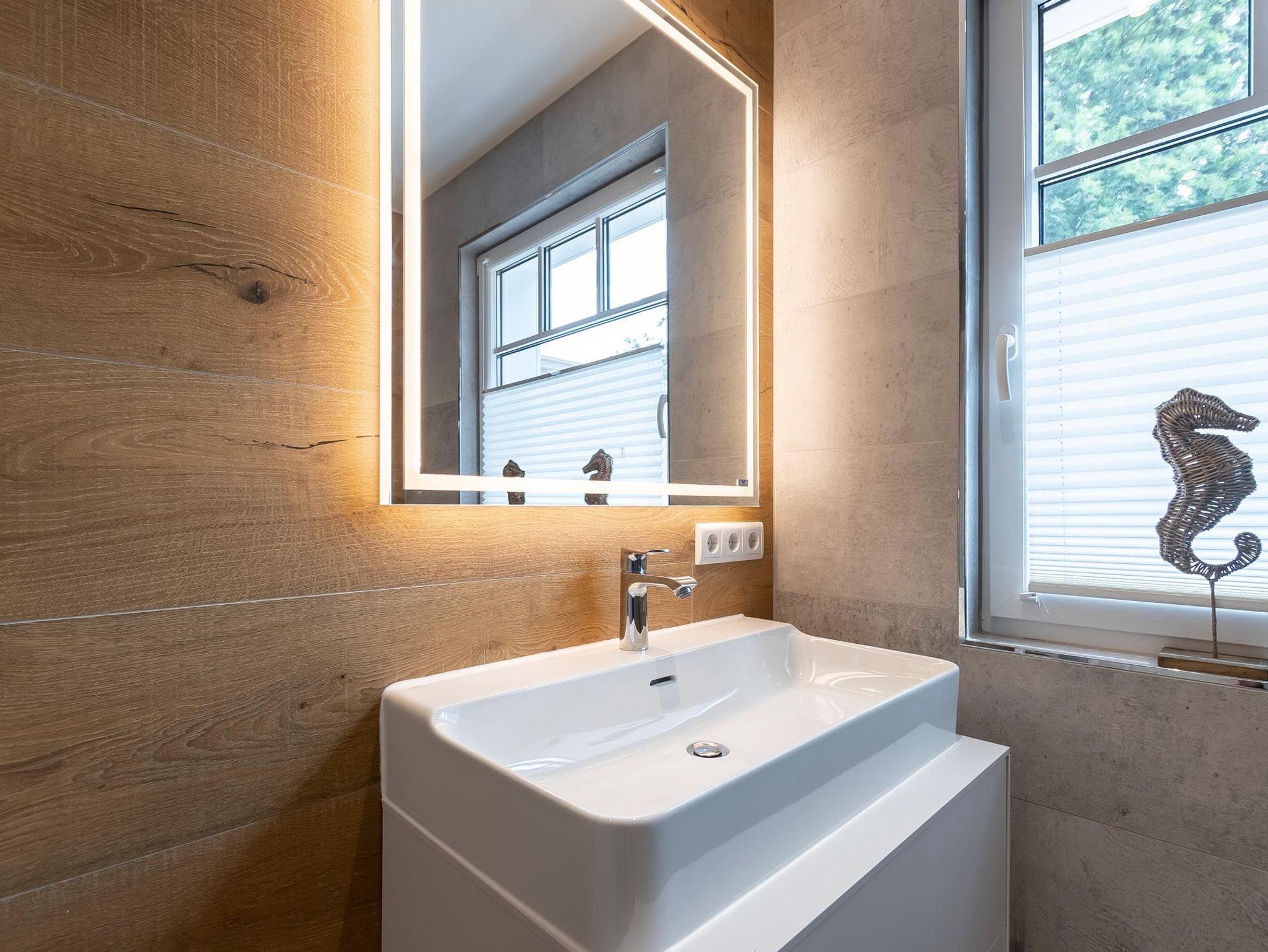 Das ansprechend eingerichtete Badezimmer verfügt über eine bodengleiche Dusche.
