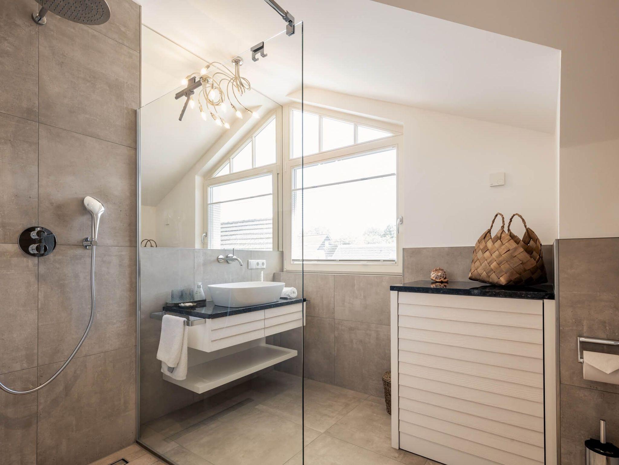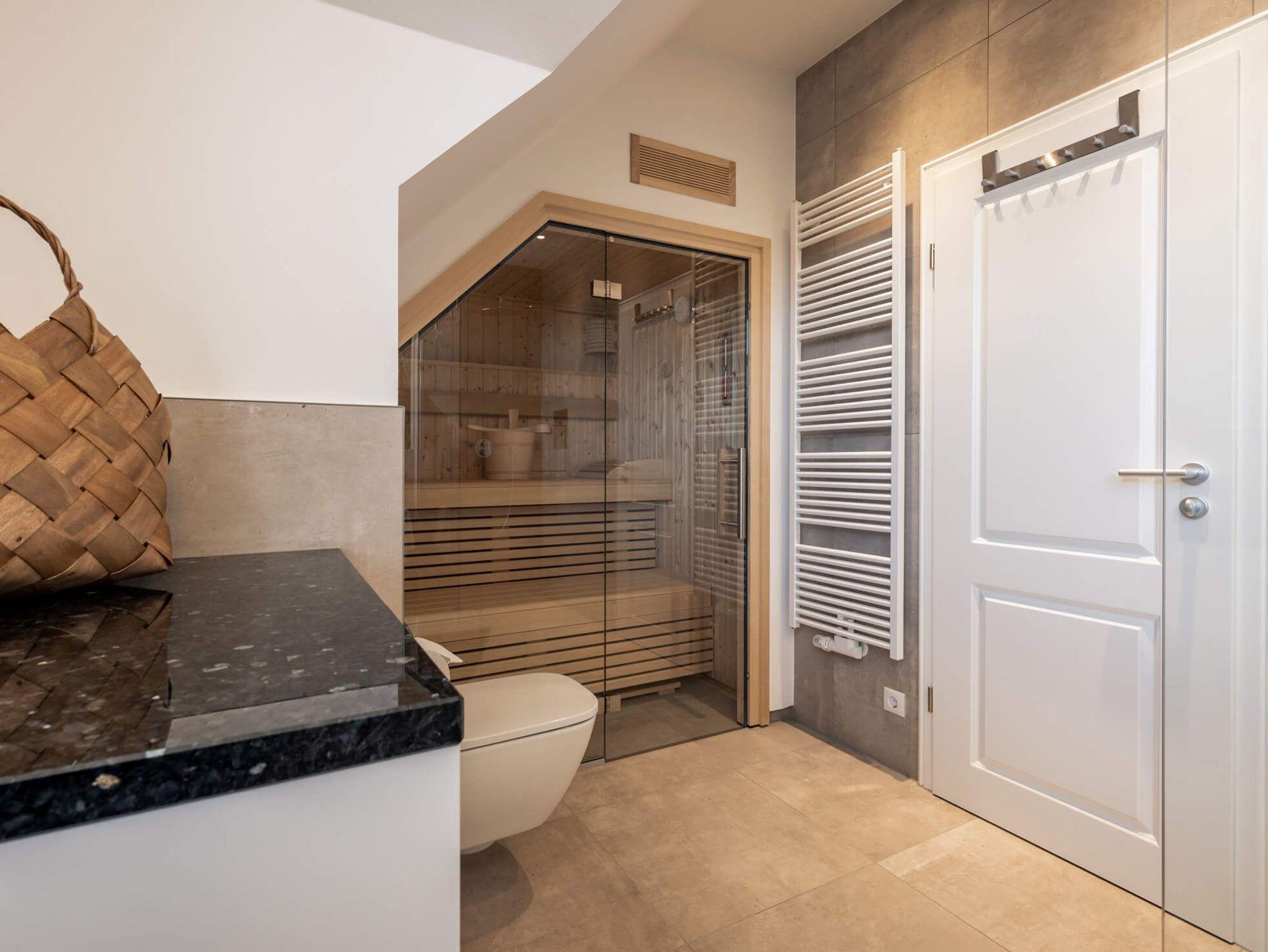 Zusätzlich erwartet Sie im Obergeschoss ein zweites elegantes Badezimmer mit Dusche, voll verglaster Sauna und Waschmaschine.