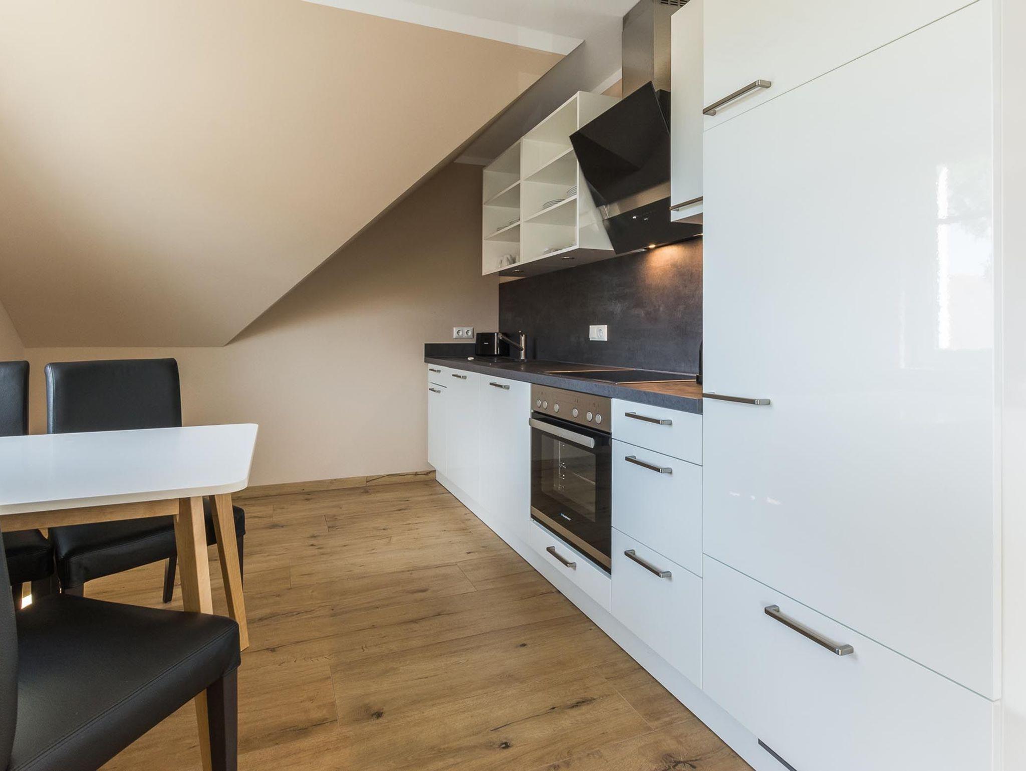 Das Appartement verfügt über einen lichtdurchfluteten Wohnbereich mit einer offenen Küche und gemütlichem Essbereich. Die Küche ist voll ausgestattet.