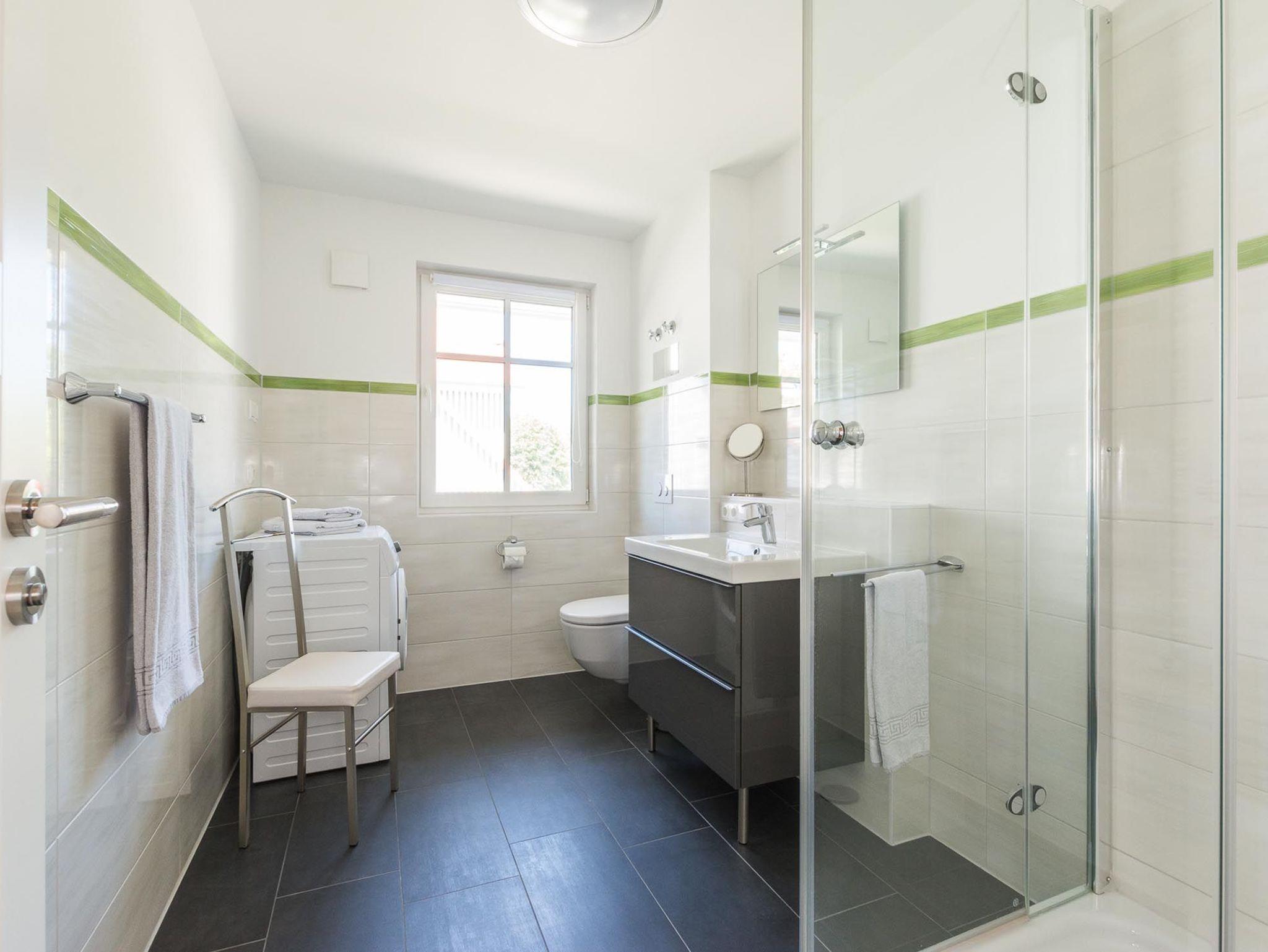 Das modern eingerichtete Badezimmer ist mit einer hochwertigen Dusche sowie einer Waschmaschine ausgestattet.