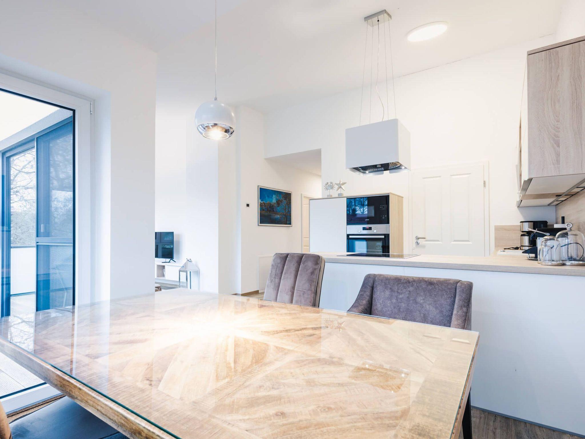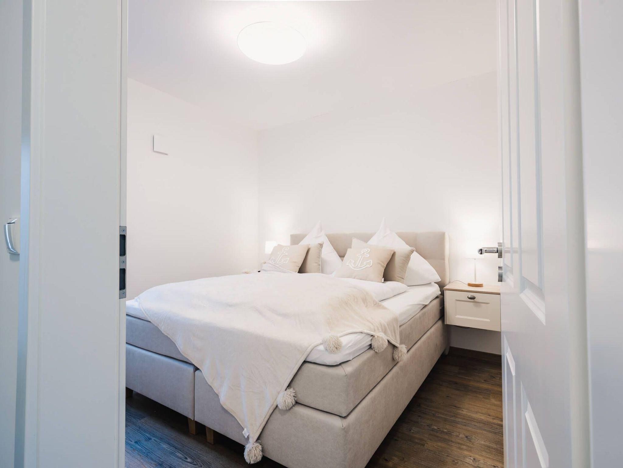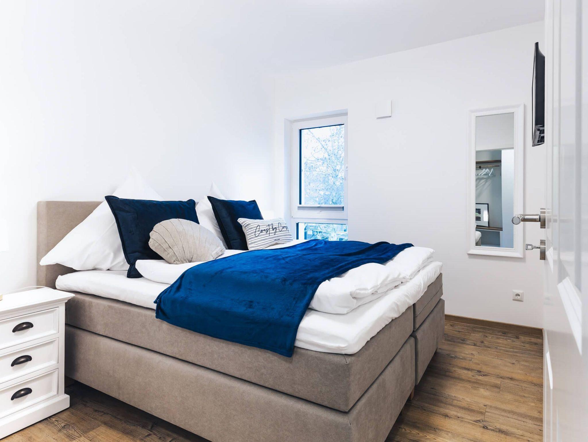 Die Ferienwohnung bietet zwei Schlafzimmer mit jeweils einem Boxspring-Doppelbett. Der geräumige Wohn- und Essbereich mit moderner und komplett ausgestatteter Küche ist offen gestaltet und lädt zu geselligen Stunden mit der Familie ein.