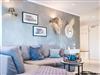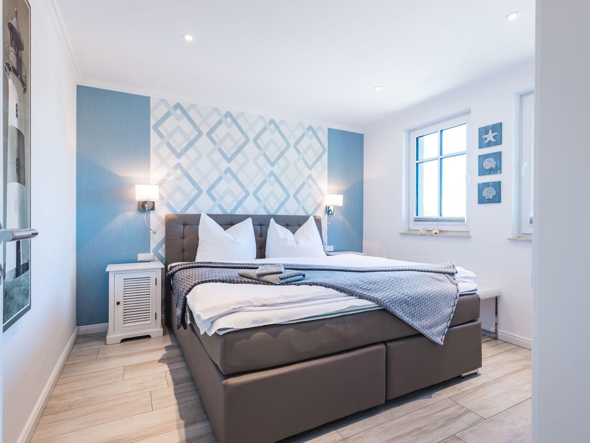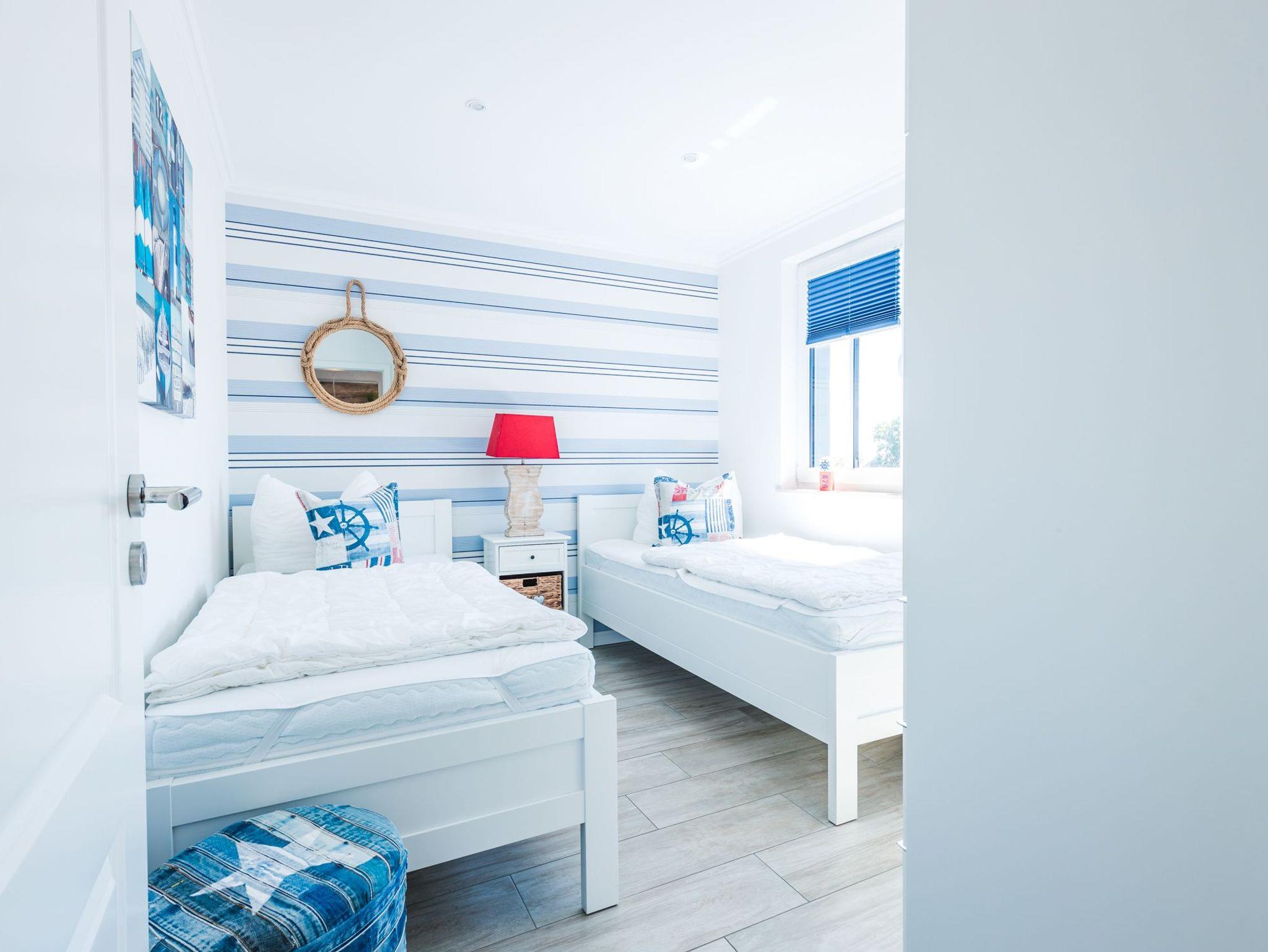 Das Schlafzimmer mit dem bequemen Boxspring-Doppelbett und maritimen Design ist mit einem zusätzlichem Fernseher ausgestattet. Das zweite Schlafzimmer mit zwei Einzelbetten verfügt ebenfalls über einen Fernseher.