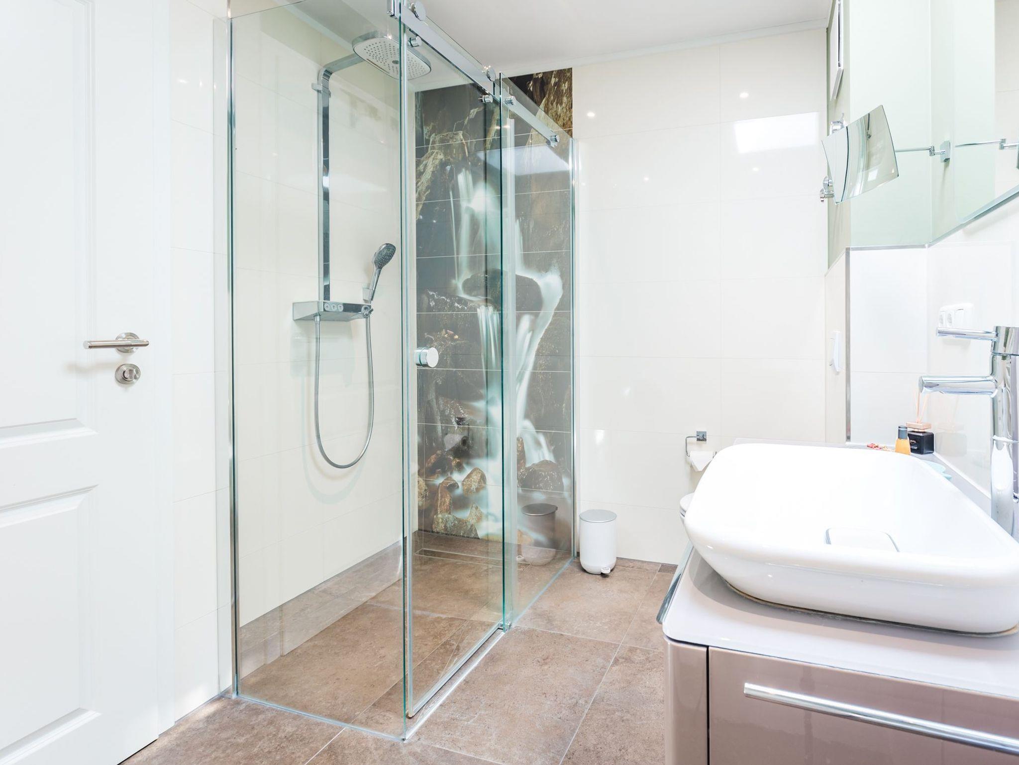 Das Bad ist geräumig mit Oberlicht und großer Regendusche und Kosmetikspiegel.