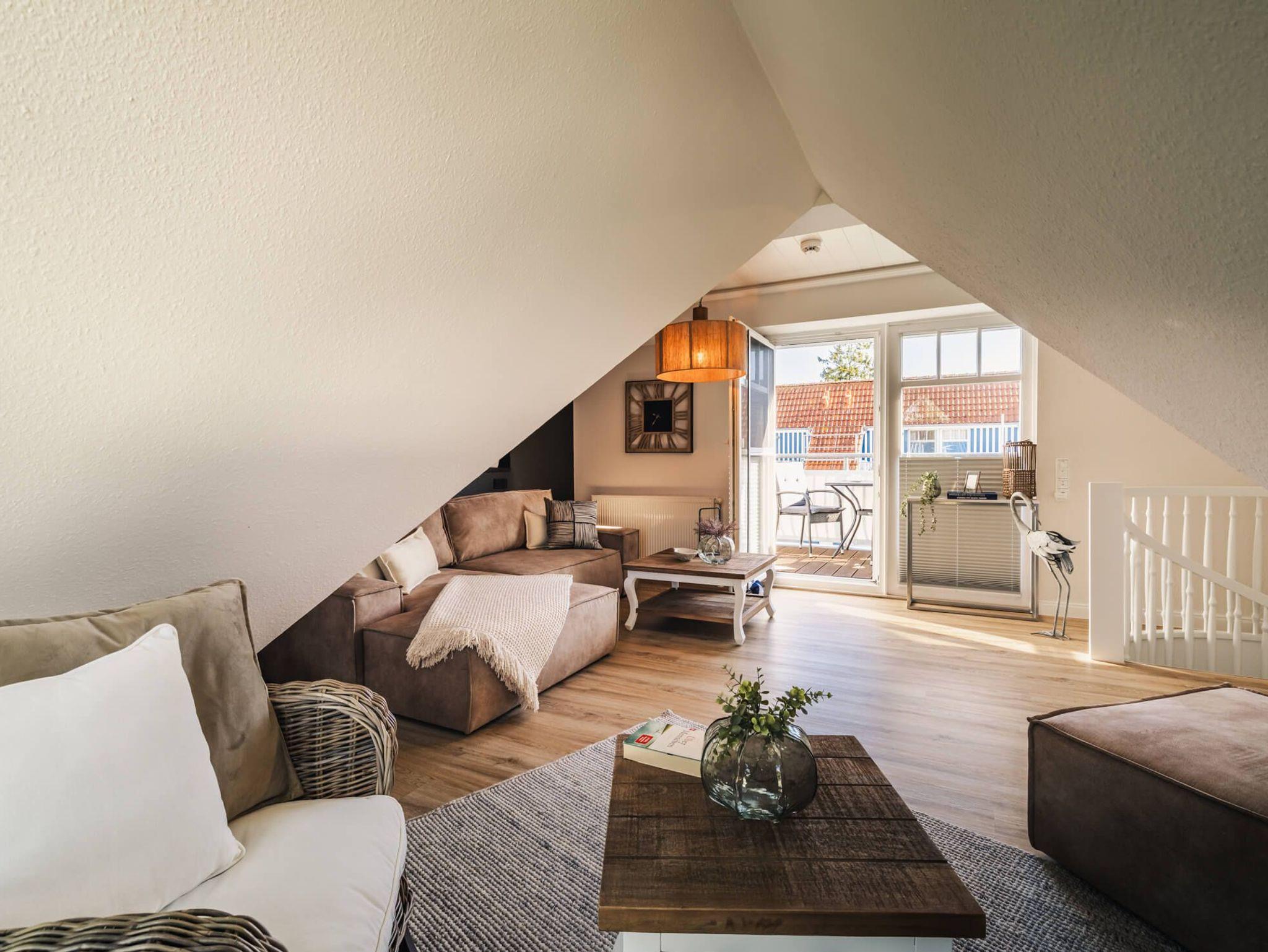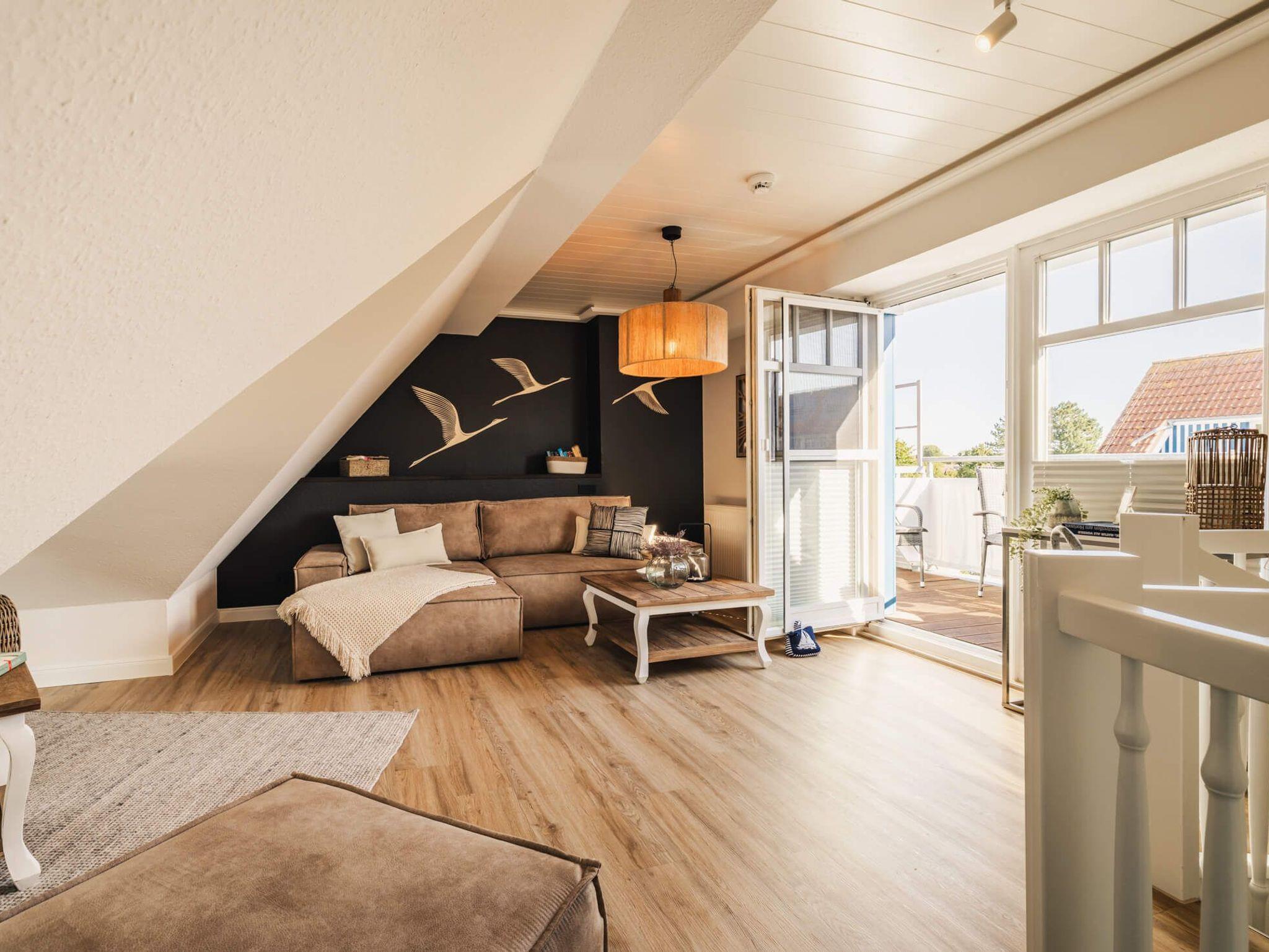 Über eine elegante Wendeltreppe gelangen Sie in den oberen Bereich der Wohnung, wo sich der helle und geräumige Wohnbereich befindet. Hier sorgt eine Aufbettung auf der bequemen Couch für zusätzliche Schlafplätze, die Flexibilität für größere Gruppen ermöglicht.