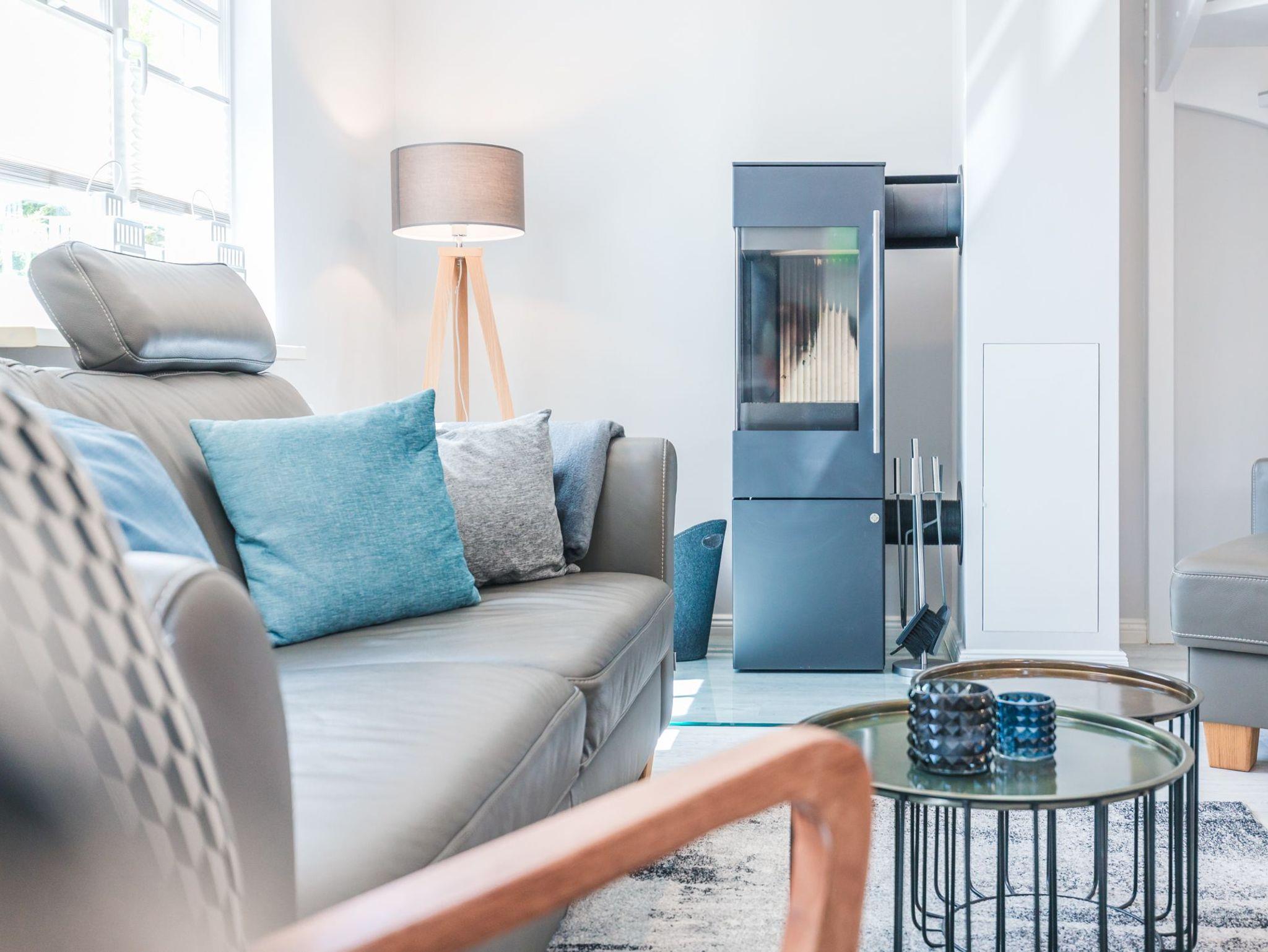 Im Wohnbereich lädt ein Kaminofen in der kalten Jahreszeit zum Verweilen ein. Auf einem gemütlichen Sofa und Sesseln können Sie gemeinsam die Zeit genießen. Dazu ermöglicht Ihnen ein großer Smart -TV zeitgemäßes Entertainment.